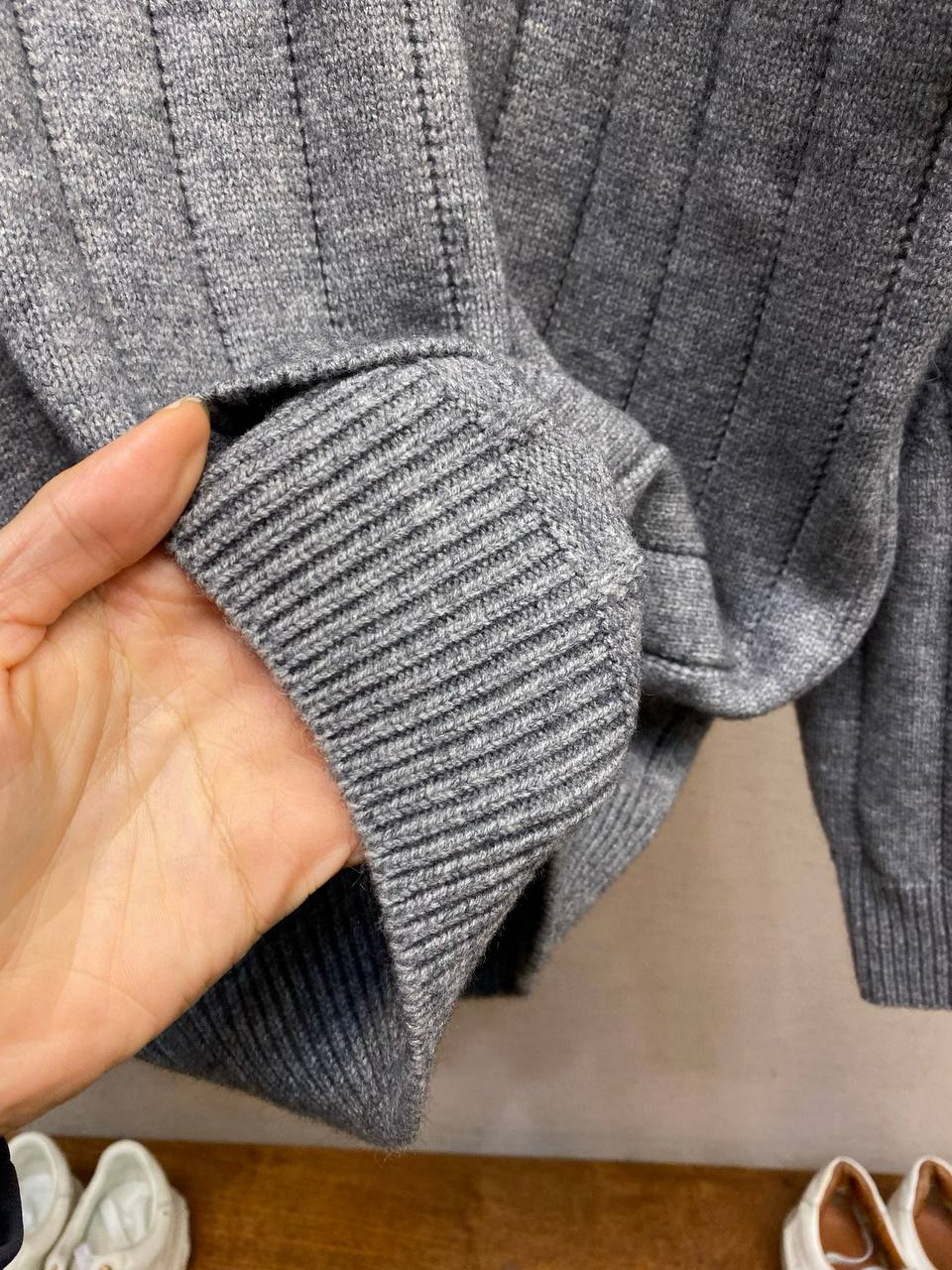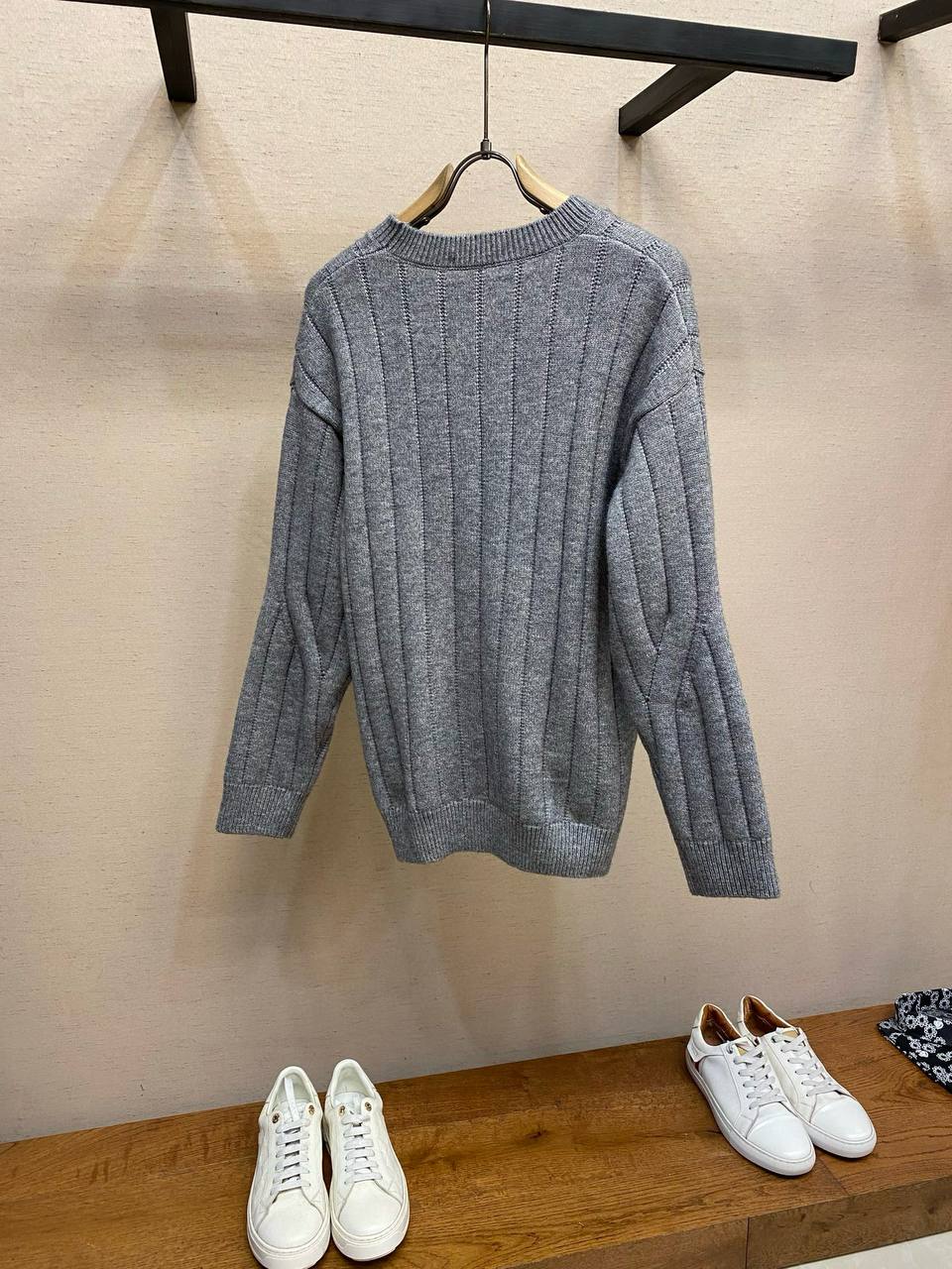 Мужской свитер CELINE из шерсти — элегантный повседневный элемент гардероба, выполненный в минималистичном стиле бренда. Универсальный меланжево‑серый оттенок и вертикальная ребристая вязка создают сдержанную, но выразительную фактуру, а небольшая эмблема на груди добавляет фирменной аккуратности.