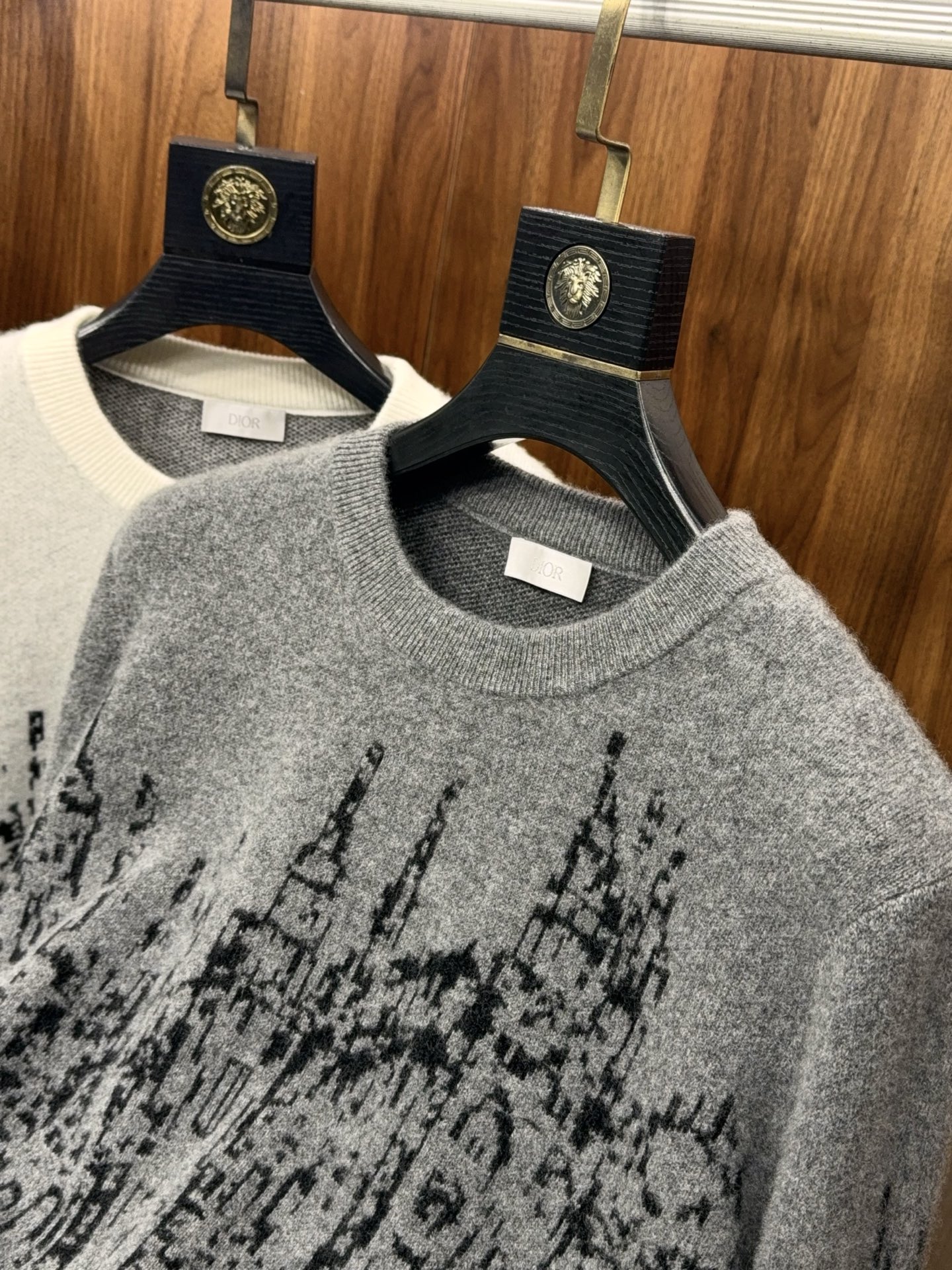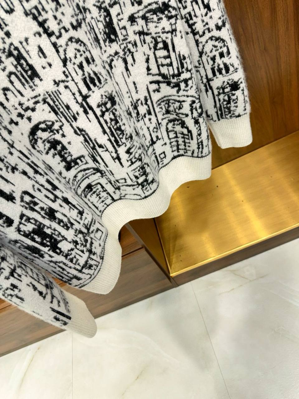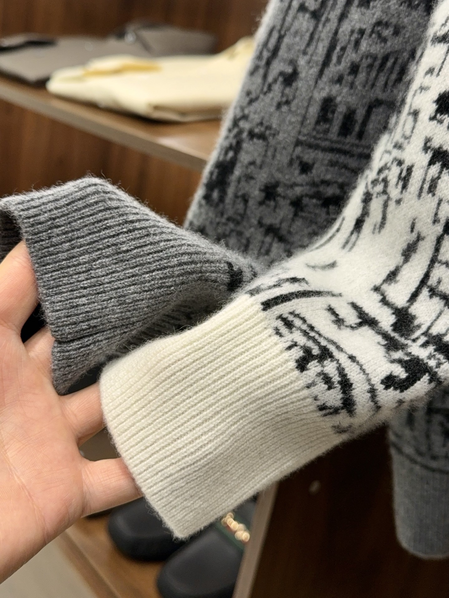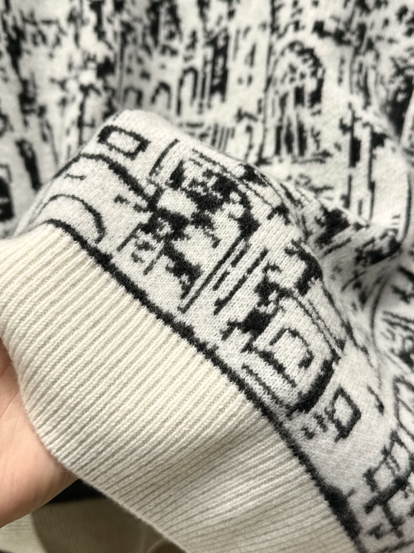 • Отделка: широкие ребристые манжеты и низ свитера, аккуратные швы, маленькая бренд‑этикетка DIOR на внутренней стороне воротника.