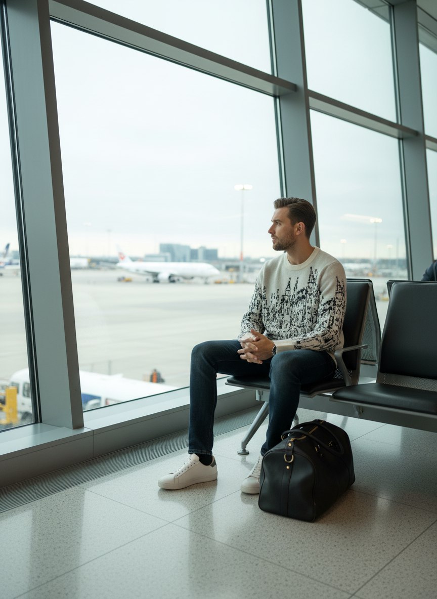 • Дизайн: сложный жаккардовый рисунок в виде архитектурного/городского пейзажа, покрывающий перед и частично рукава; декоративный мотив придает изделию художественную глубину и визуальную текстуру.