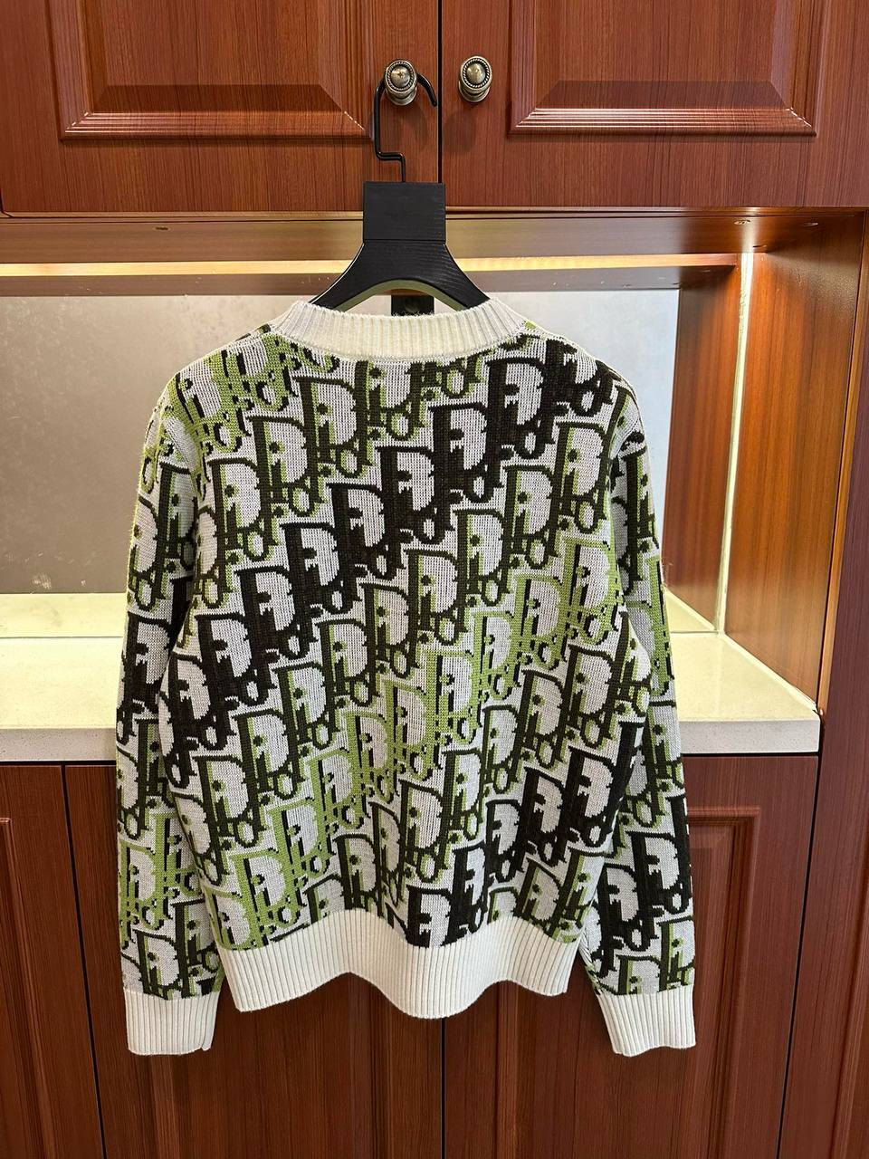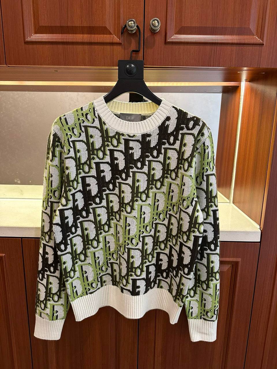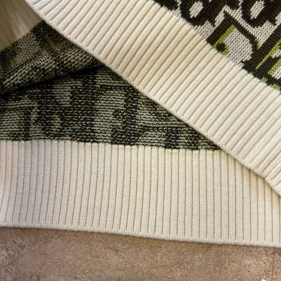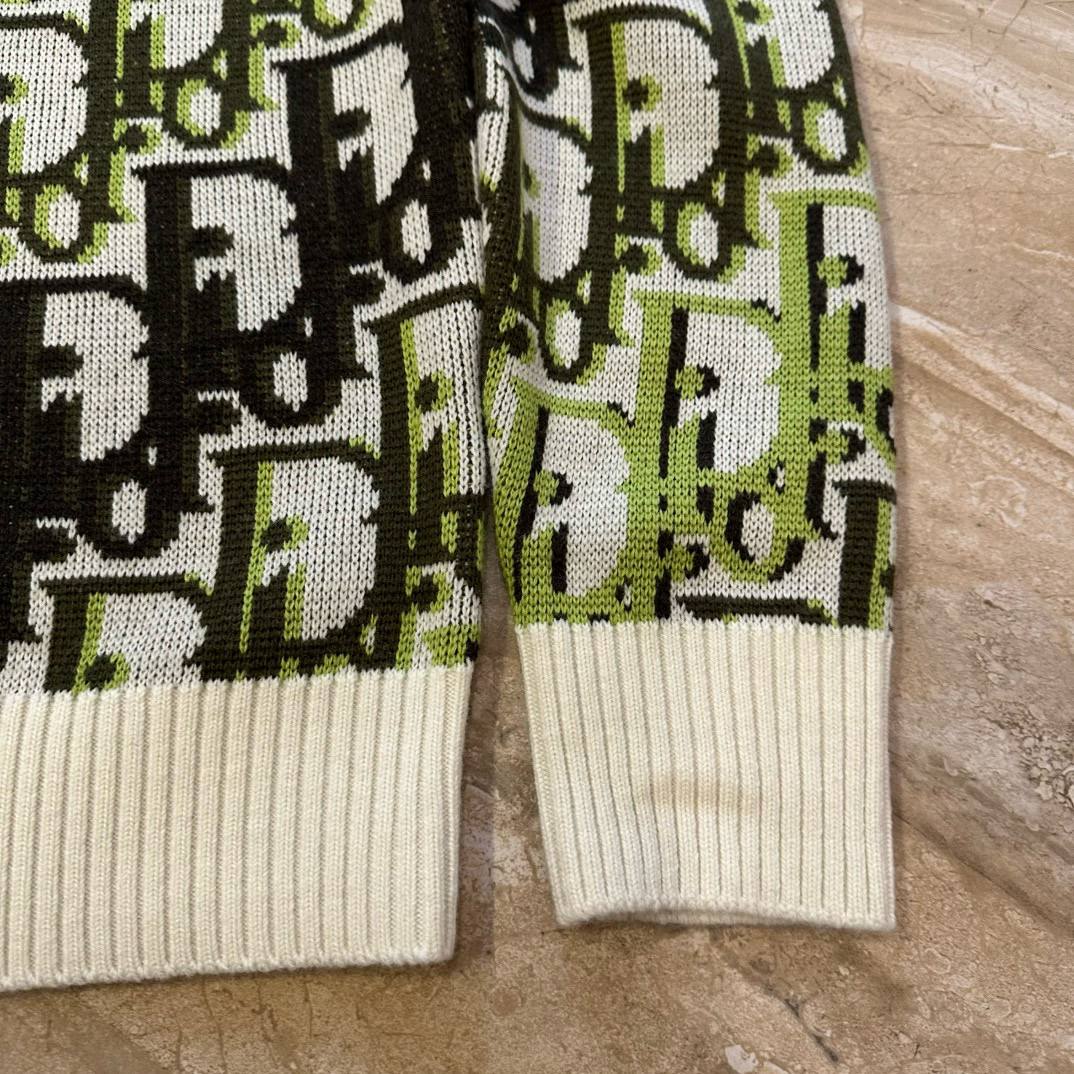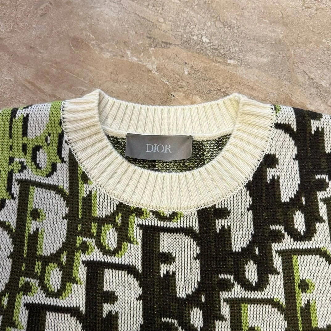 Свитер представляет собой плотный жаккардовый трикотаж с выразительным повторяющимся мотивом в стиле Oblique/логотип Dior. Модель имеет классический круглый вырез с широкими рифлёными манжетами на рукавах и по нижнему краю изделия. Силуэт — прямой, слегка свободный, длина по бедру. Контрастная цветовая гамма делает изделие эффектным, но в то же время универсальным для сочетаний с брюками и джинсами. На внутренней горловине видна бренд‑метка DIOR.