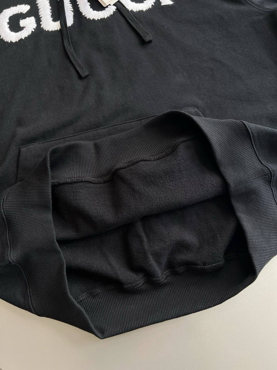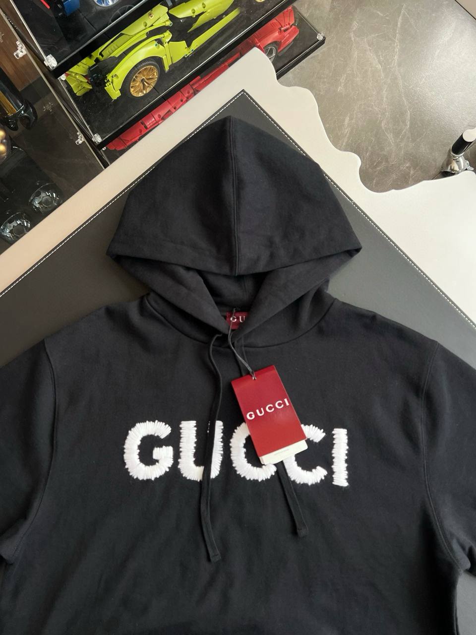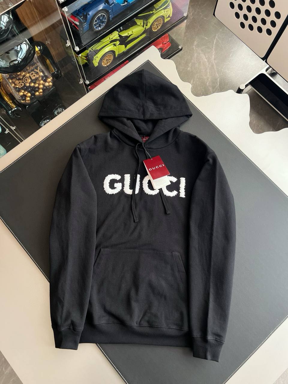 Стильная мужская толстовка от GUCCI выполнена в классическом черном цвете, который идеально сочетается с любыми элементами гардероба. Модель изготовлена из высококачественного, мягкого хлопка, обеспечивающего максимальный комфорт и долговечность. На груди располагается узнаваемый фирменный логотип GUCCI, выполненный крупными белыми буквами в пушистой текстуре, что придает толстовке уникальный и модный вид.