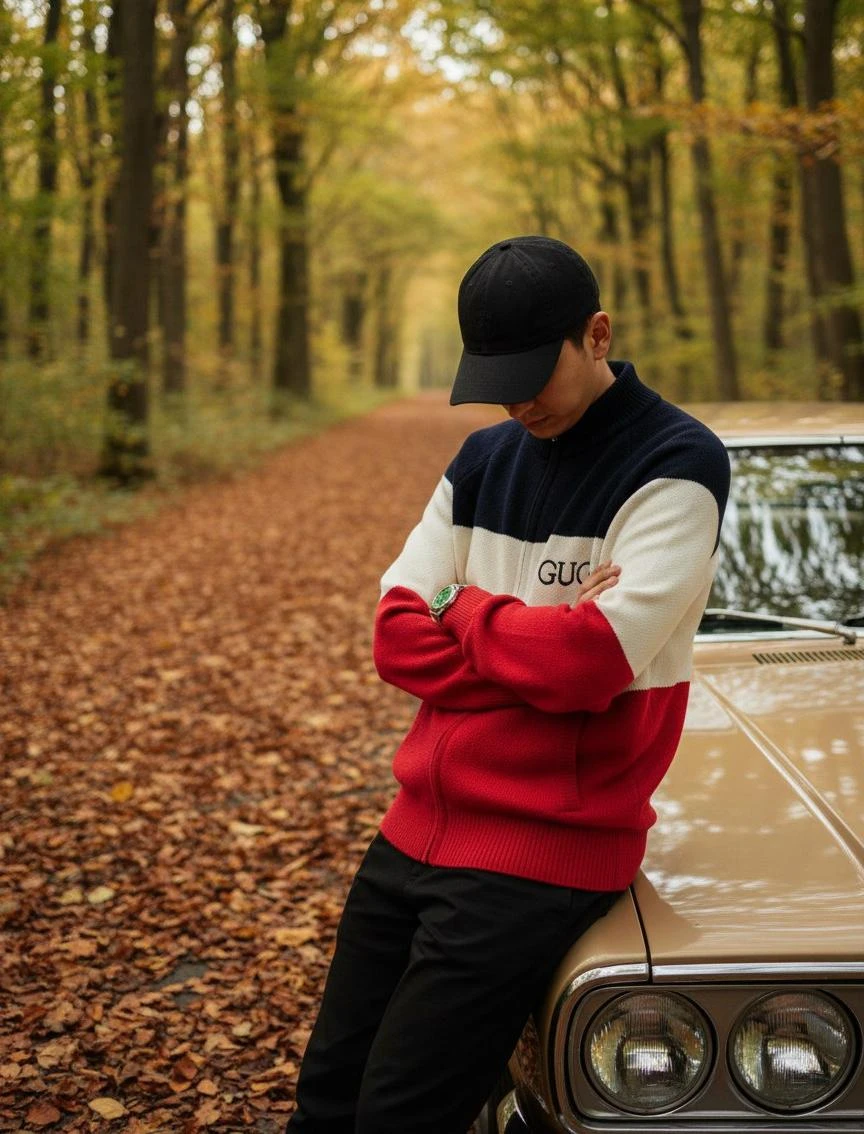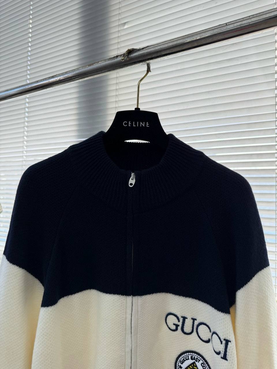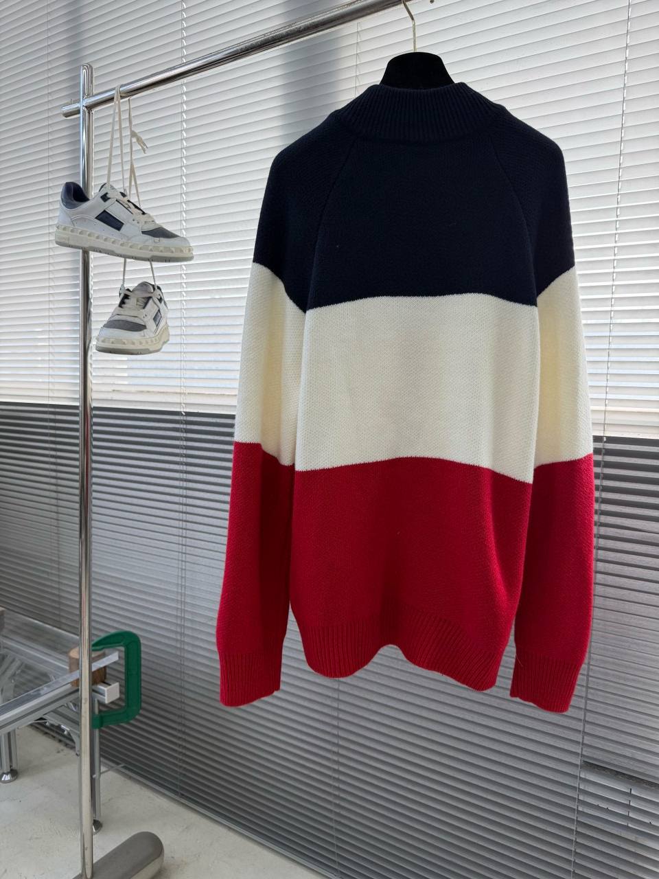 Мужской кардиган GUCCI из натуральной шерсти — элегантная и комфортная модель для повседневного и городского гардероба. По фото видно, что кардиган выполнен в характерной для бренда спокойной, но заметной цветовой гамме: широкие горизонтальные блоки тёмно‑синего, кремово‑белого и насыщенно‑красного оттенков. Модель застёгивается на центральную молнию и дополнена высоким ребристым воротником‑стойкой, который мягко защищает шею и придаёт изделию структурированный вид.