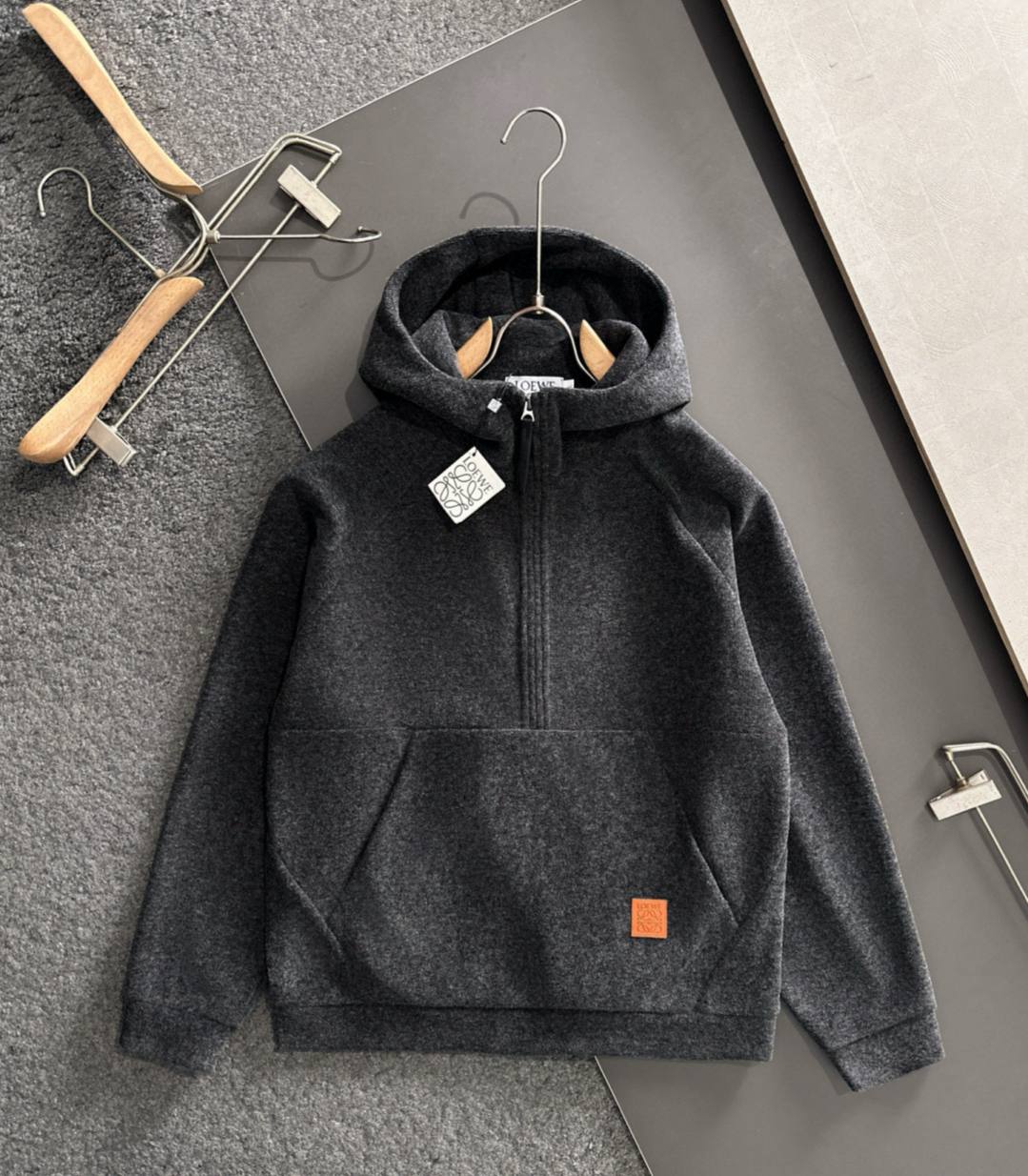 Современная мужская толстовка LOEWE в спокойном светло‑сером оттенке. Полупуловер с удлинённым воротником‑капюшоном и короткой центральной молнией, выполнен из плотного, формы держащегося материала. Лаконичный минималистичный дизайн с характерной кожаной нашивкой‑анограммой LOEWE внизу кармана.
