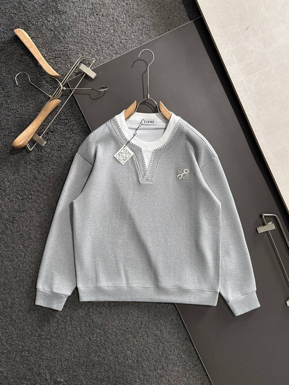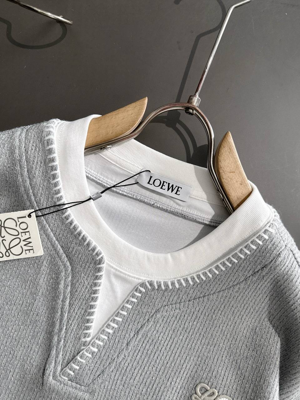• Брендинг: аккуратная тон в тон вышивка логотипа Anagram слева на груди и бирка LOEWE у горловины.