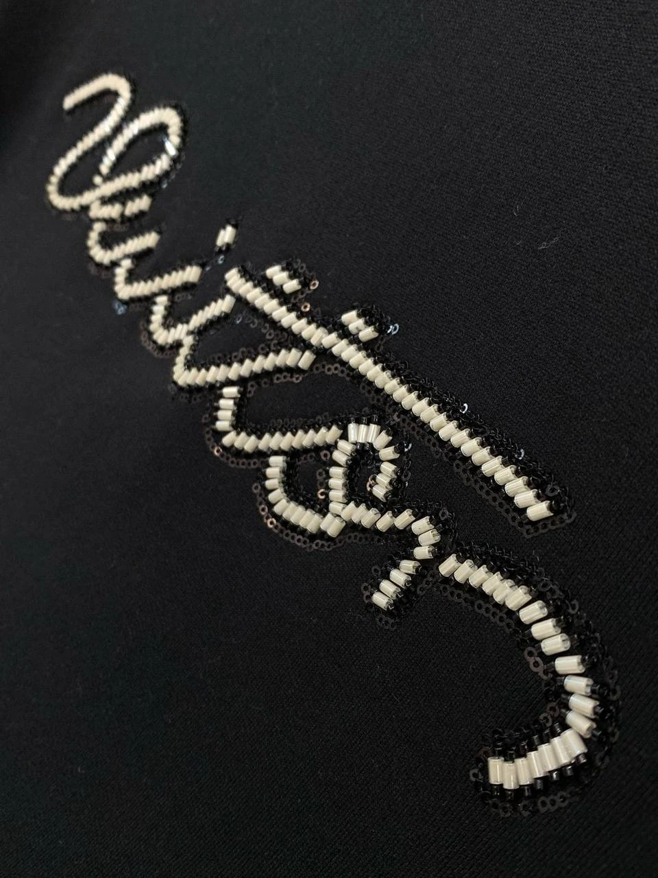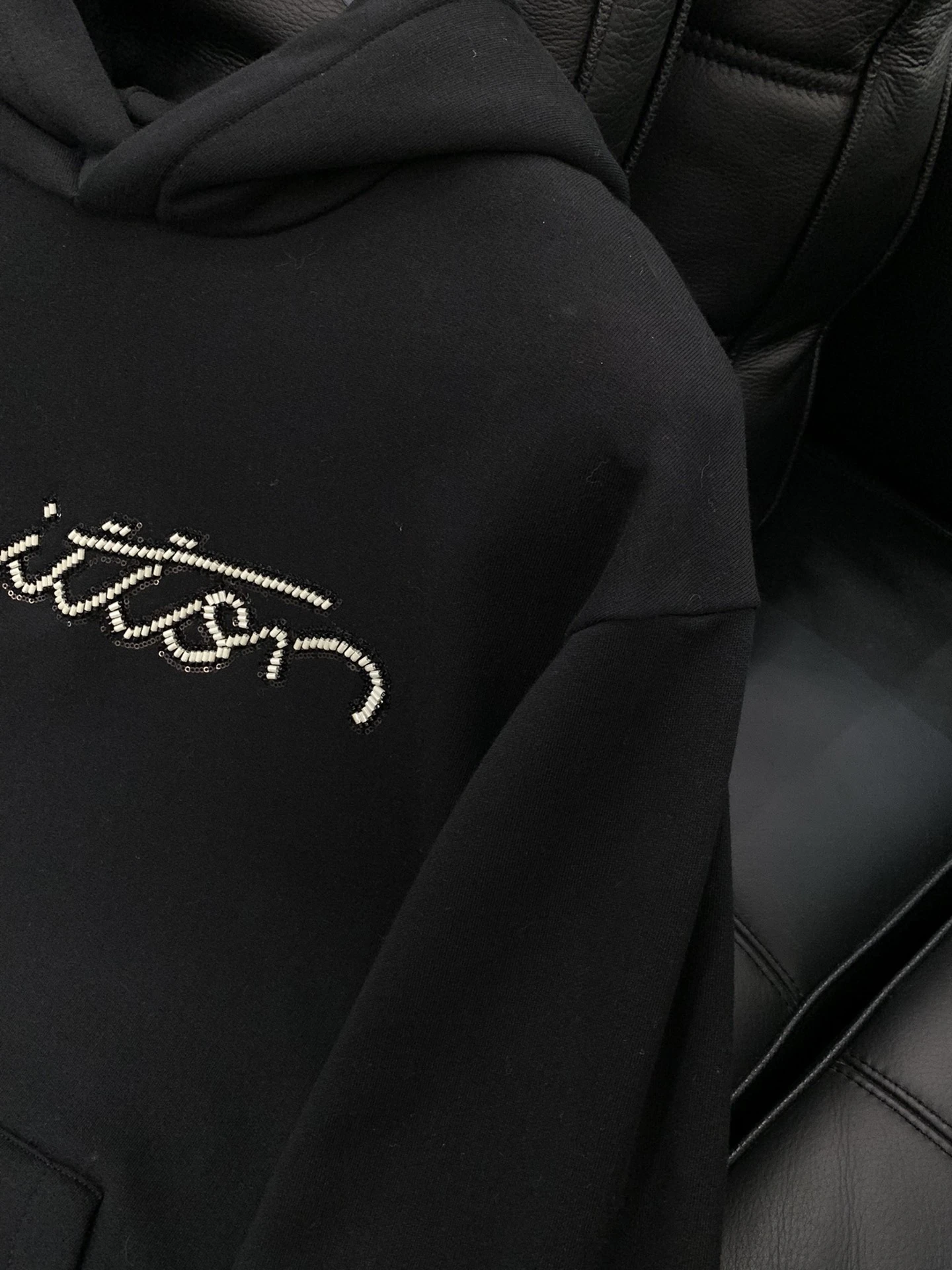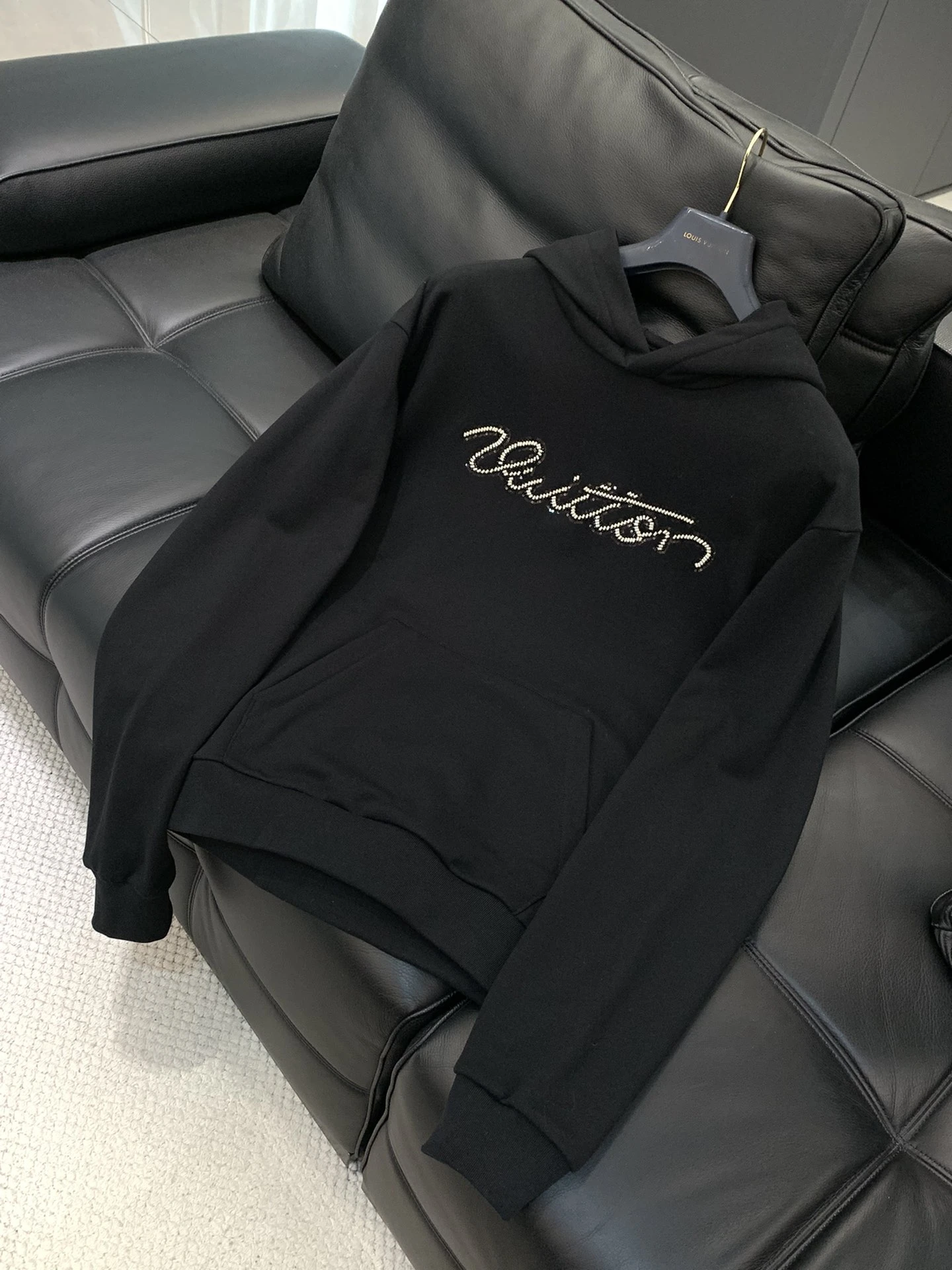 • Дизайн: строгий, лаконичный крой с капюшоном классической формы. Центральный декоративный элемент — рукописная надпись «Vuitton», инкрустированная мелкими кристаллами/стразами, которая придает модели акцент и благородный блеск.