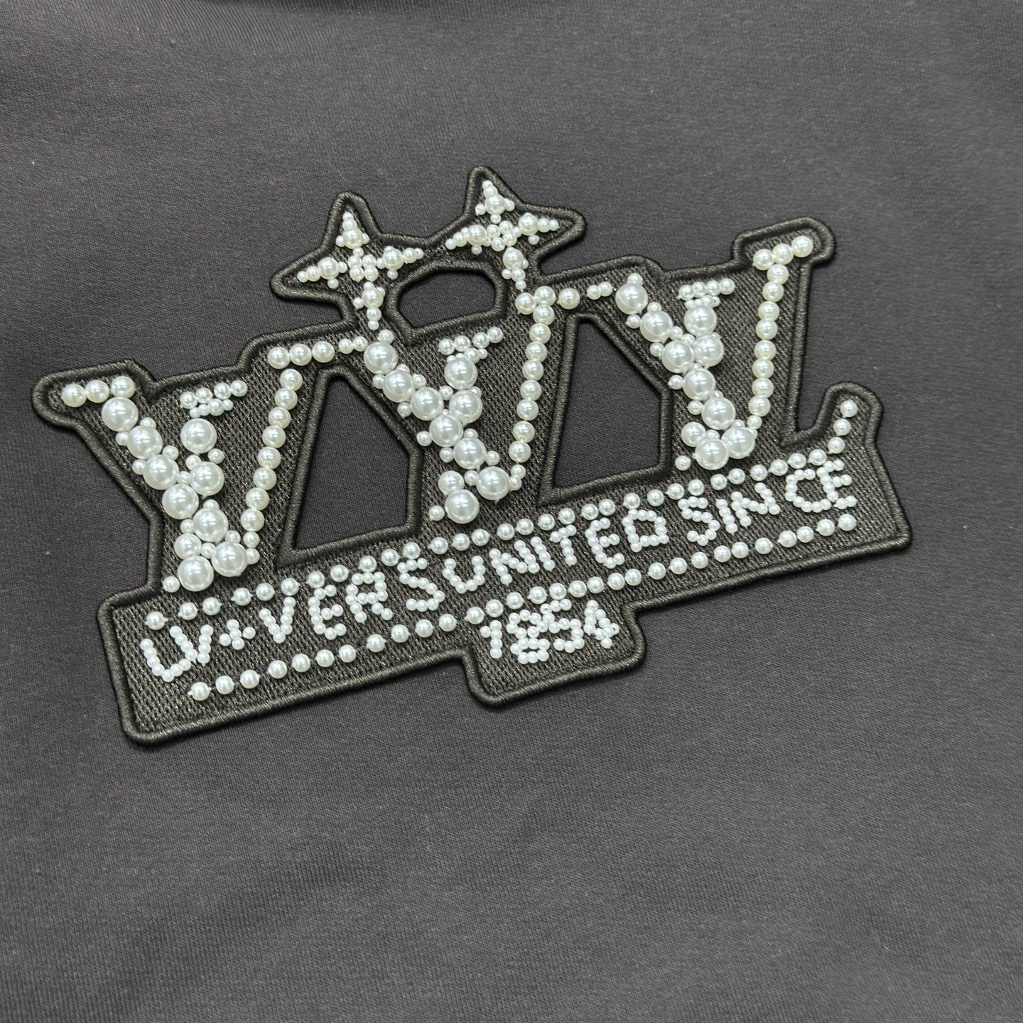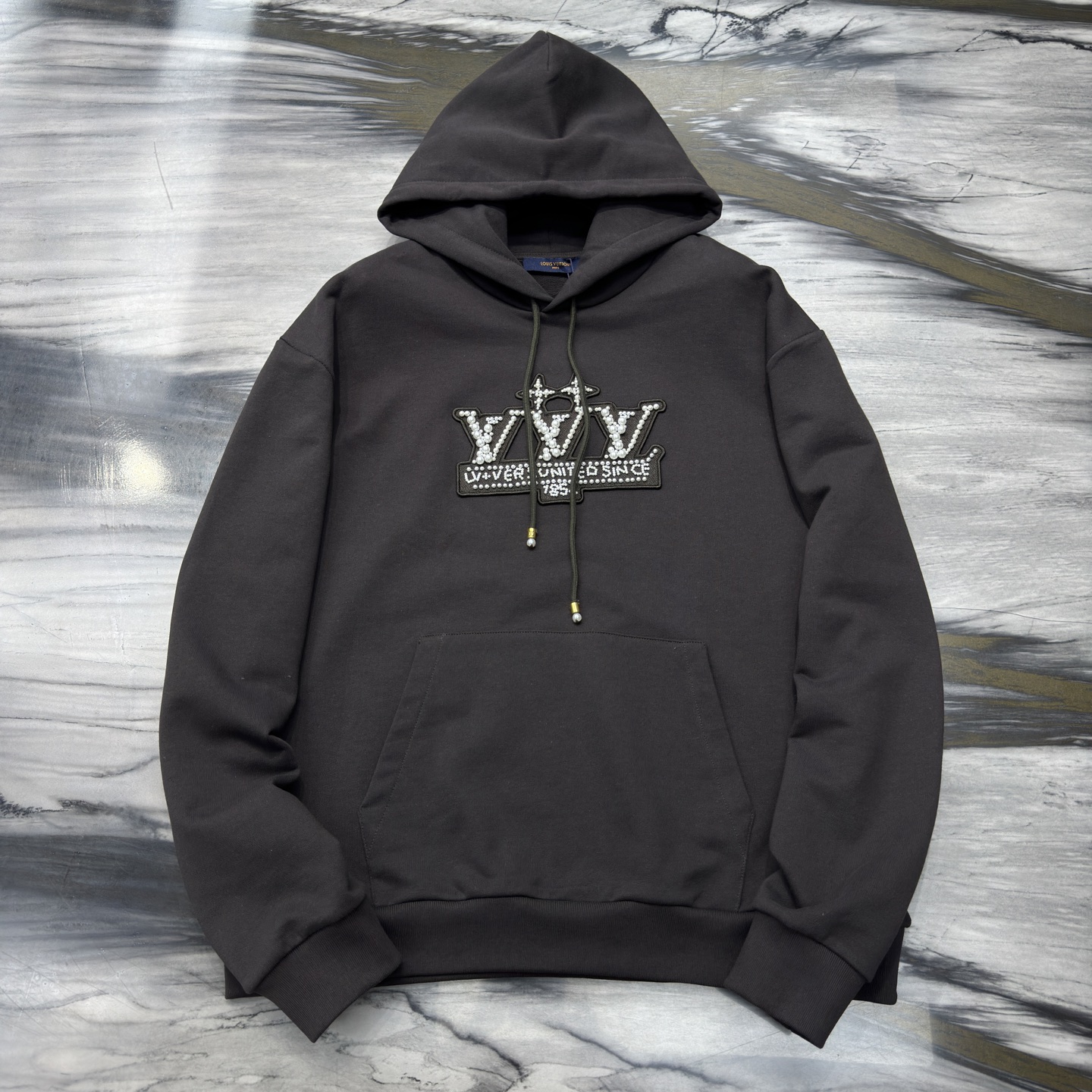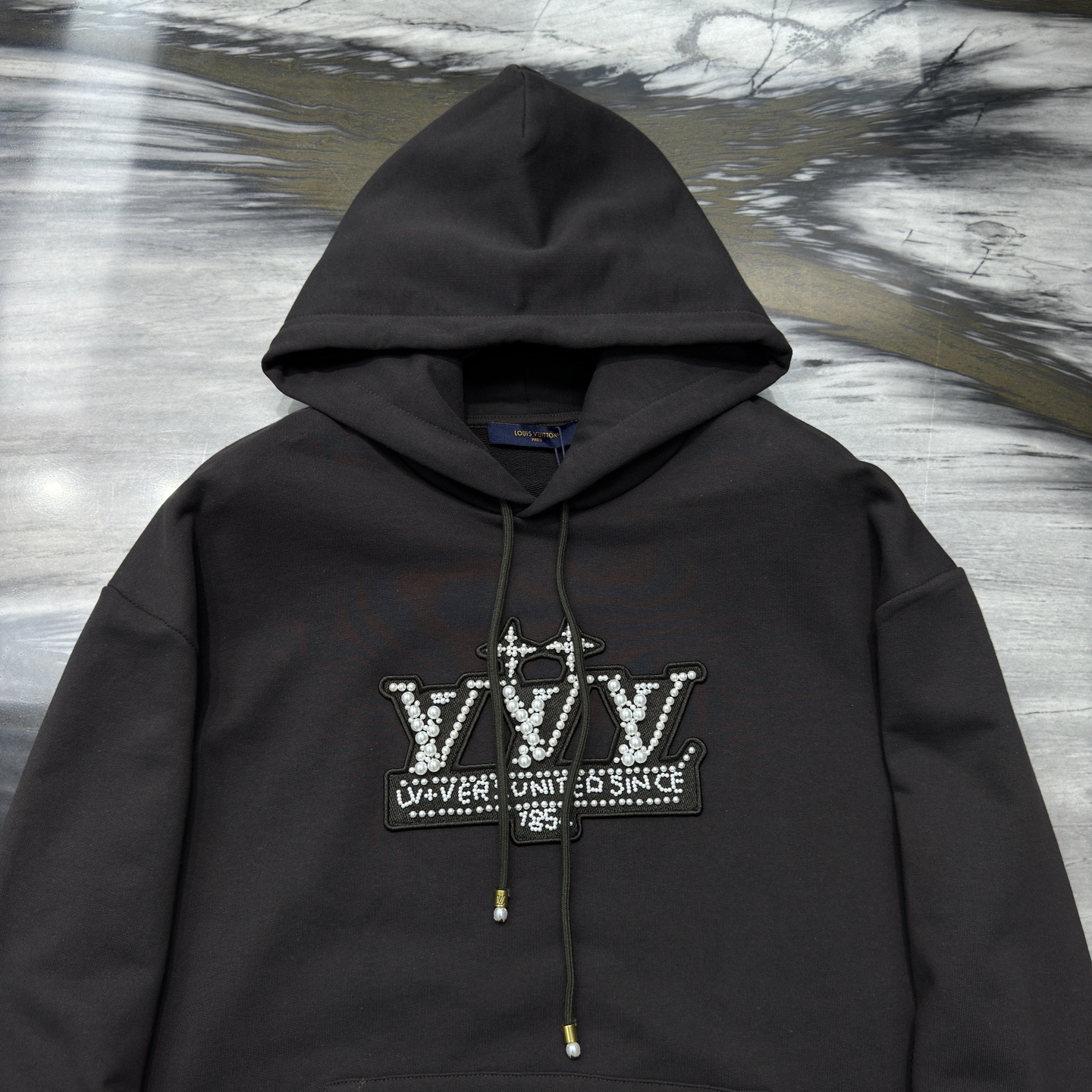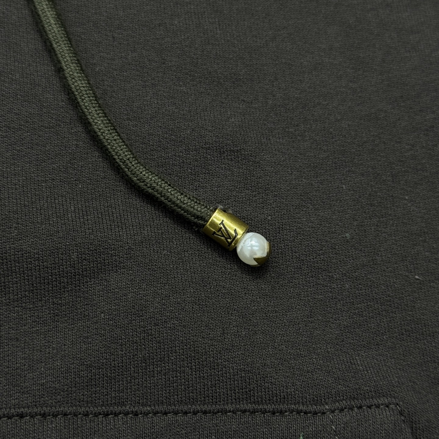 Эта толстовка с капюшоном станет отличным выбором для любителей спортивного стиля. Хлопковый материал обеспечивает комфорт и тепло, а нашивка из смоляных бусин добавляет уникальности и оригинальности дизайну. Логотип LV Vers United подчеркивает современность и актуальность коллекции. Концы шнурка с ювелирной отделкой придают изделию изысканный вид, делая его идеальным элементом для создания стильного и удобного повседневного образа.