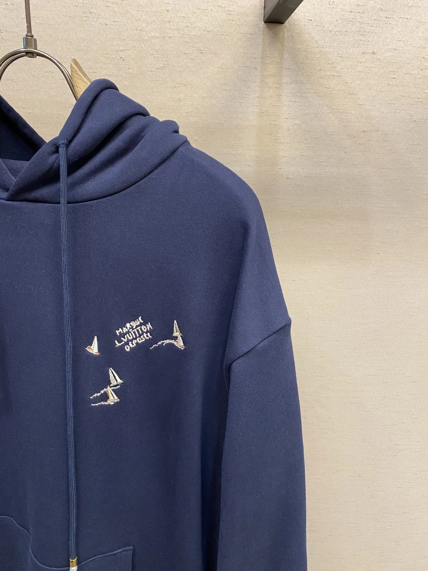 Мужское худи Louis Vuitton выполнено в стильном тёмно-синем цвете. Модель украшена минималистичным принтом с фирменным логотипом бренда, а также изображениями силуэтов парусников на груди и рядом с карманом-кенгуру.
