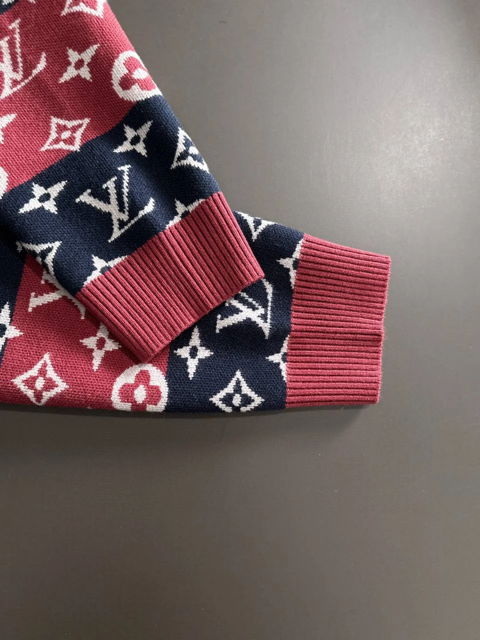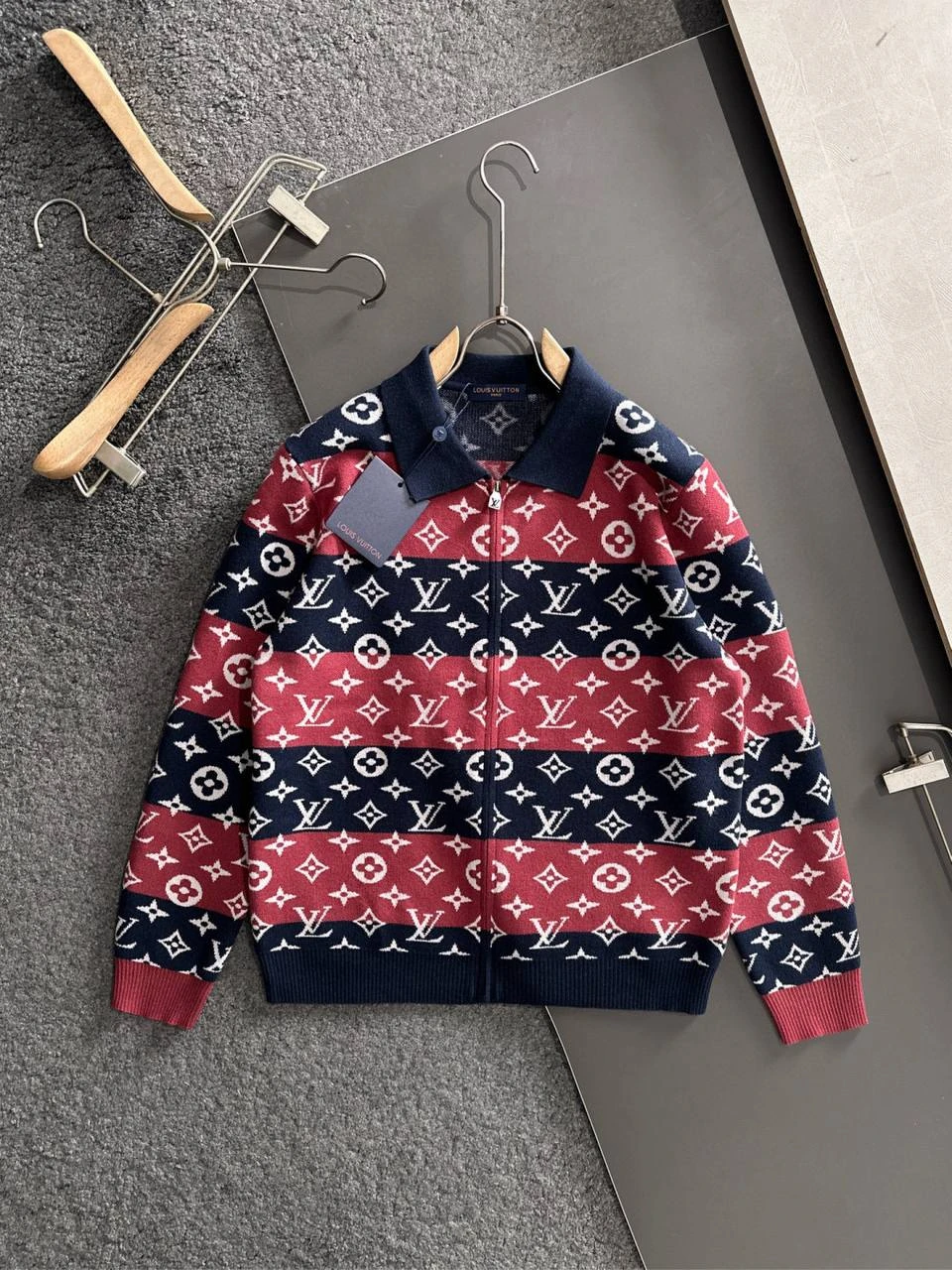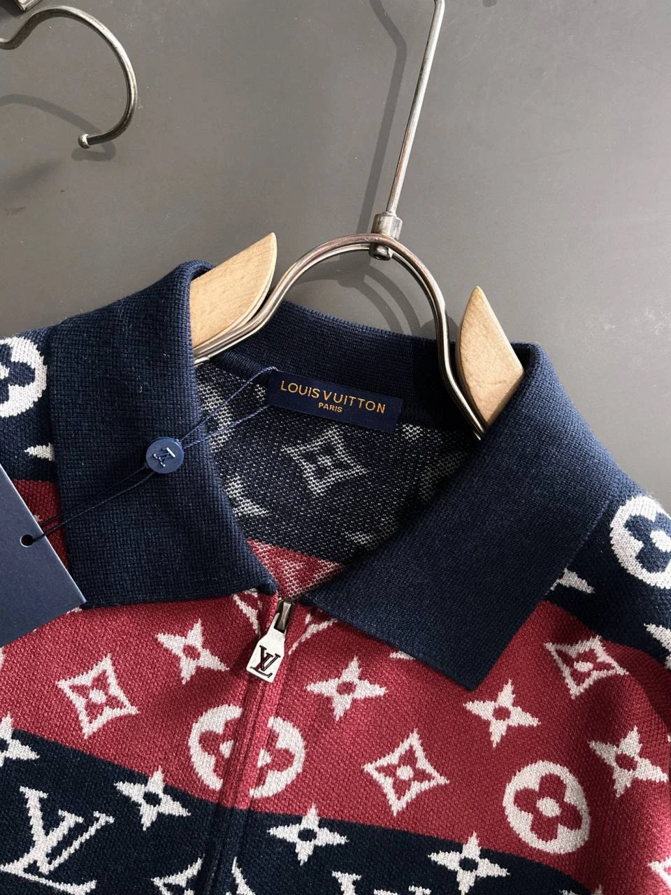 Кардиган на молнии из плотного трикотажа с характерным жаккардовым узором — чередующиеся полосы бордового и тёмно‑синего цвета, инкрустированные белыми элементами фирменной монограммы. Сдержанная, но выразительная модель в стиле luxury casual: тепло, комфортно и легко сочетается с повседневным гардеробом.