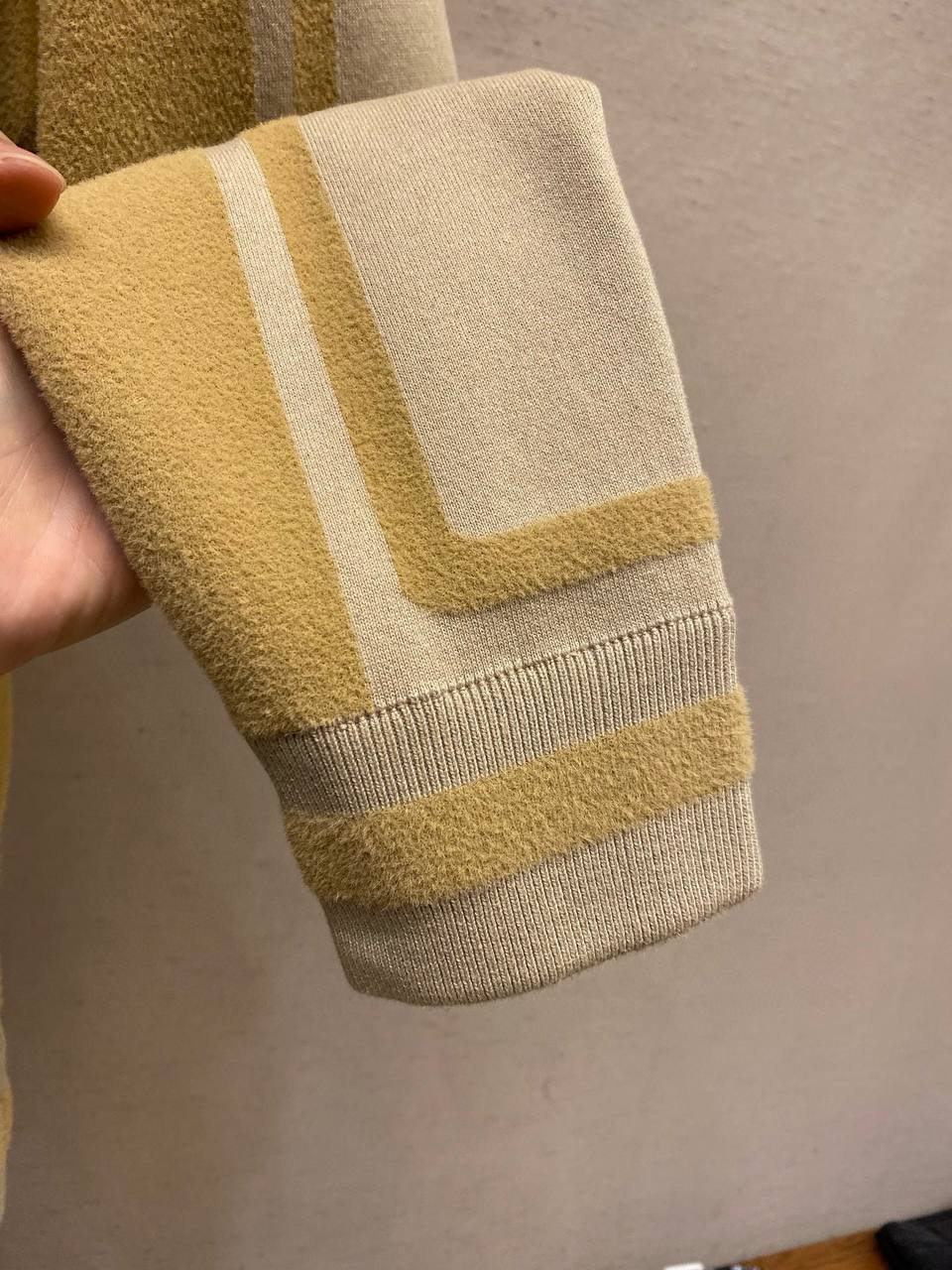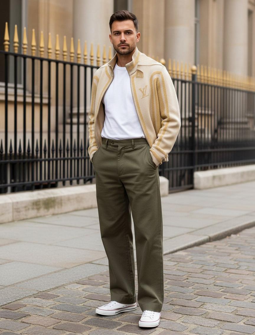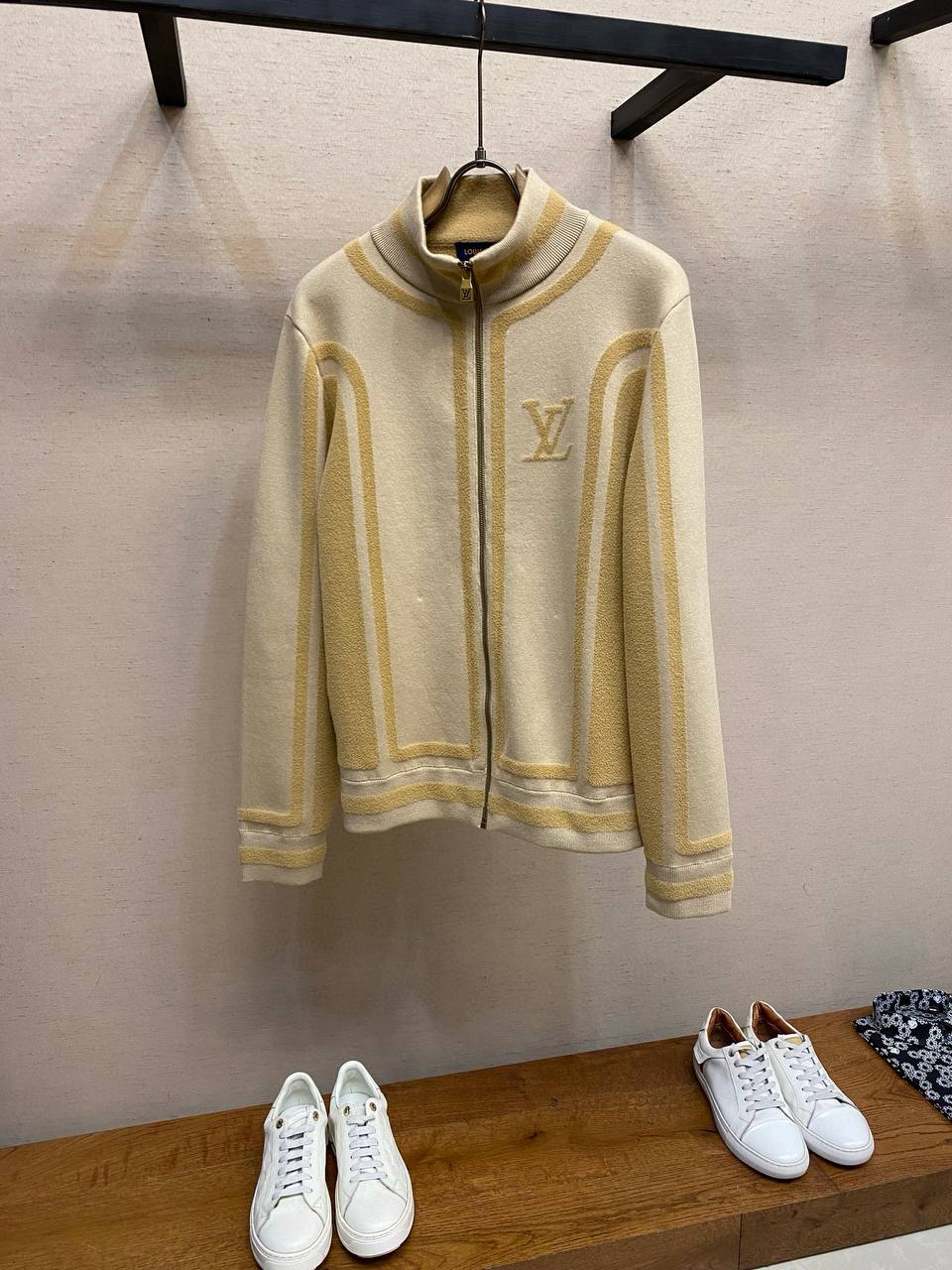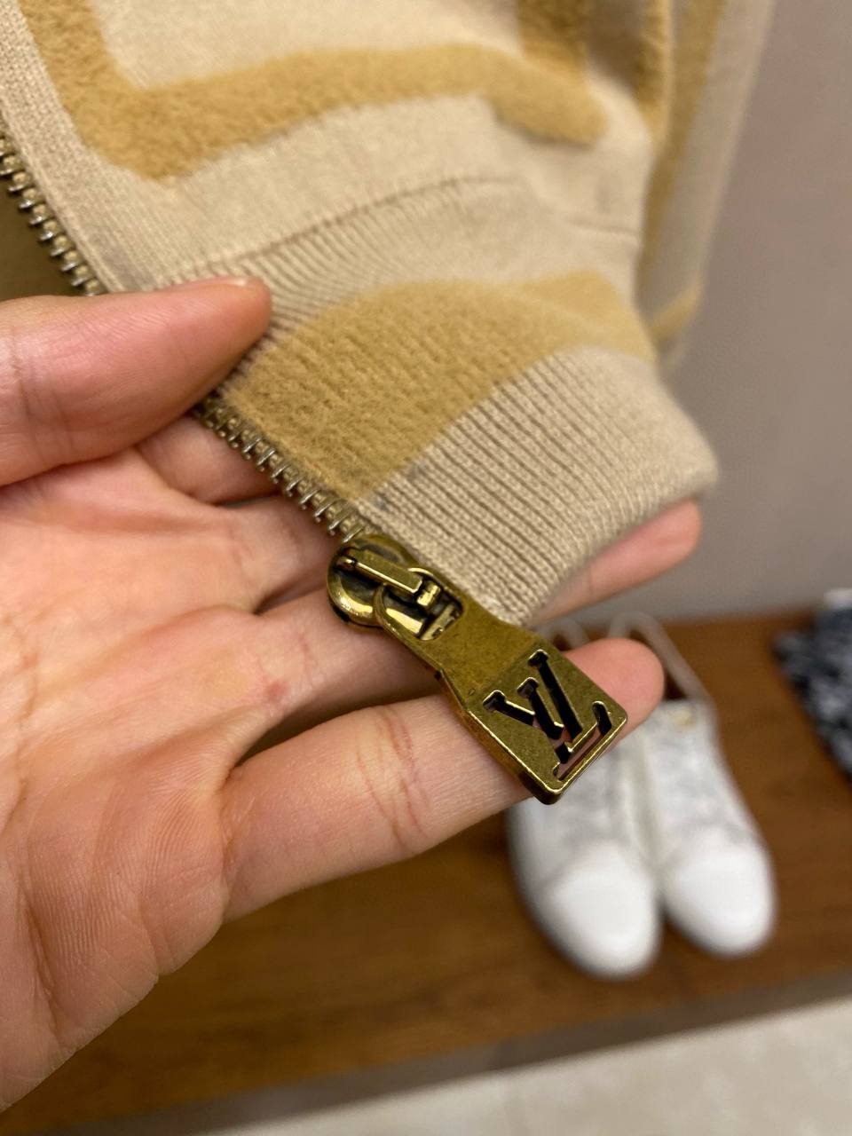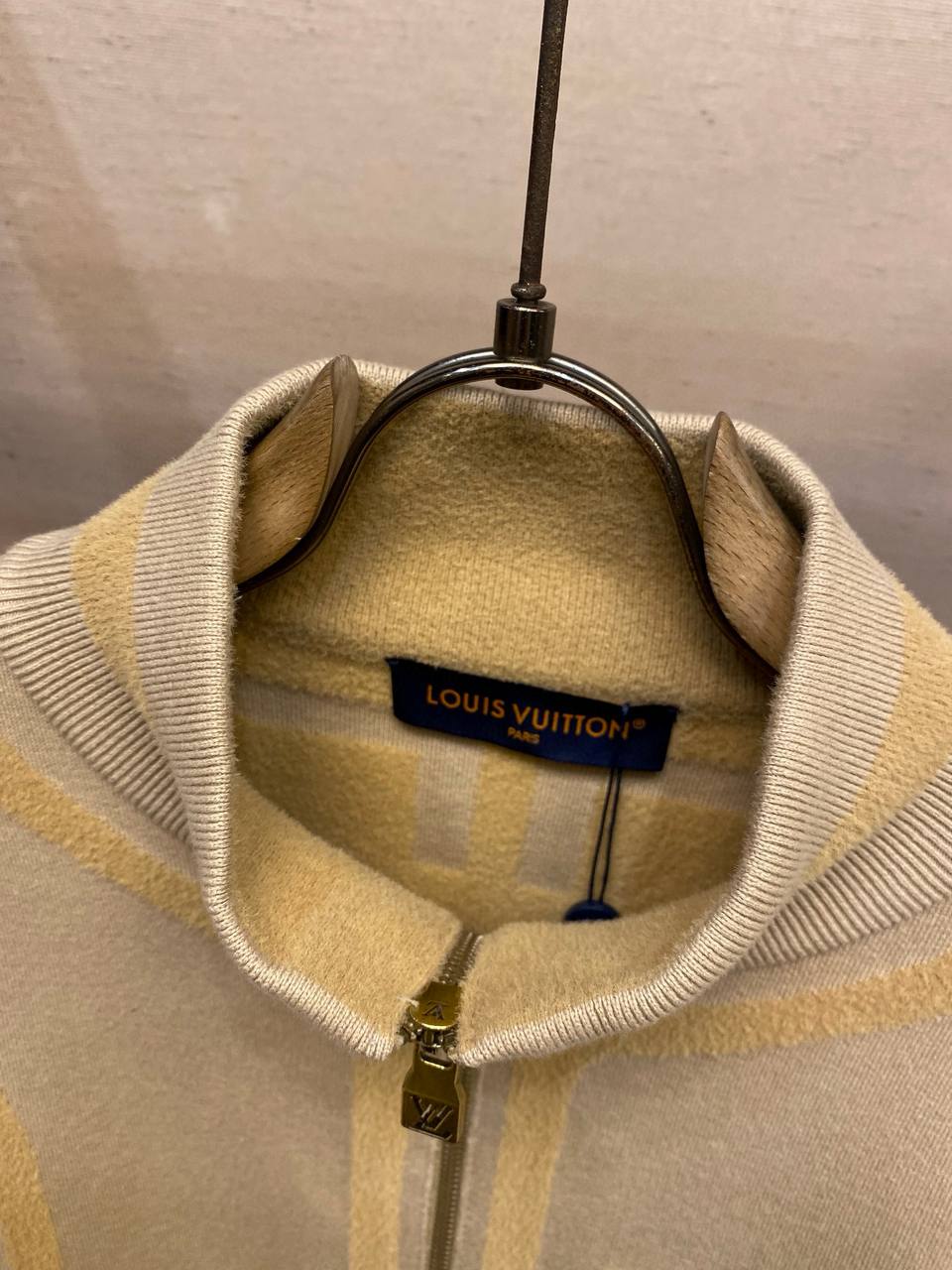 Элегантный мужской кардиган LOUIS VUITTON в спокойной бежево‑кремовой гамме — идеальный выбор для повседневного образа и спокойной городской элегантности. Модель выполнена в мягком фактурном трикотаже, с центральной металлической застежкой‑молнией и аккуратным логотипом LV на груди.