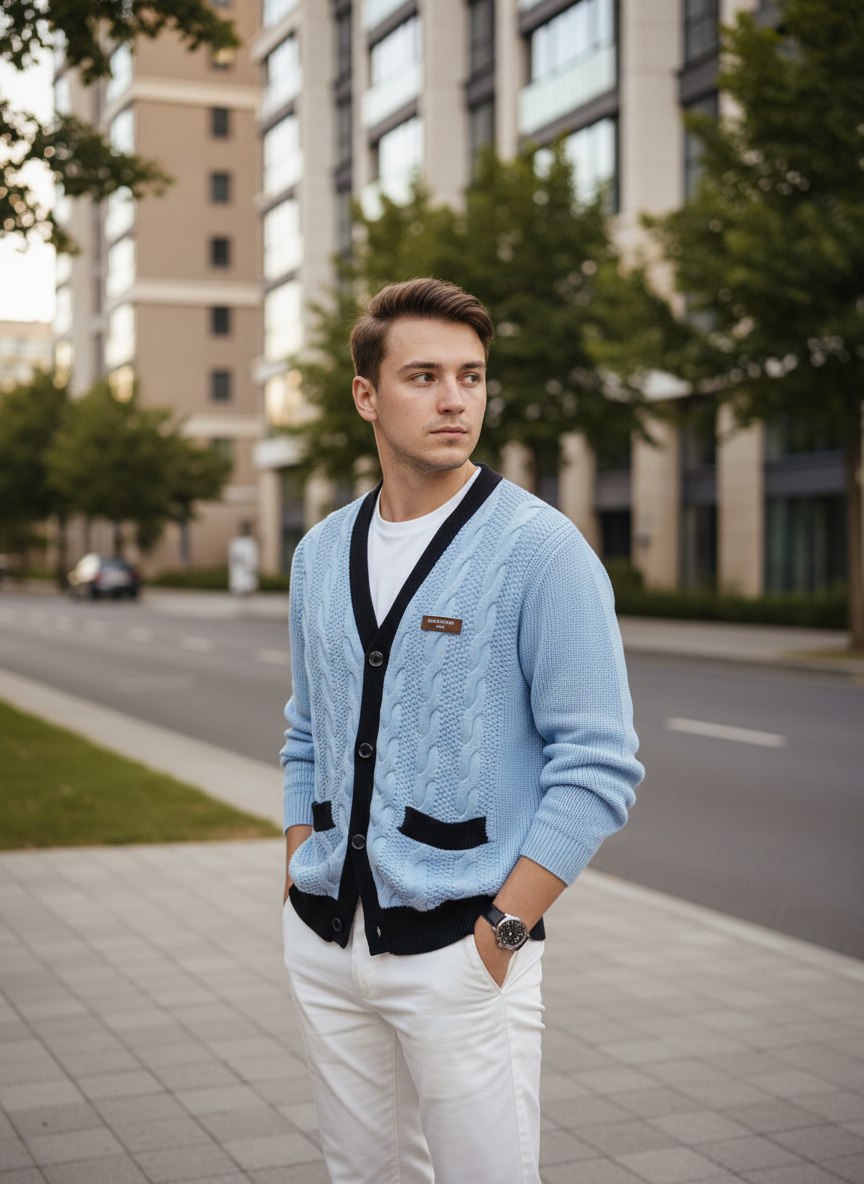 Стильный мужской кардиган Louis Vuitton в мягком вязаном исполнении — сочетание классической фактуры «косы» и современных контрастных деталей. Универсальная модель для городского гардероба: эффектно смотрится как с повседневными джинсами и кедами, так и в более аккуратных образах с чиносами и рубашкой.