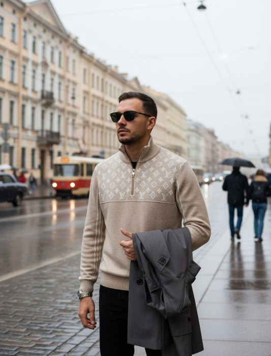 Элегантный мужской пуловер LOUIS VUITTON в светло‑бежевой гамме с узнаваемым жаккардовым узором Monogram в верхней части. Модель на короткой металлической молнии, сочетает в себе классическую сдержанность и современный спортивный характер, легко вписывается в городской гардероб.