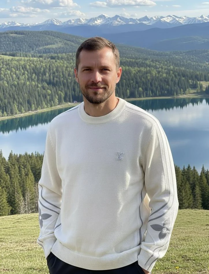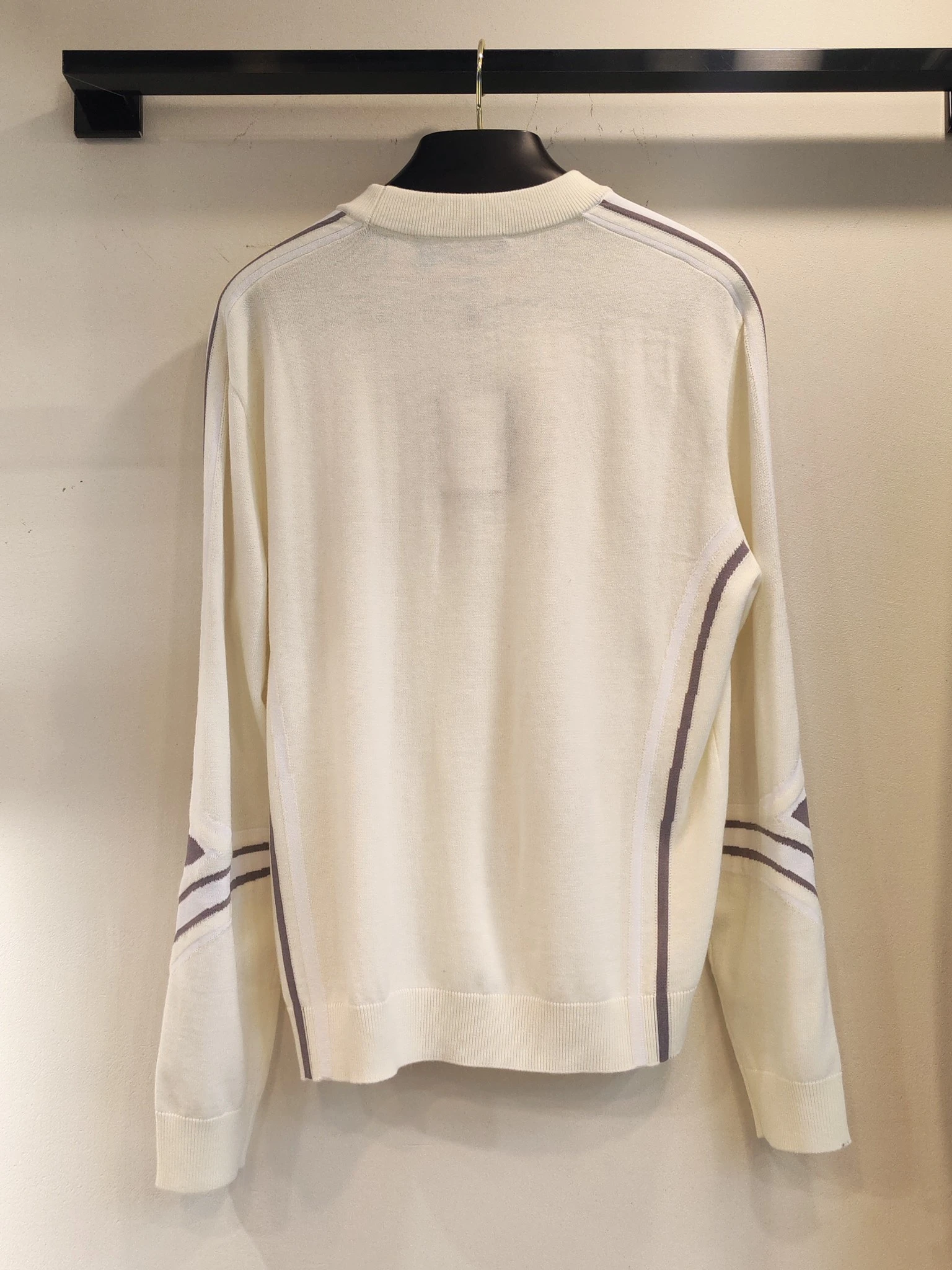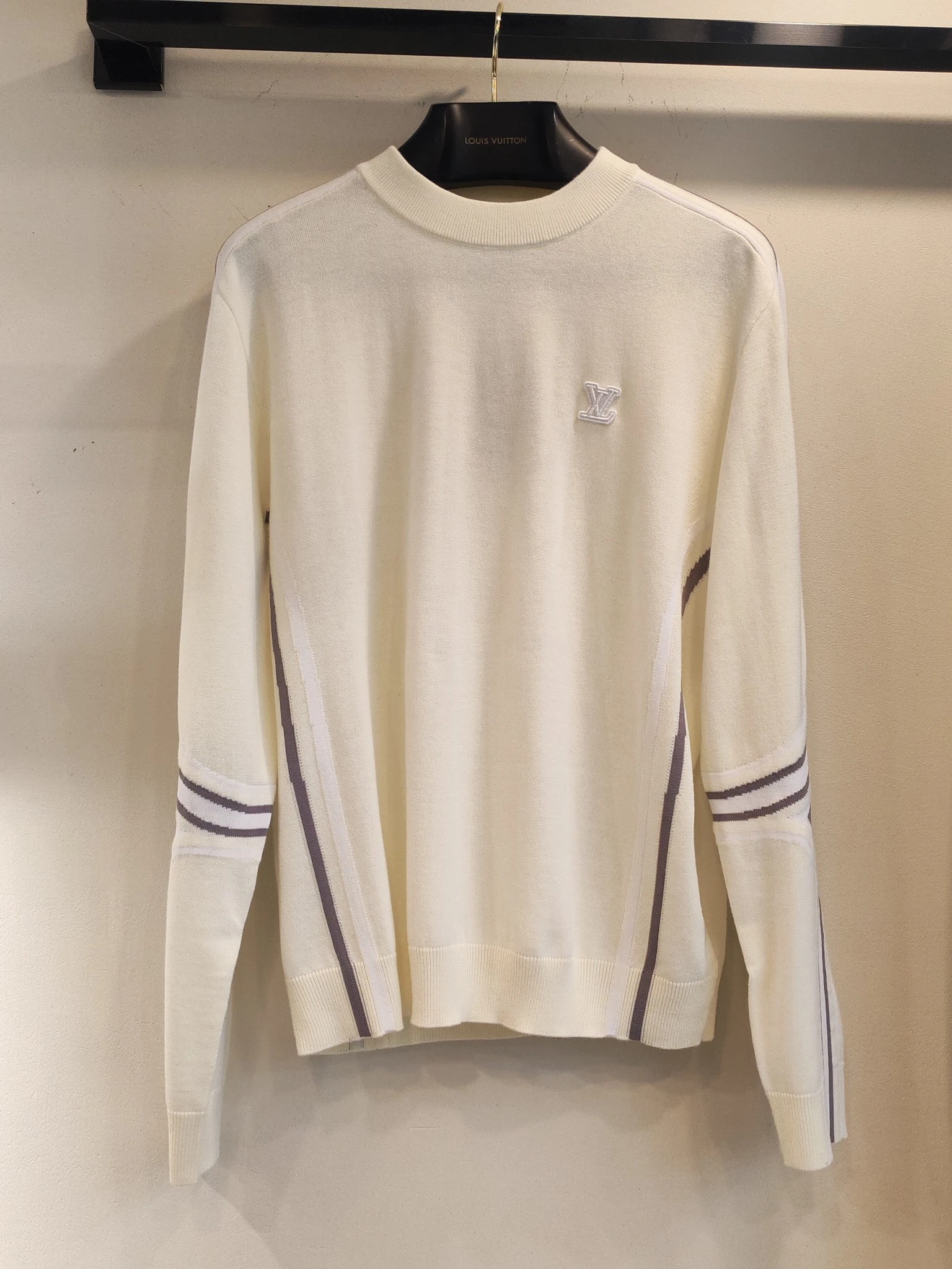 Элегантный мужской свитер LOUIS VUITTON в спокойном кремово‑белом оттенке, выполненный из тонкого мягкого трикотажа. Минималистичный дизайн с аккуратной вышивкой логотипа LV на груди и сдержанными контрастными полосами на рукавах и боковых панелях делает модель универсальной для городского и делового кэжуал‑стиля.