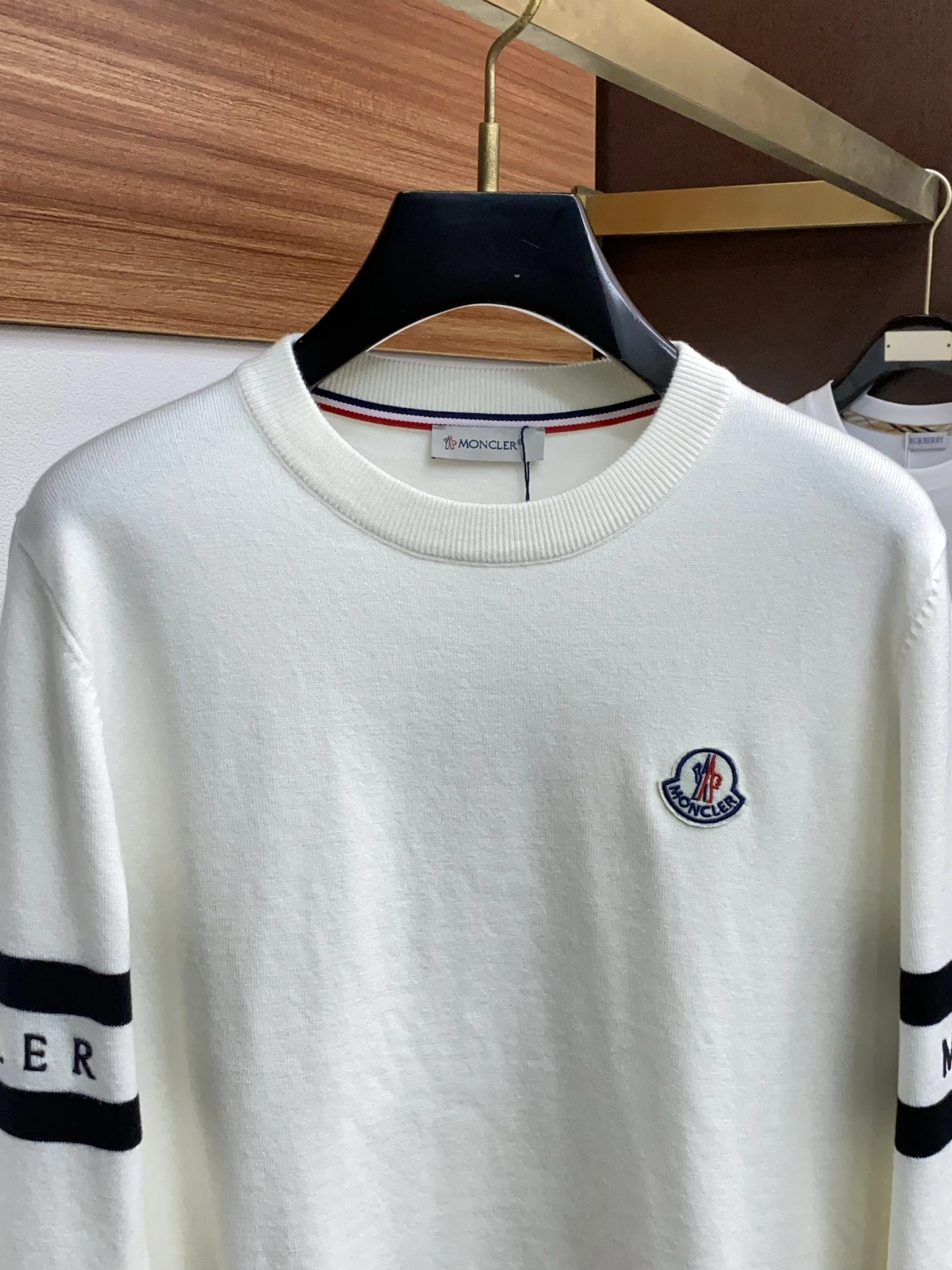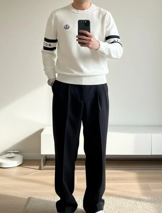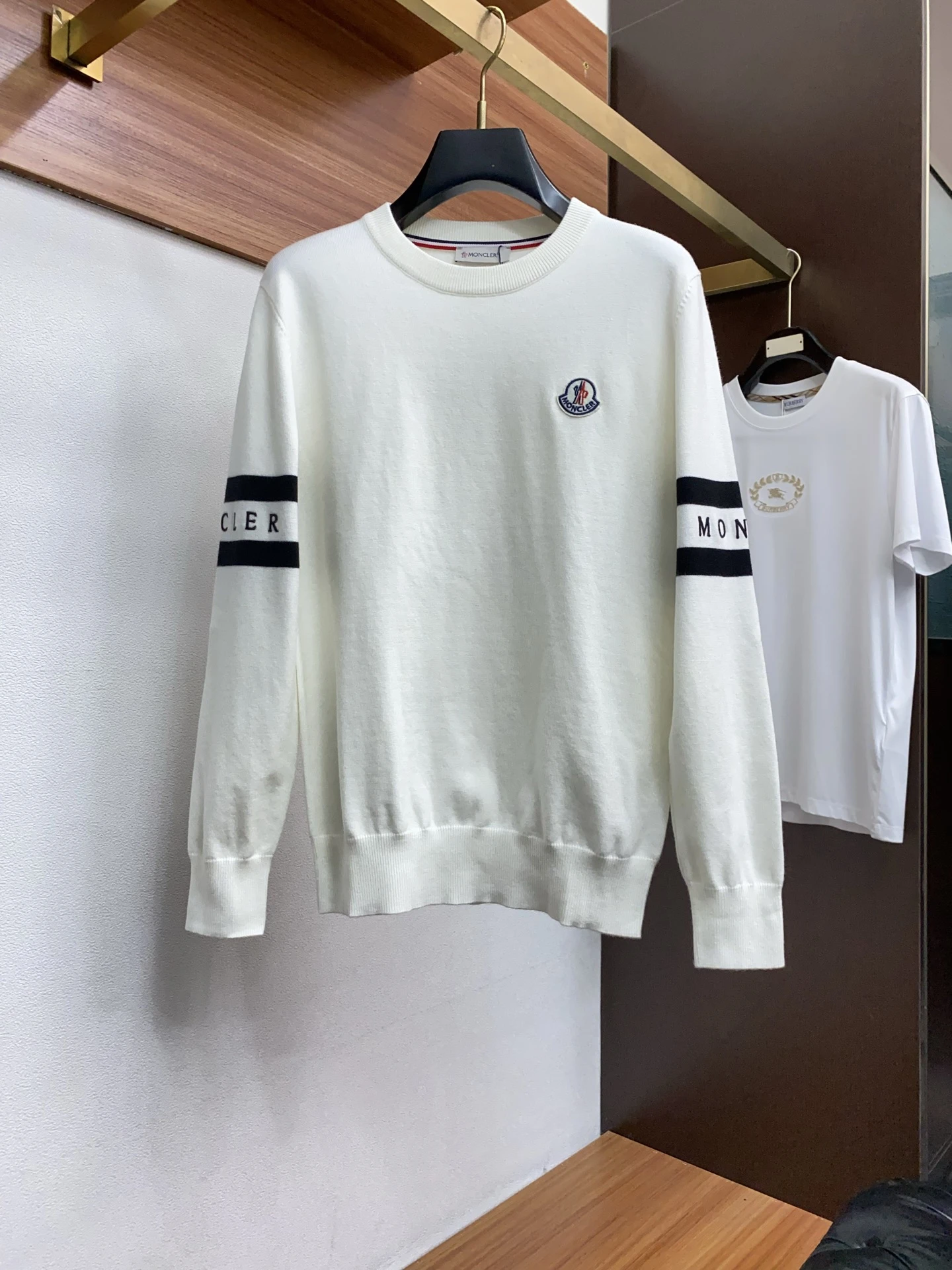 • Дизайн: классический crew-neck, ровный силуэт regular fit. Минималистичный стиль с акцентом на фирменное оформление: контрастные горизонтальные полосы на рукавах с надписью MONCLER и вышитая/пришитая эмблема на левом плече/груди.