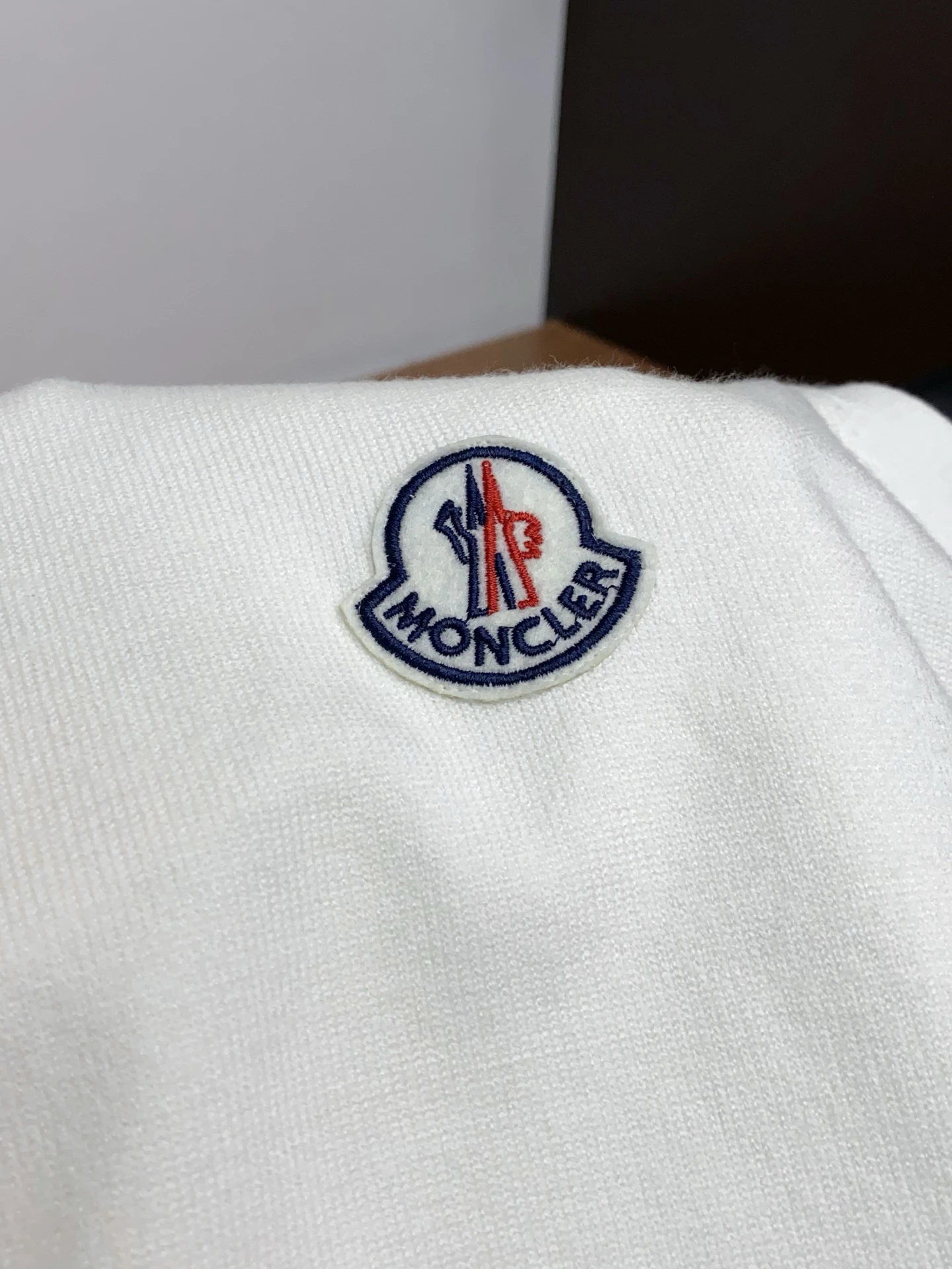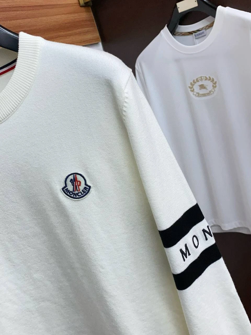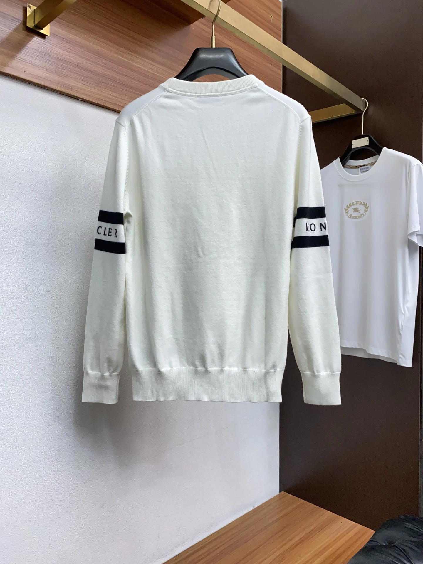 • Дизайн: классический crew-neck, ровный силуэт regular fit. Минималистичный стиль с акцентом на фирменное оформление: контрастные горизонтальные полосы на рукавах с надписью MONCLER и вышитая/пришитая эмблема на левом плече/груди.