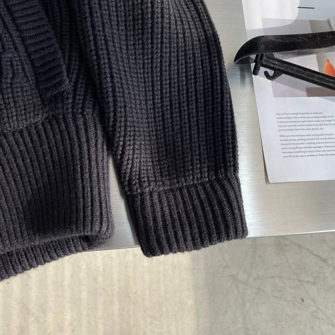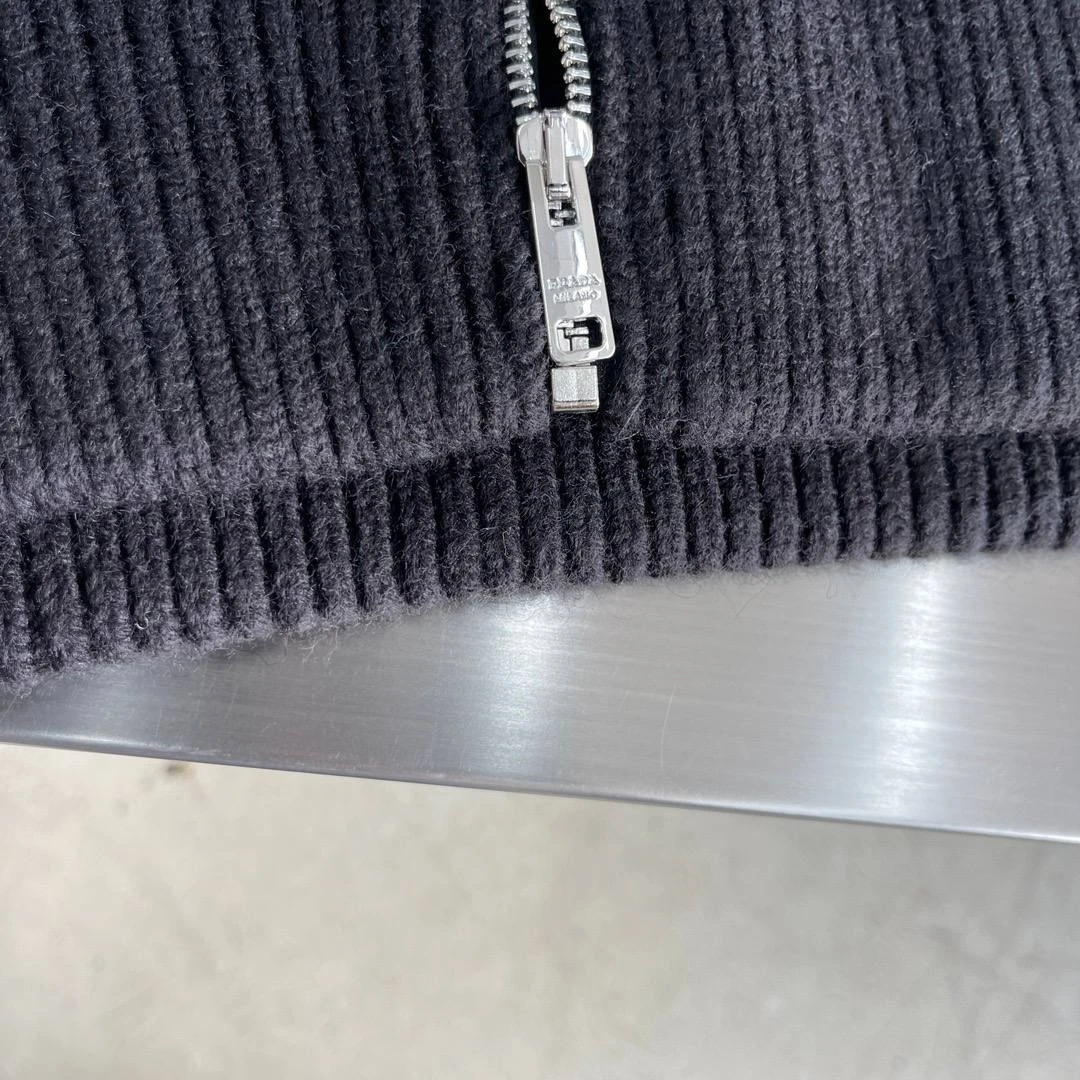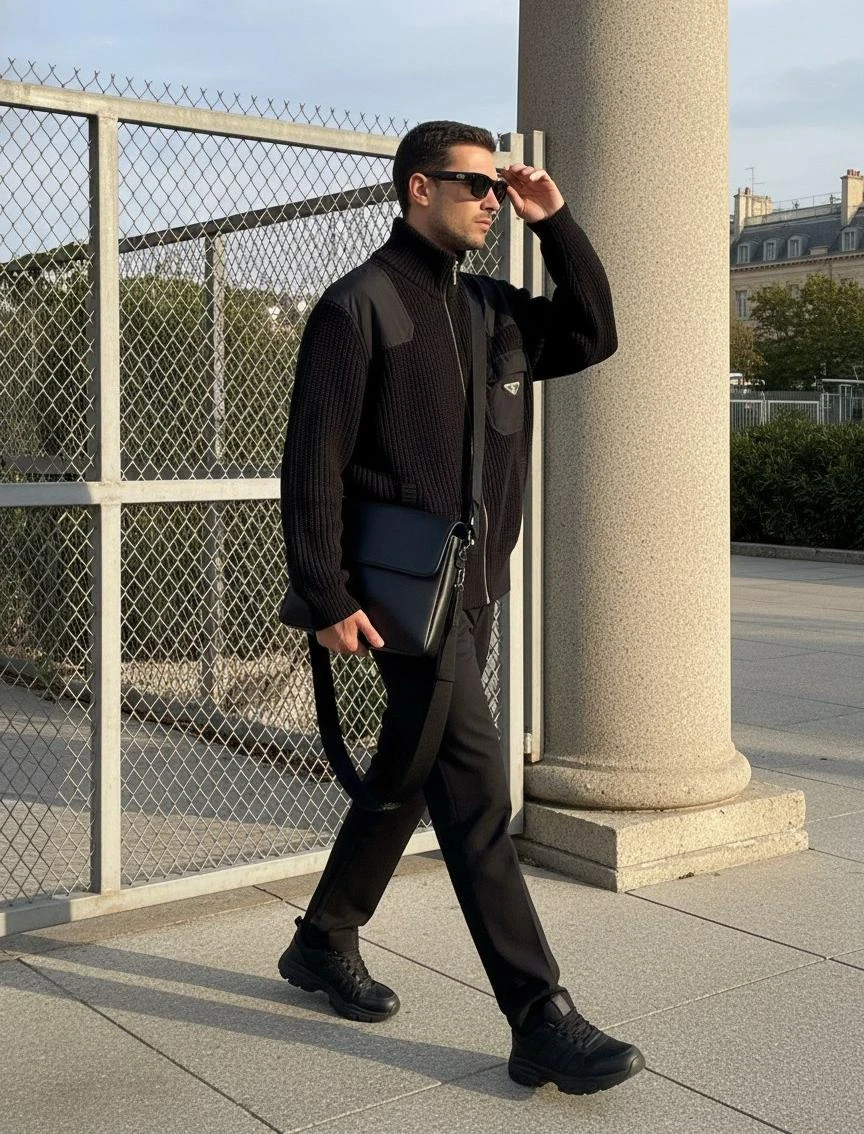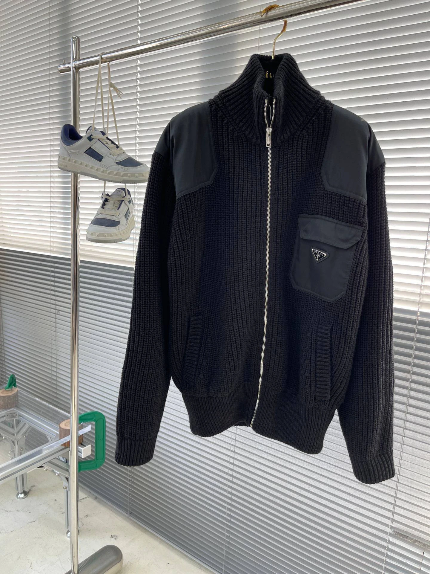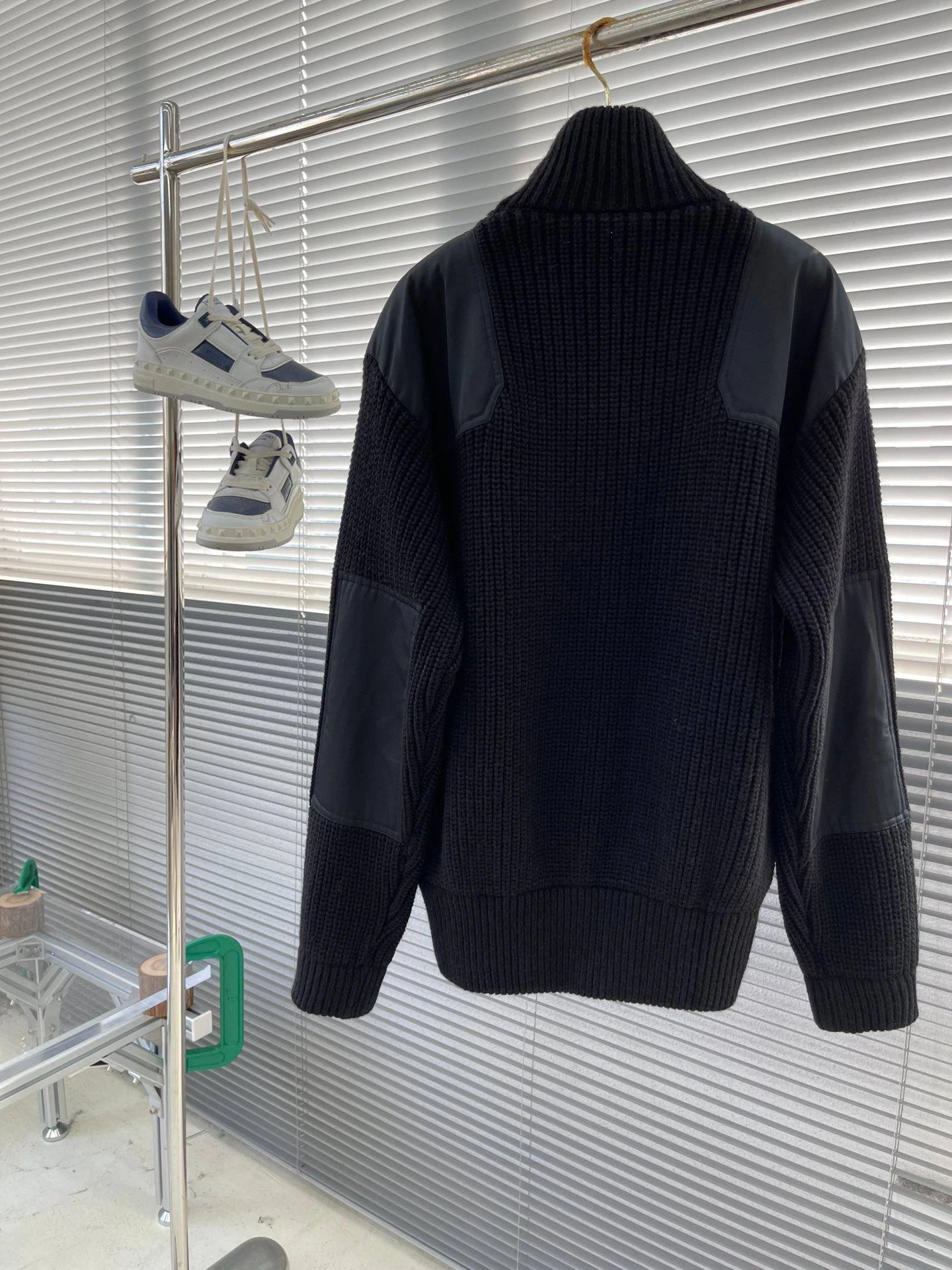 Элегантный мужской джемпер PRADA выполнен в минималистичной эстетике бренда: плотная фактурная вязка глубокого черного цвета, высокий стойкий воротник и функциональные нейлоновые вставки создают одновременно утилитарный и роскошный образ. Идеален для повседневного гардероба в межсезонье и в холодное время года.