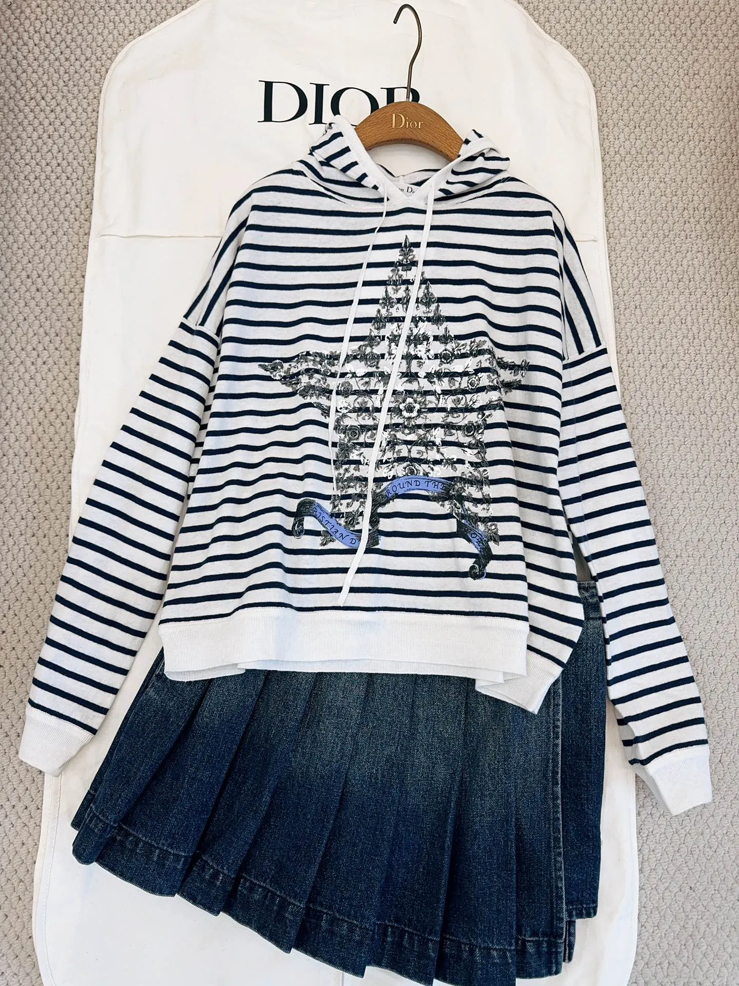Новая вязаная толстовка с капюшоном в полоску от Dior 2025 года выглядит просто потрясающе. Сделанная из тонкой игольной ткани, она сочетает в себе хлопок и лен, что делает ее легкой, дышащей и очень мягкой на ощупь. Классическая комбинация темно-синих полос создает элегантный, но в то же время игривый внешний вид, а звездный цветочный принт придает ей оригинальности. Перекликающиеся ленты на груди и спине добавляют интересные акценты, а заниженные плечи создают стильный, расслабленный силуэт.