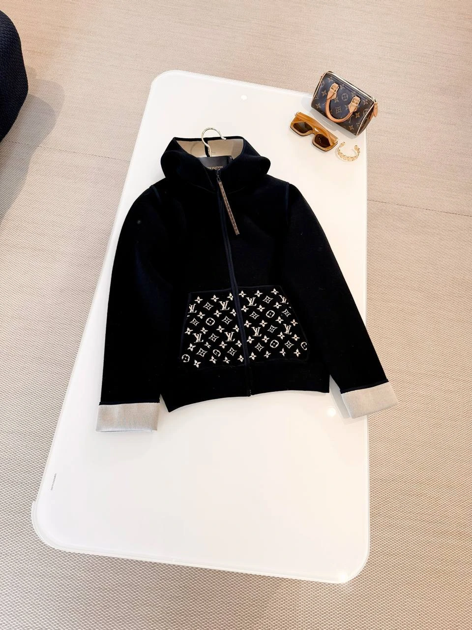 Элегантная черная толстовка на молнии с высоким воротником‑капюшоном и контрастной карманной панелью с фирменным монограмм‑узором. Сдержанный люксовый силуэт для образа в стиле casual‑chic.