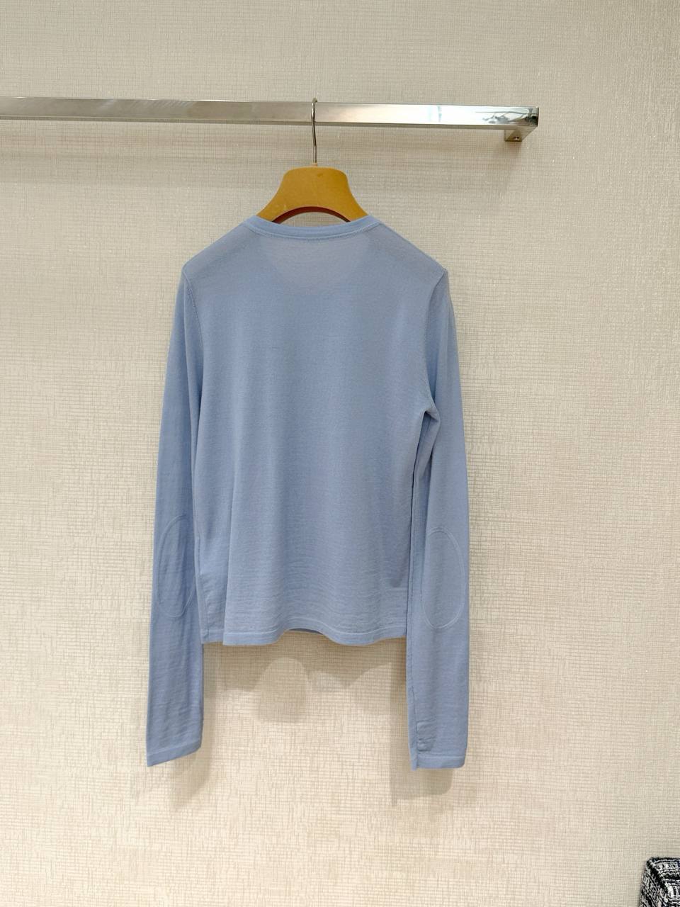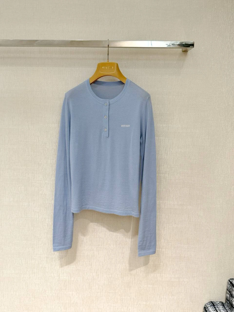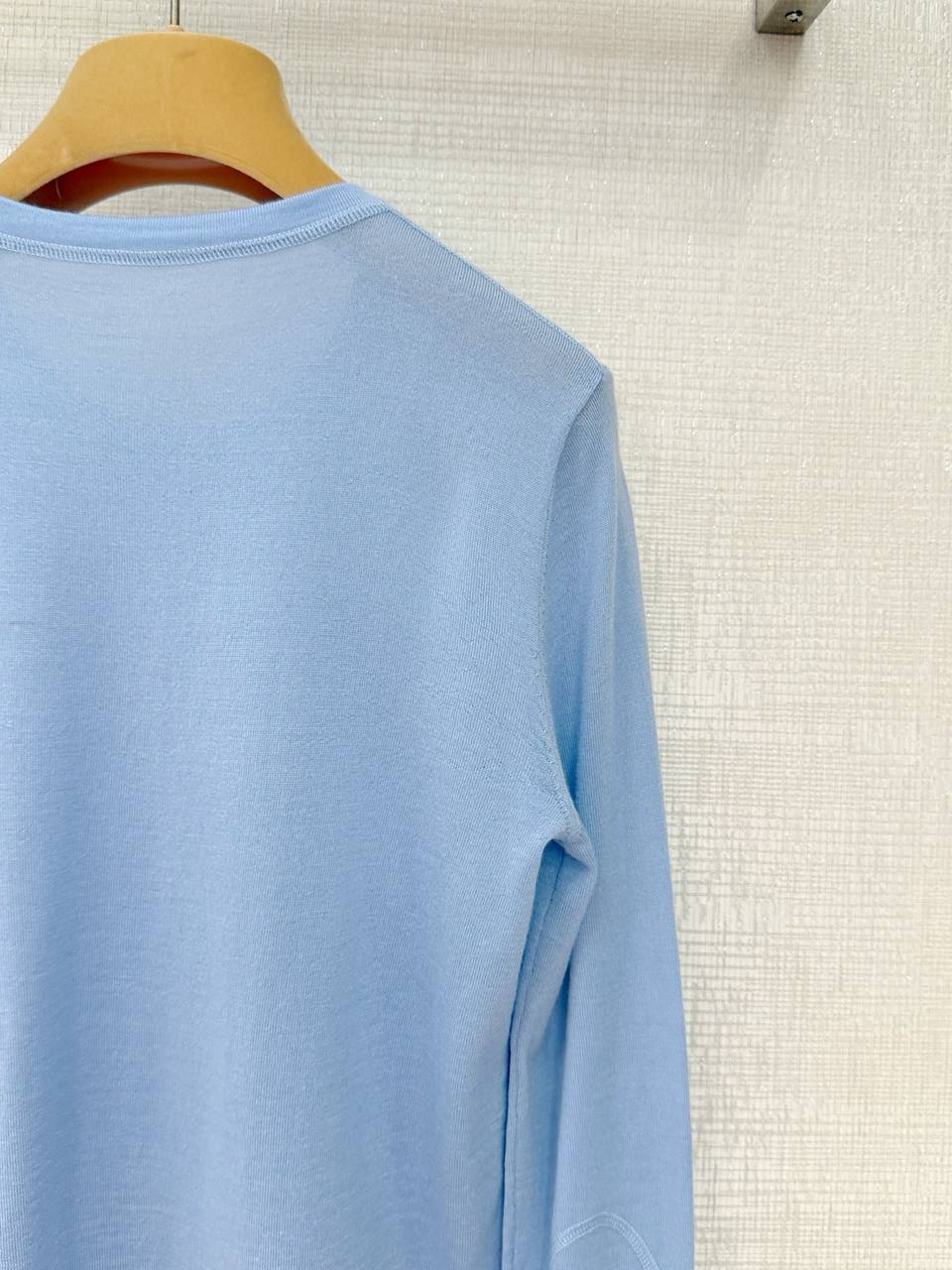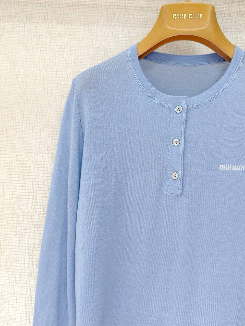 Элегантный лонгслив MIU MIU в мягком тонком трикотаже — минималистичный силуэт с круглым вырезом и короткой планкой на трех пуговицах. Нежно‑голубой пастельный оттенок и аккуратная мини‑вышивка логотипа на груди придают изделию утончённый, повседневно‑элегантный характер.