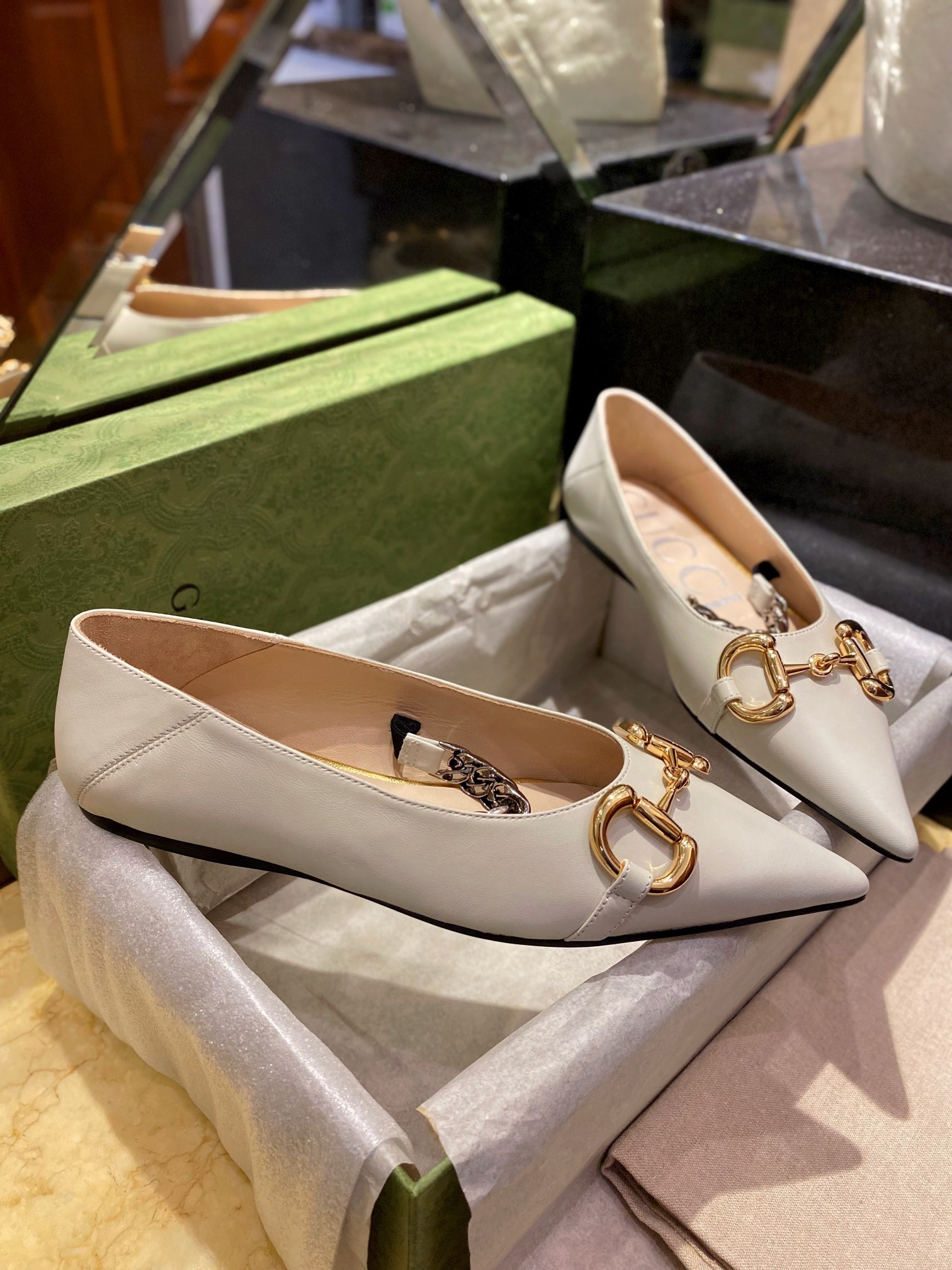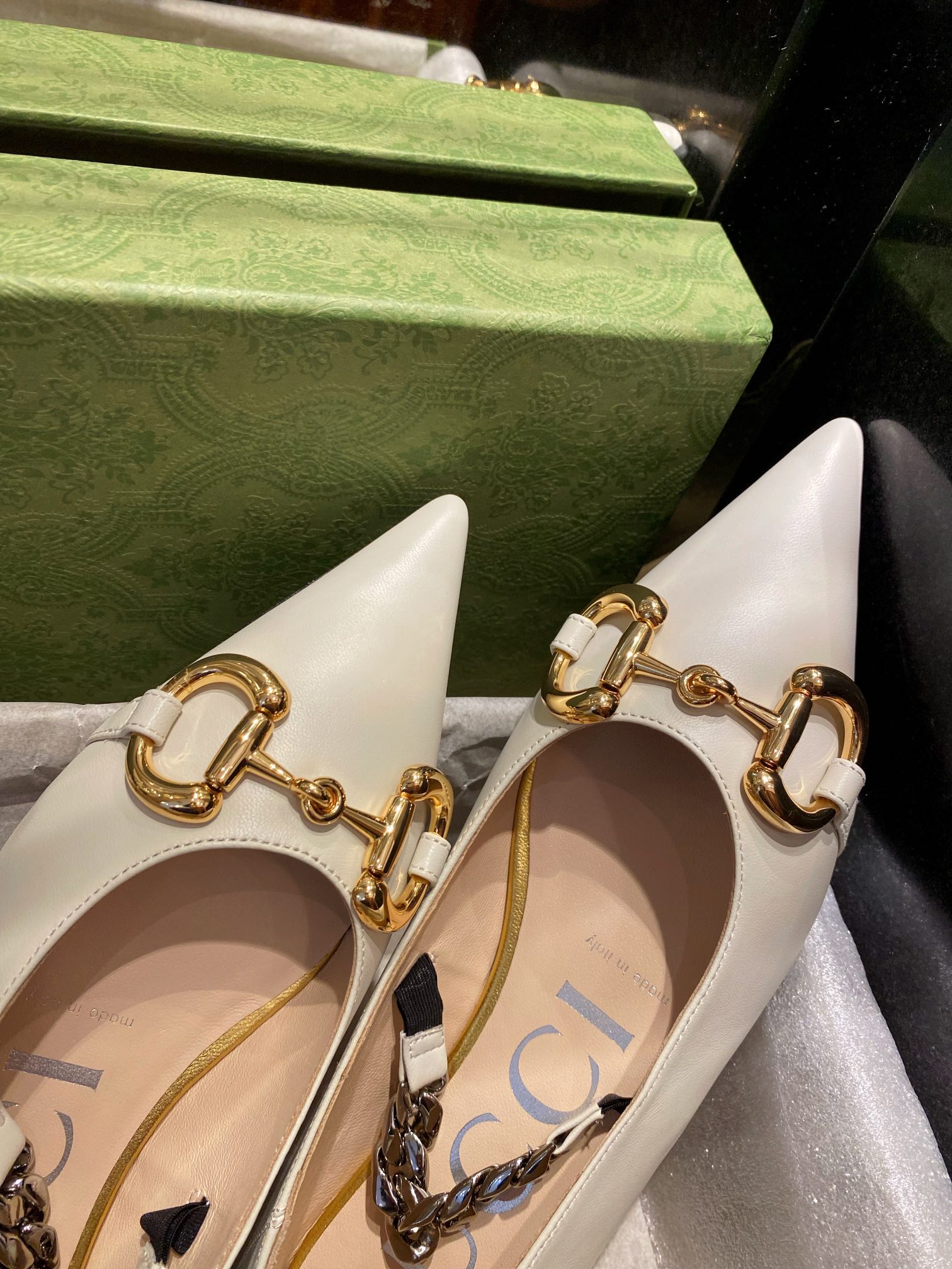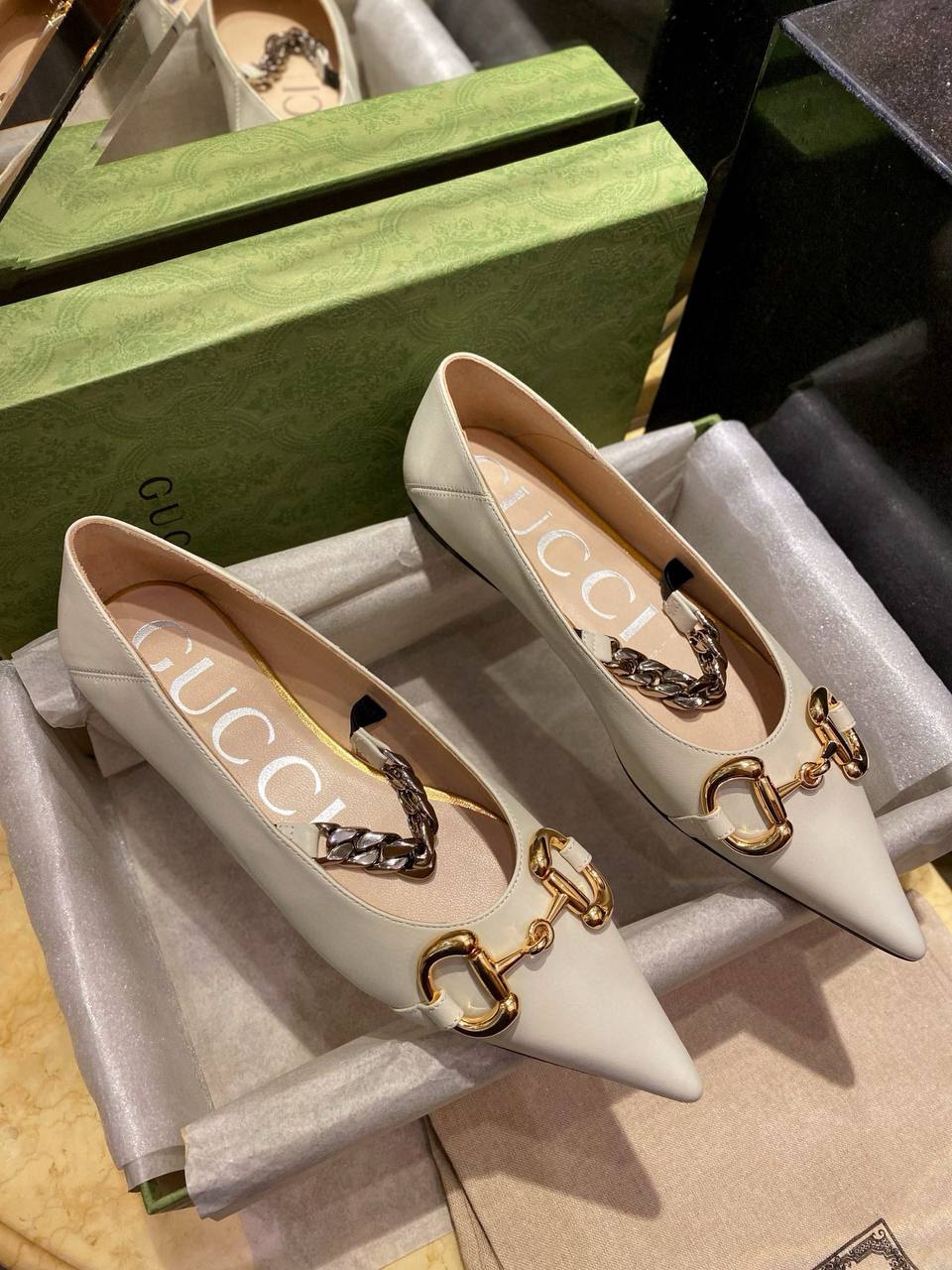 Зауженный мыс придаёт обуви изящества, а фирменная металлическая фурнитура в золотистом цвете с логотипом Gucci акцентирует люксовый характер пары. Удобная кожаная стелька делает балетки подходящими для длительного ношения. Идеальный выбор для повседневных и особых образов.