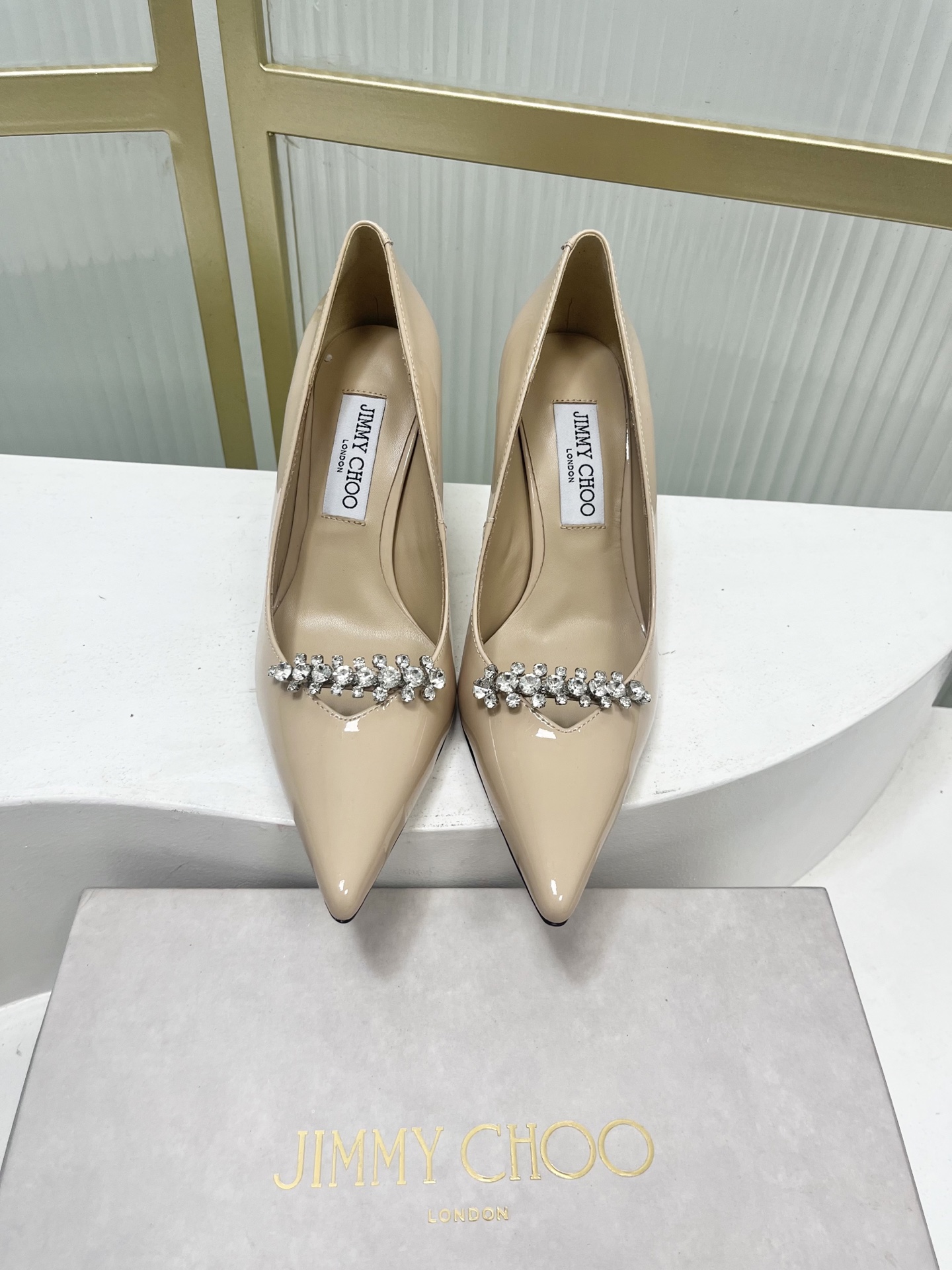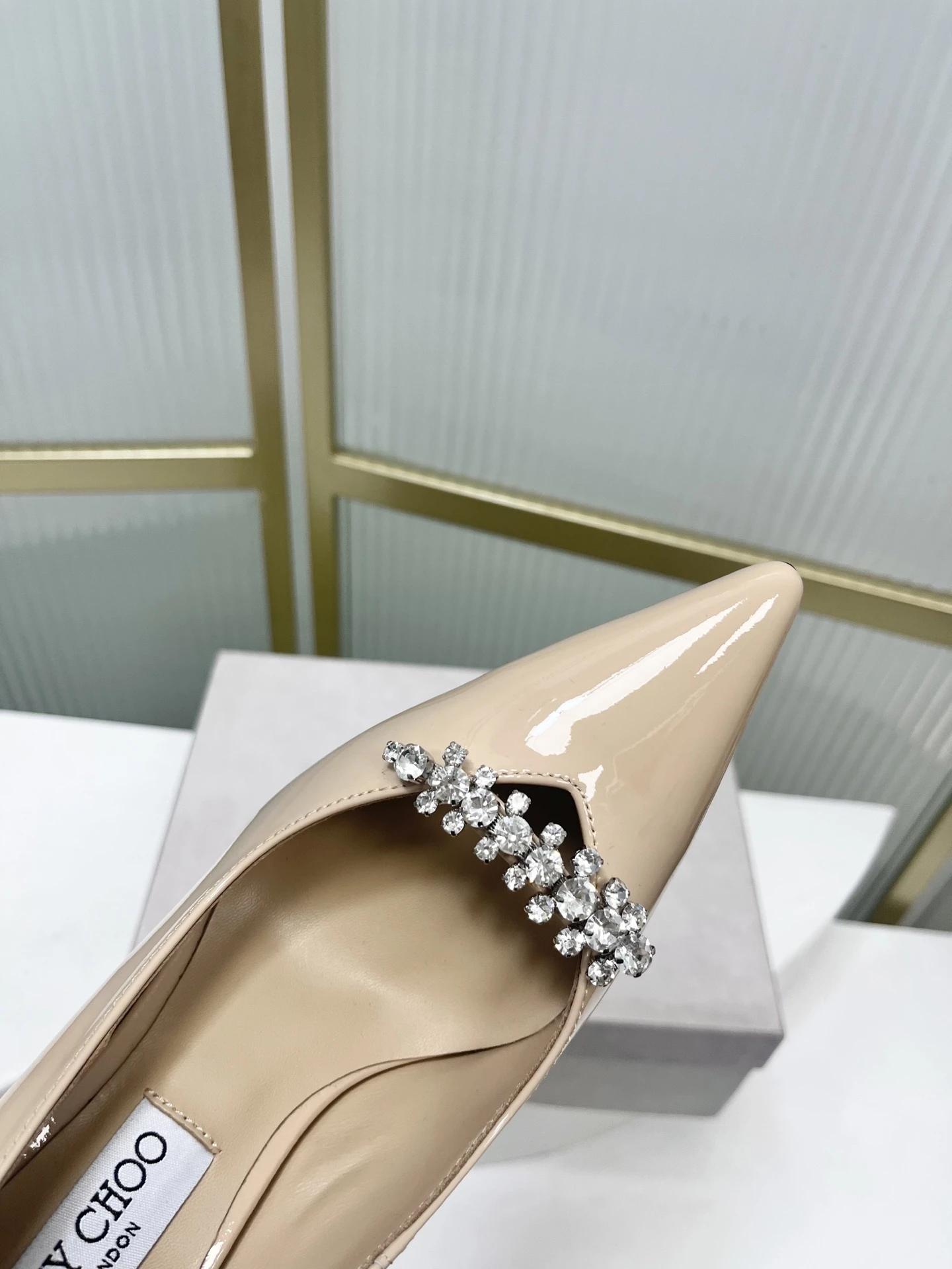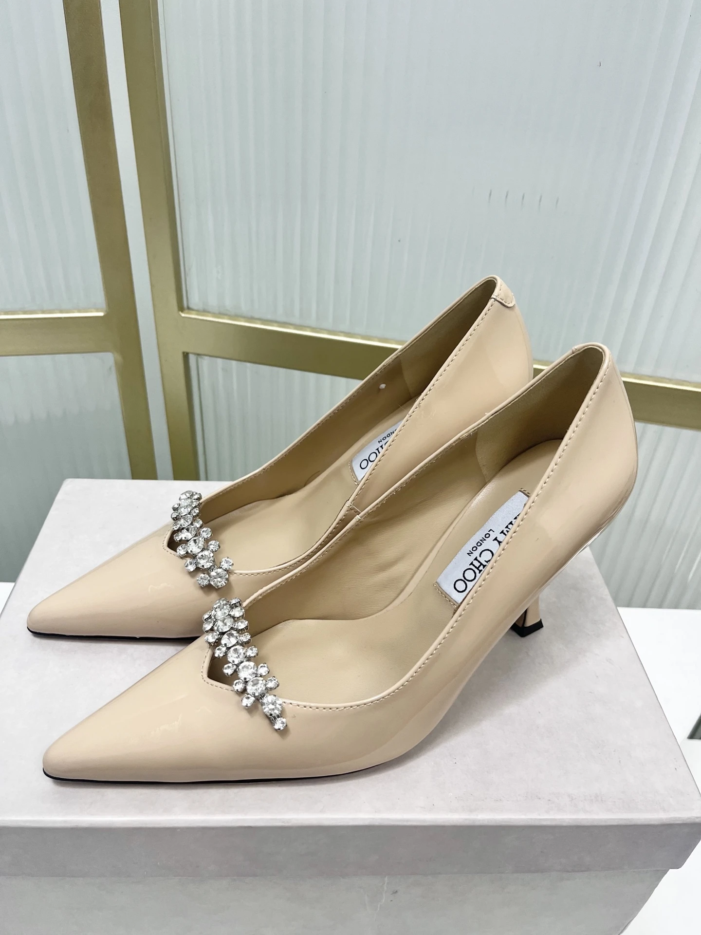 Изысканные лодочки JIMMY CHOO в нежном нюдовом оттенке из лакированной кожи — идеальный выбор для торжественных выходов и вечерних образов. Заострённый носок и тонкий высокий каблук придают силуэту утончённость, а декоративная полоса из сверкающих кристаллов делает модель по‑настоящему праздничной и запоминающейся.
