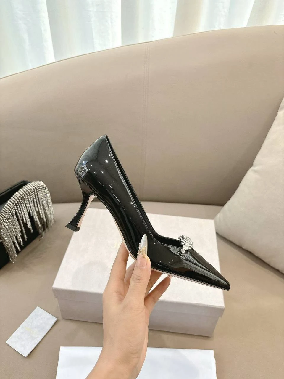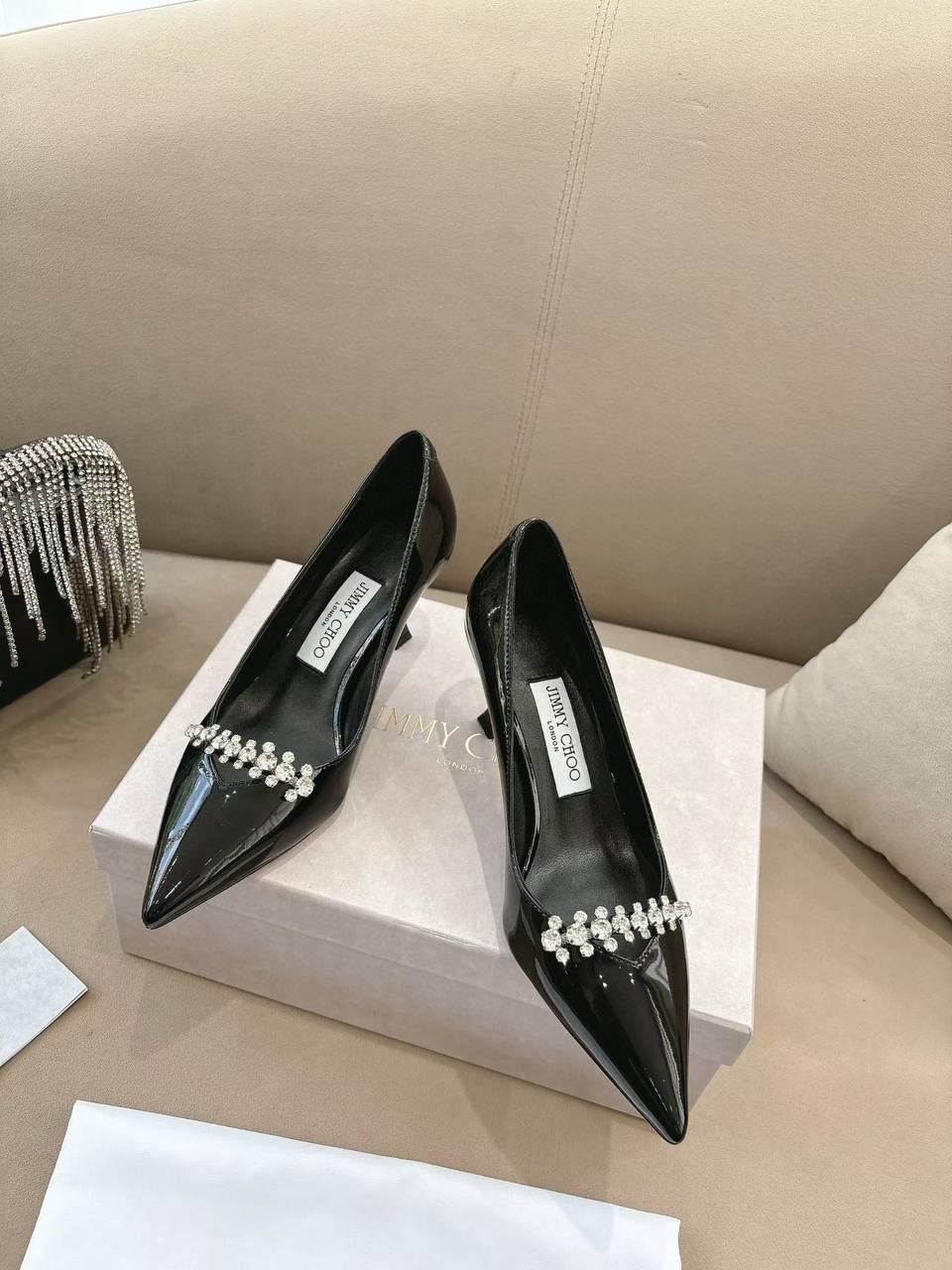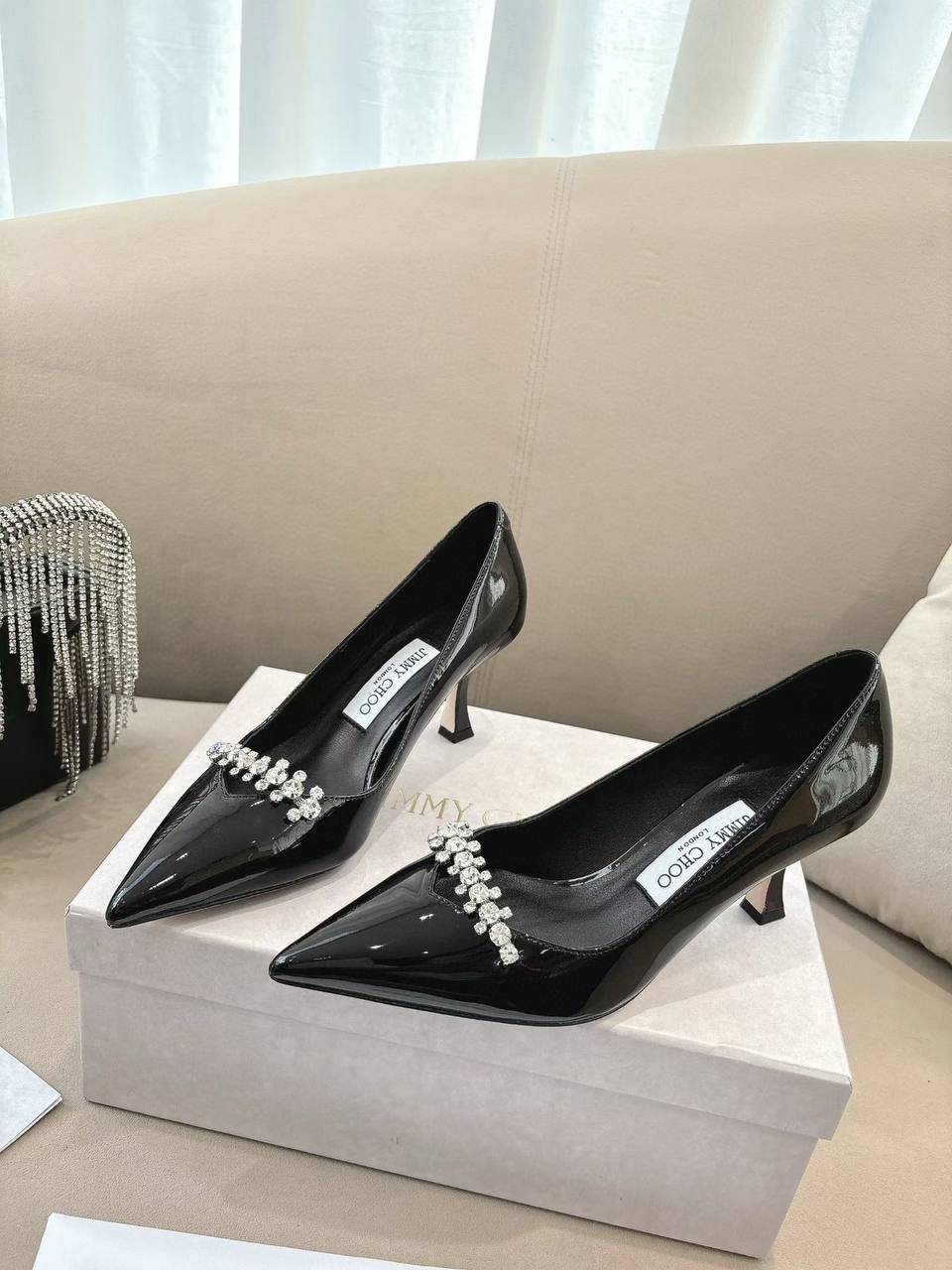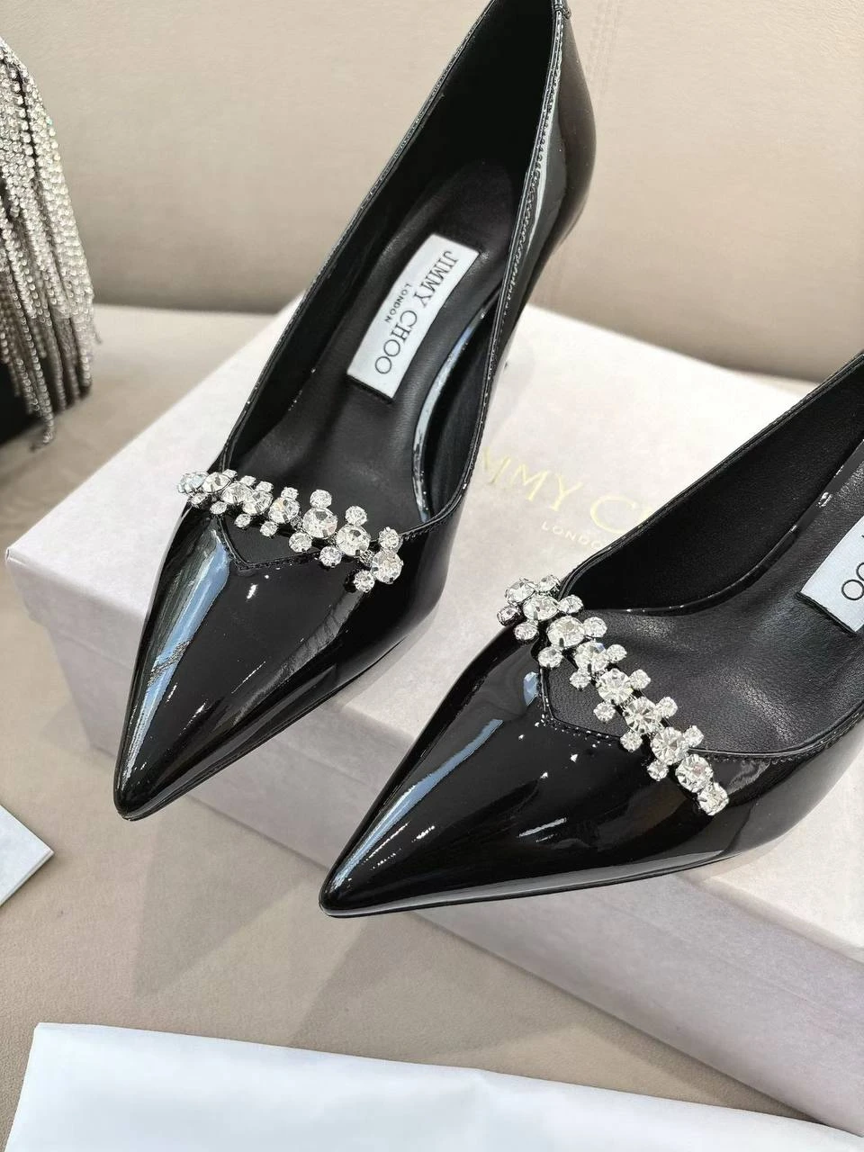 Изысканные лодочки JIMMY CHOO в нежном нюдовом оттенке из лакированной кожи — идеальный выбор для торжественных выходов и вечерних образов. Заострённый носок и тонкий высокий каблук придают силуэту утончённость, а декоративная полоса из сверкающих кристаллов делает модель по‑настоящему праздничной и запоминающейся.