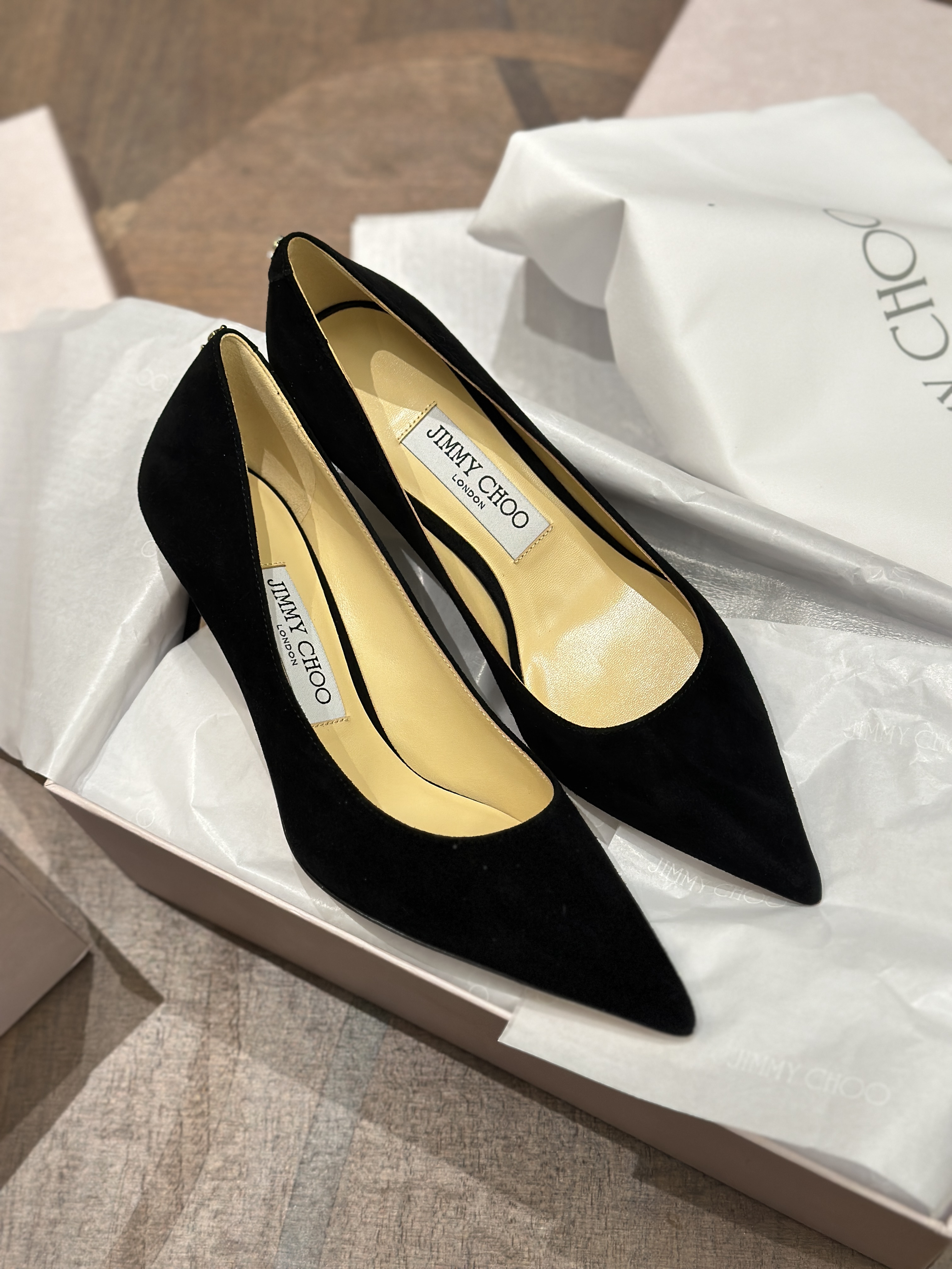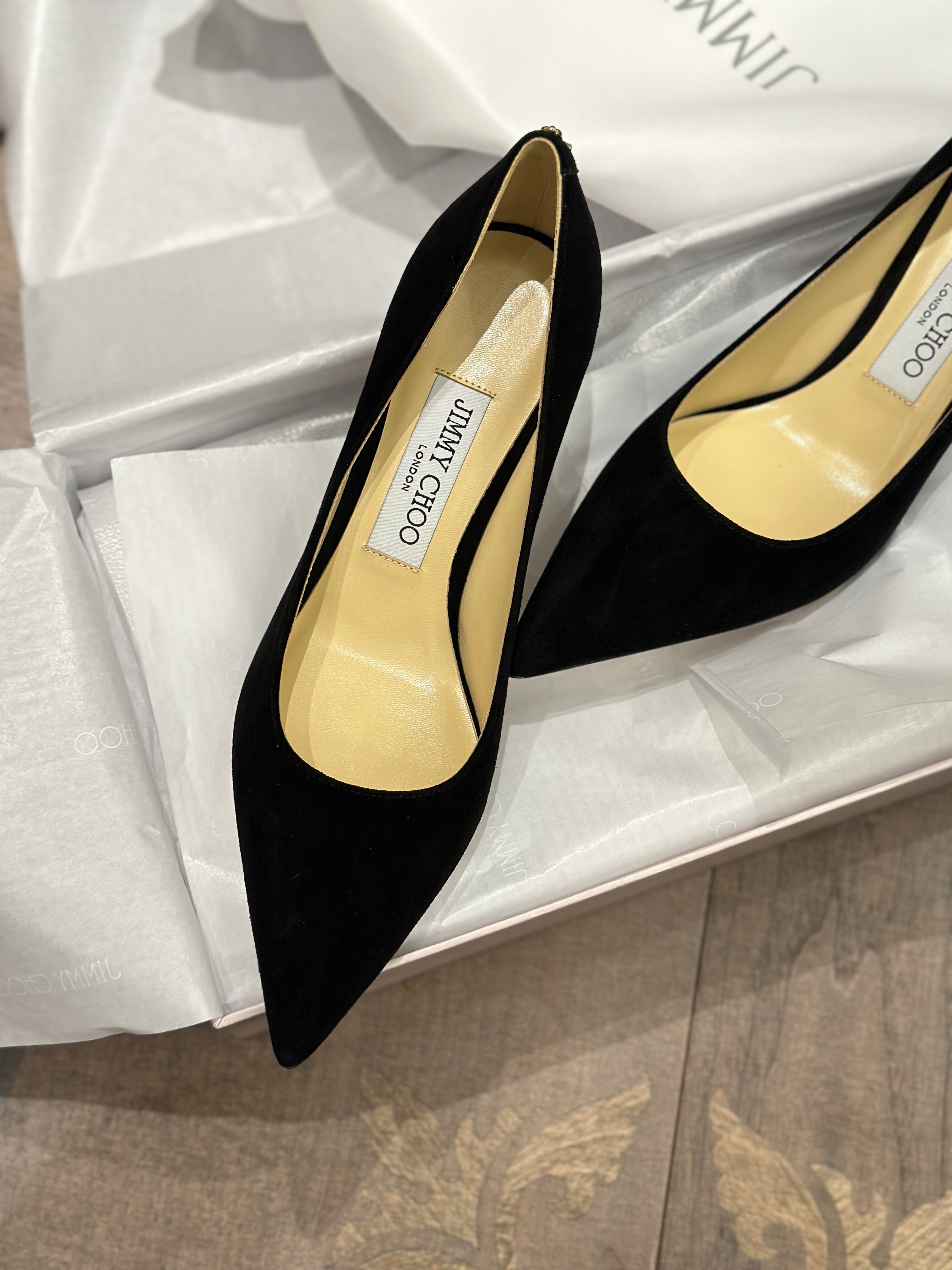 Изысканные классические туфли-лодочки JIMMY CHOO в чёрном замшевом исполнении. Элегантный заострённый носок и аккуратный устойчивый каблук высотой 6,5 см создают женственный силуэт, удобный для повседневного ношения и вечерних образов.