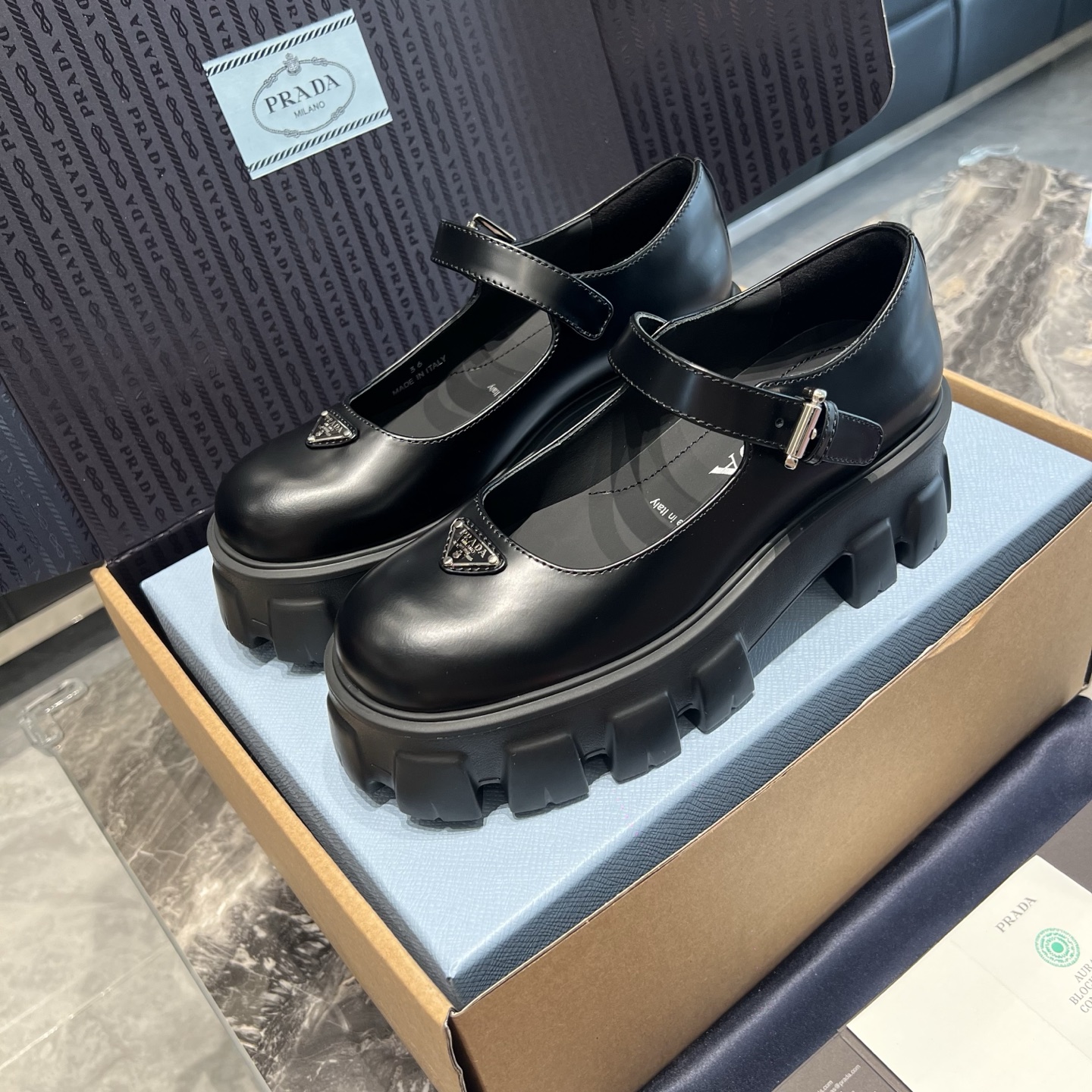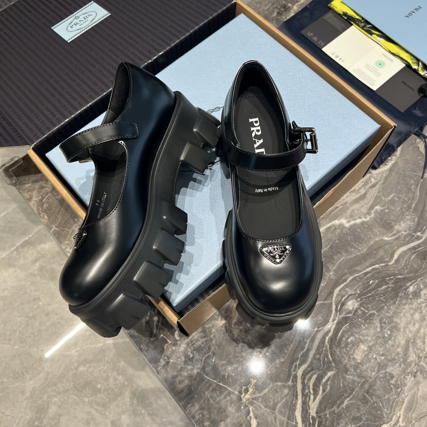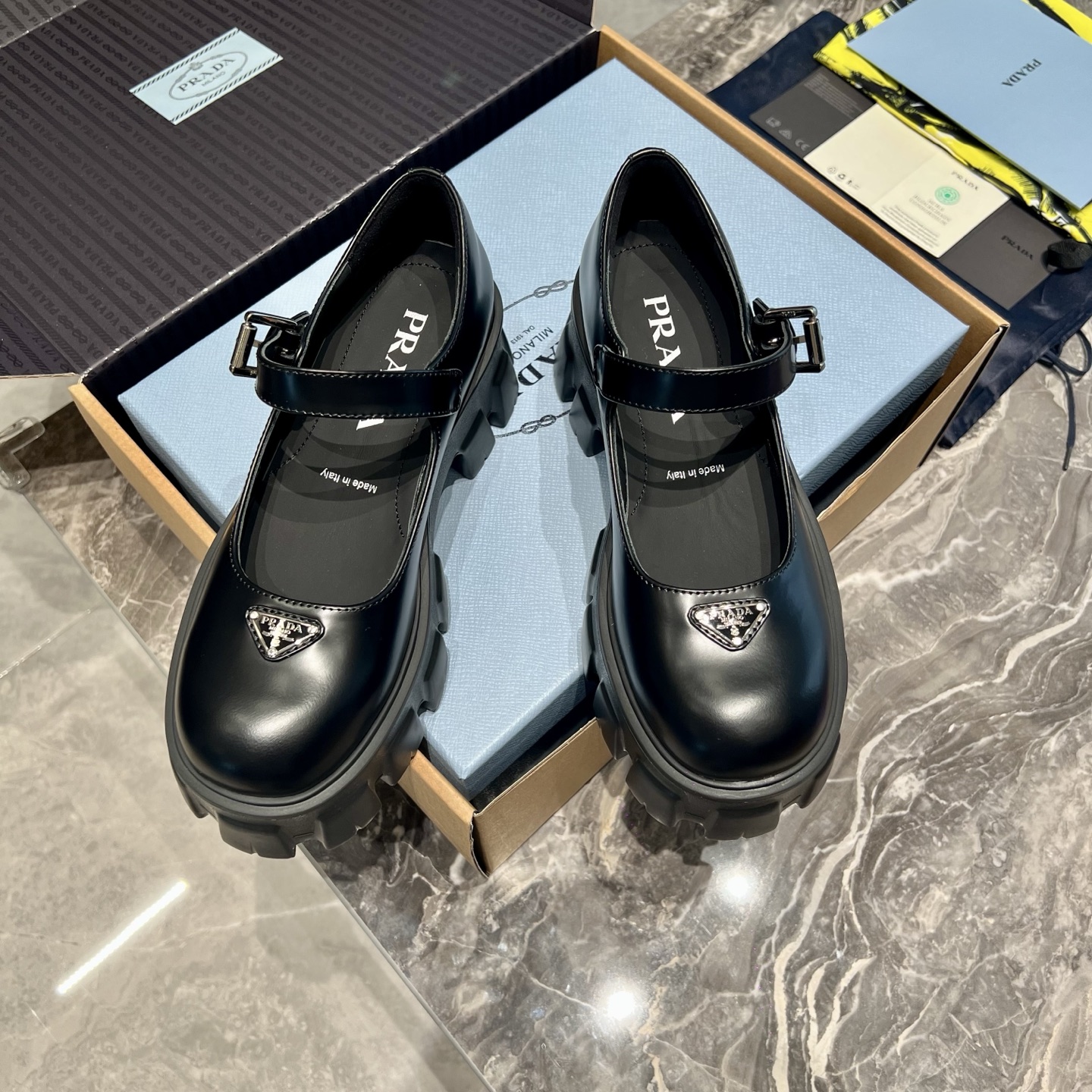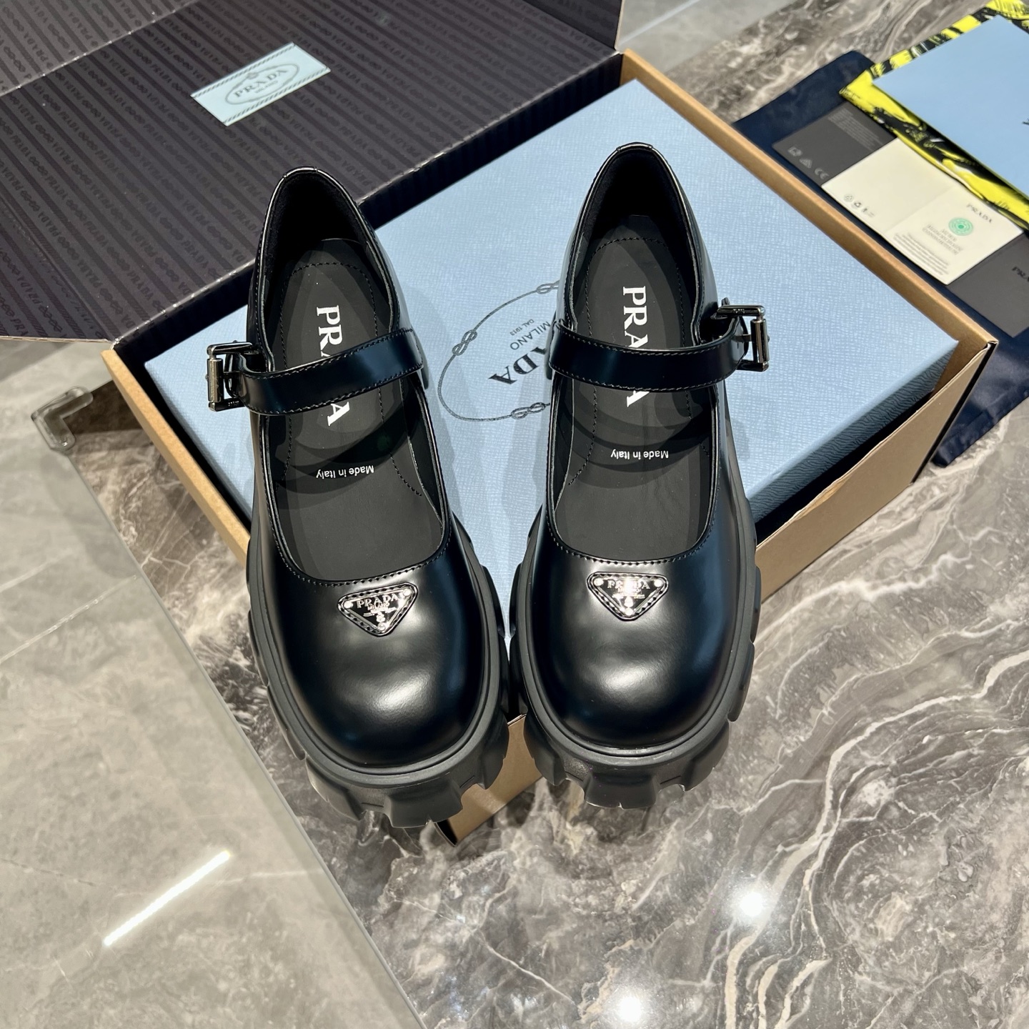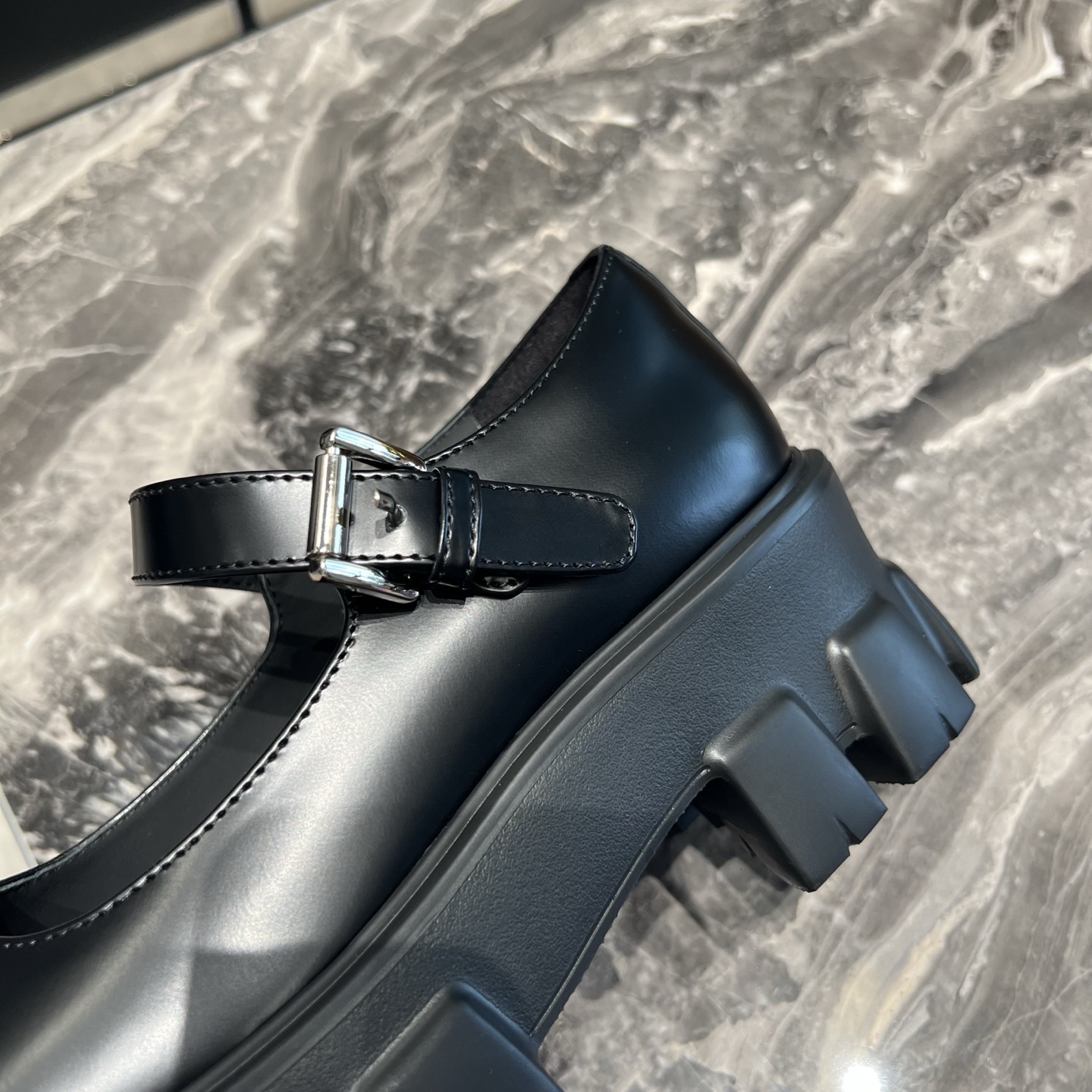 Эти стильные туфли мэри-джейн Prada выполнены из премиальной натуральной кожи, что обеспечивает комфорт и долговечность. Модель отличается актуальным силуэтом с округлым мысом, регулируемым ремешком на пряжке и массивной подошвой, которая придаёт образу современный городской акцент. Элегантный декор — фирменная металлическая эмблема Prada на носке — подчёркивает утончённый стиль бренда.