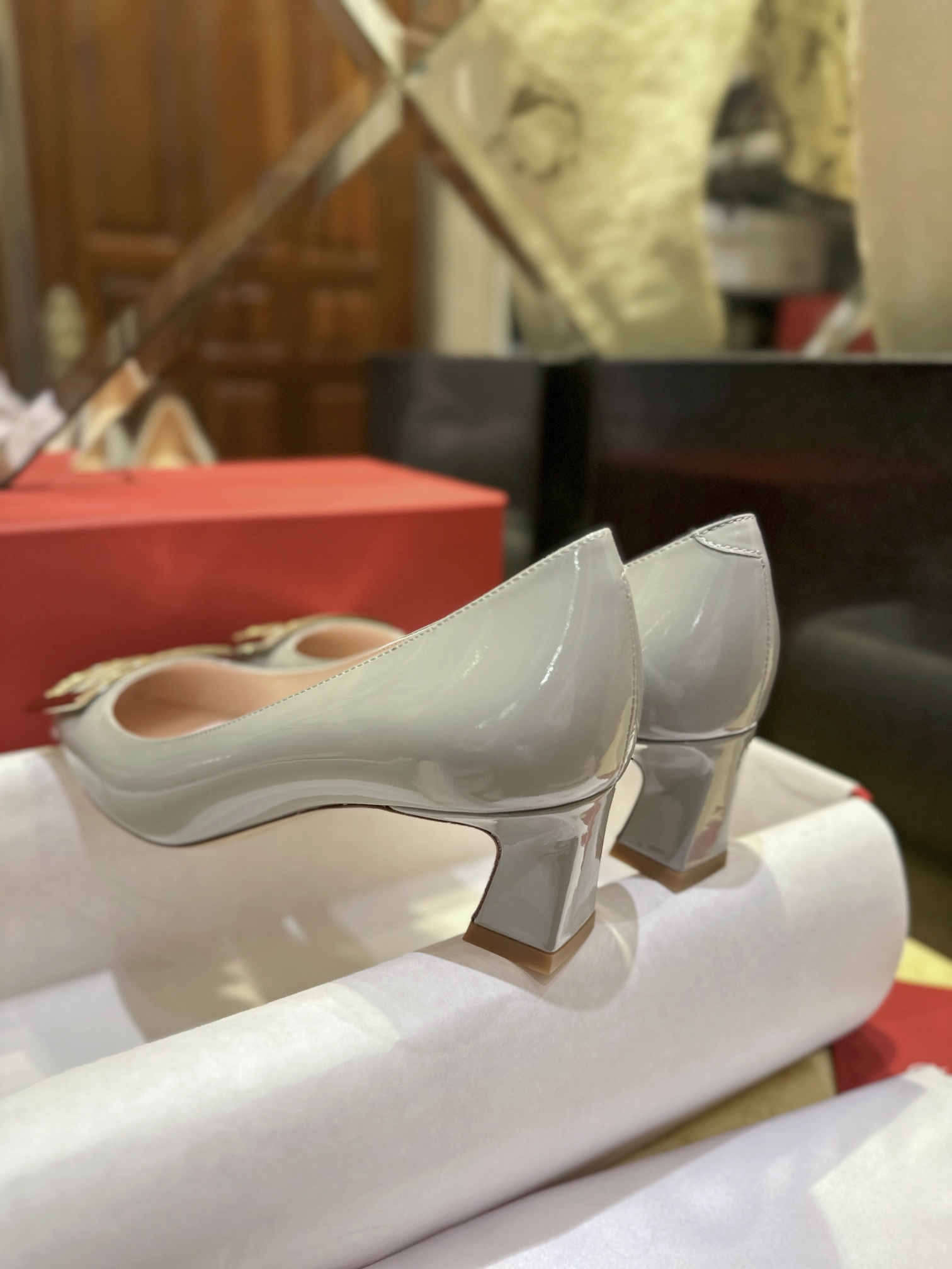 Фирменная квадратная пряжка с металлическим обрамлением на носке — узнаваемый символ бренда, подчеркивающий эксклюзивность и изысканность обуви. Устойчивый каблук средней высоты придаёт лёгкость походке и обеспечивает дополнительную поддержку.