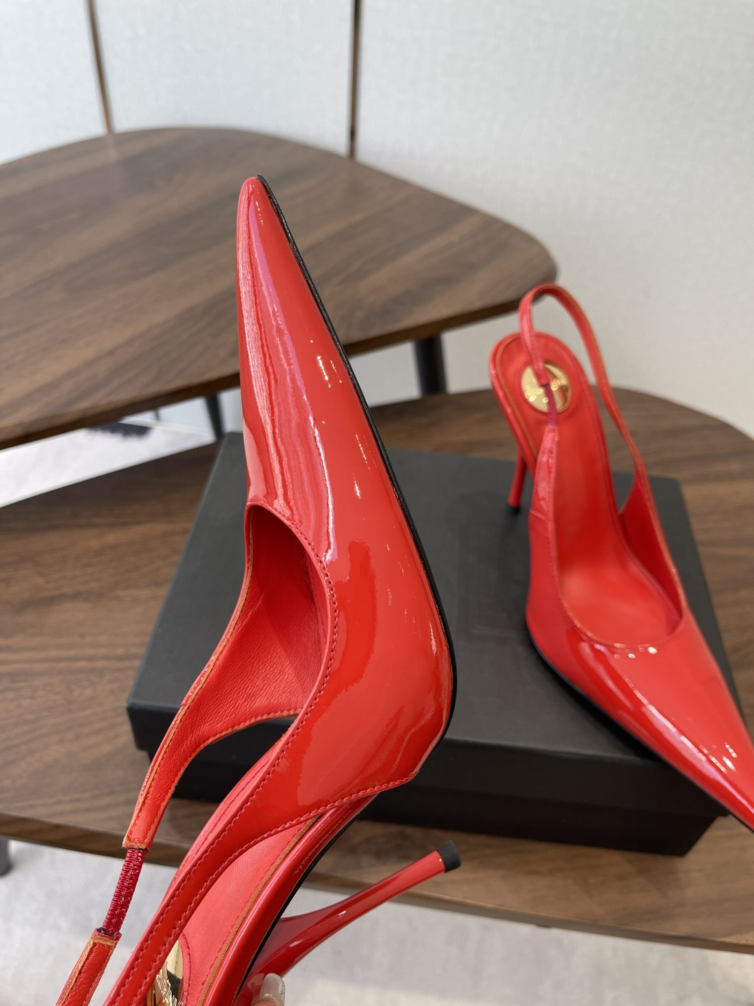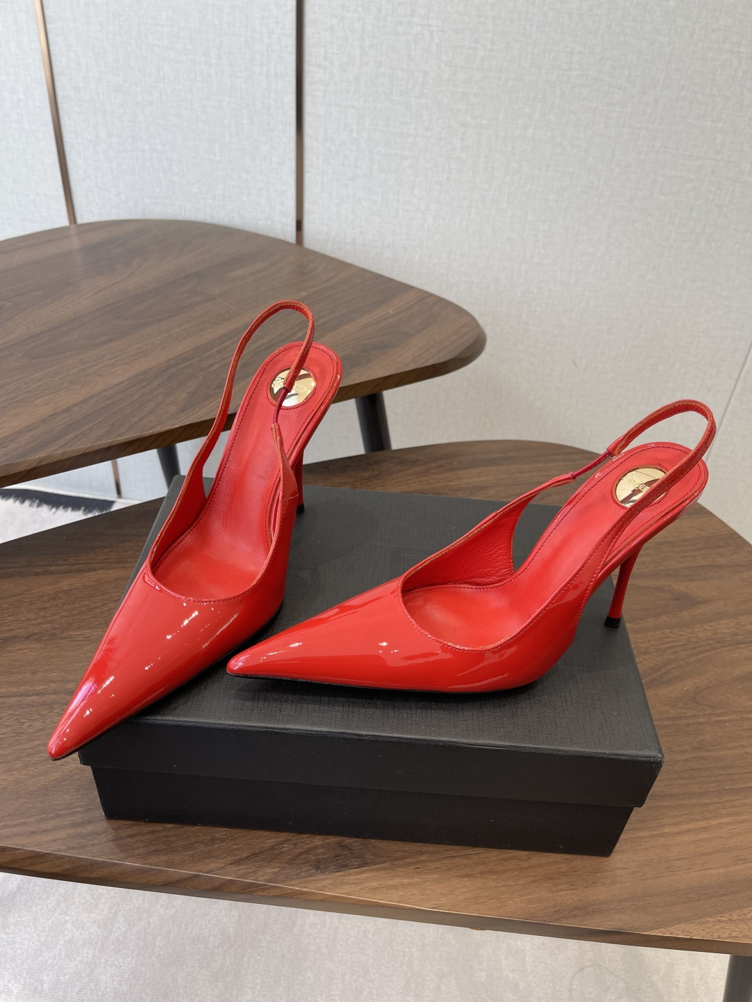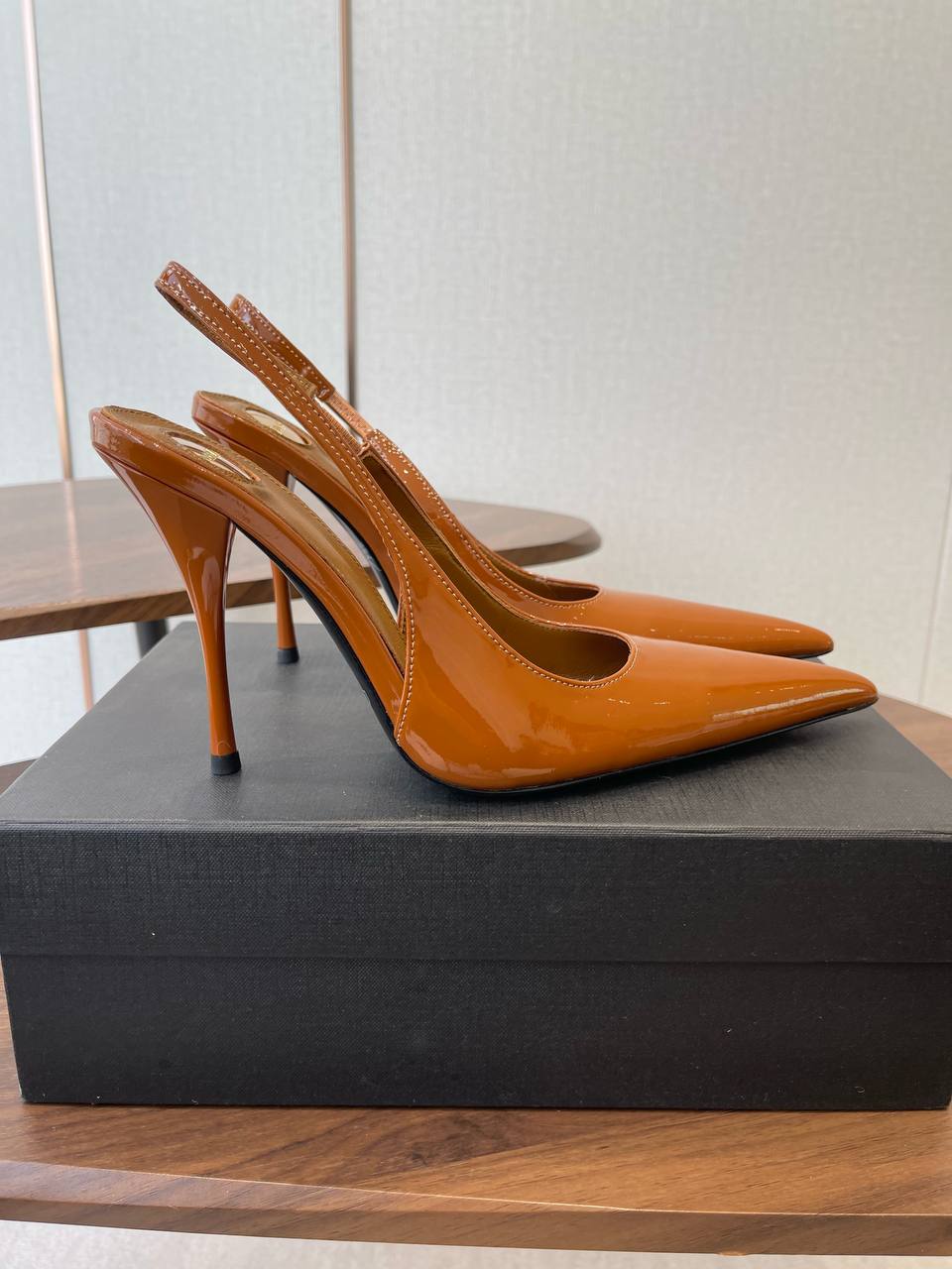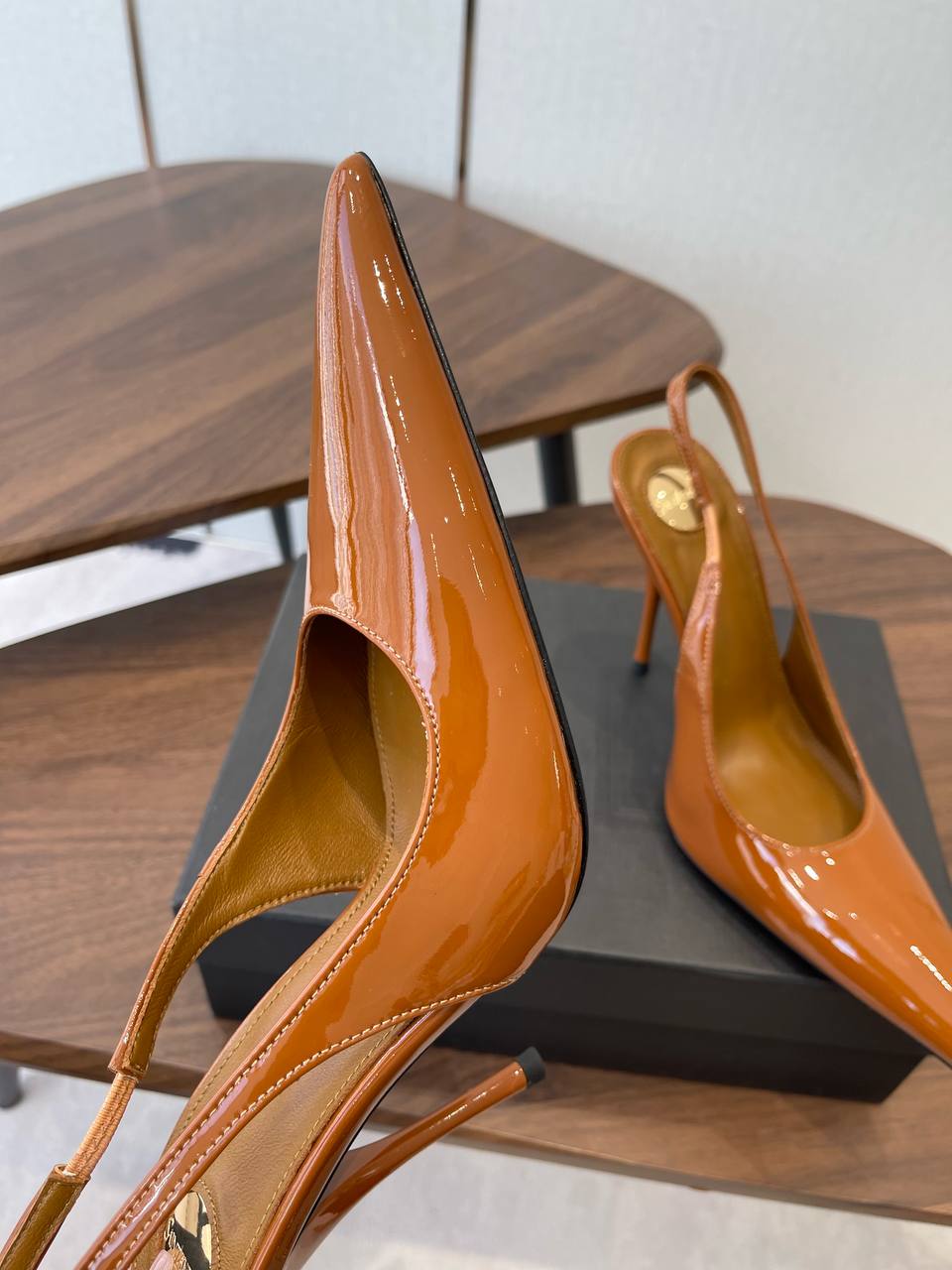 Изысканные туфли‑лодочки от Saint Laurent в лаковой коже насыщенного терракотового оттенка. Элегантный зауженный носок и тонкий шпильковый каблук 10 см создают классический силуэт, а открытая пятка со стрейч‑ремешком обеспечивает женственный и лёгкий образ. Идеальный вариант для вечернего выхода и для утончённого офисного стиля.