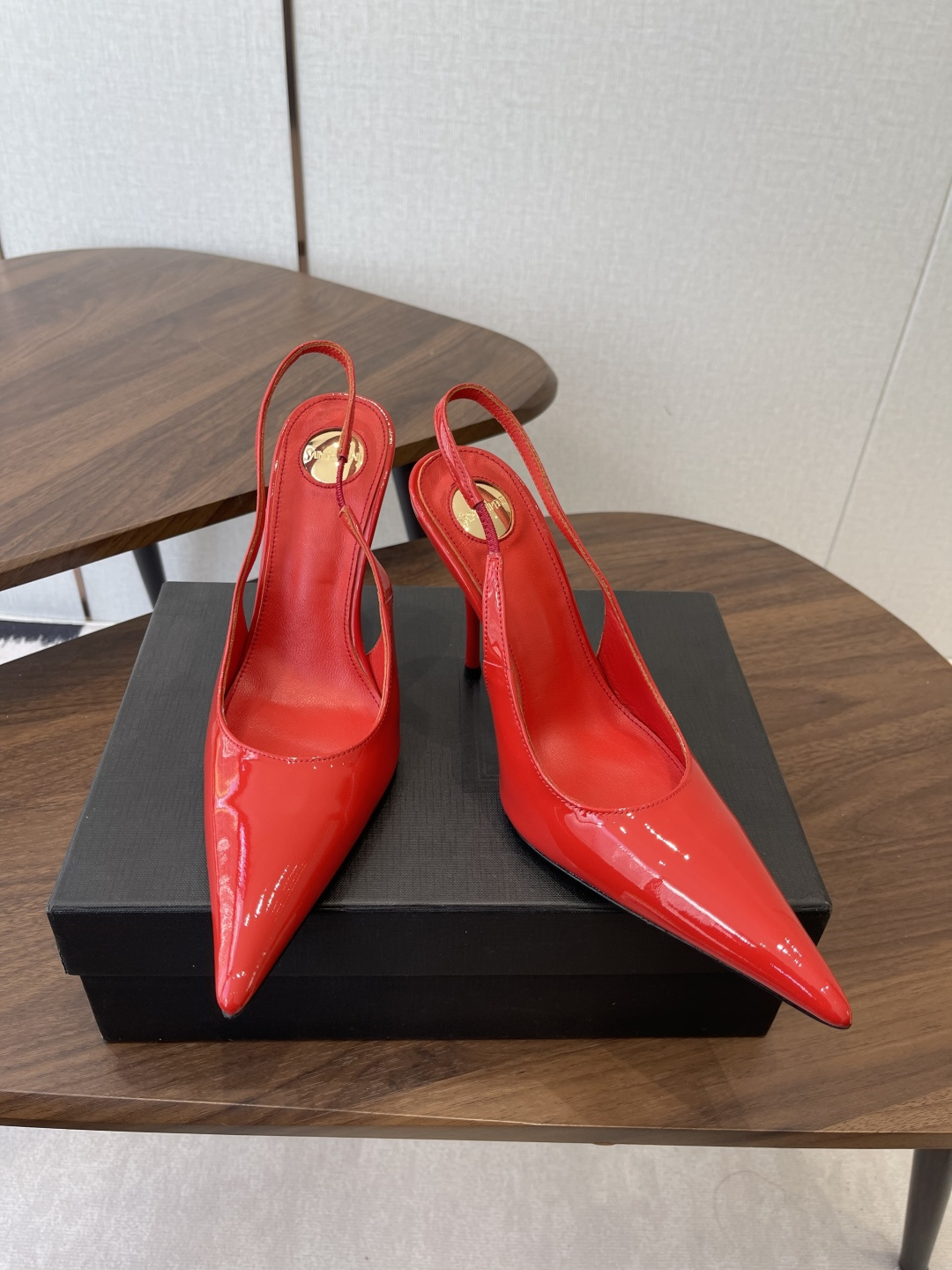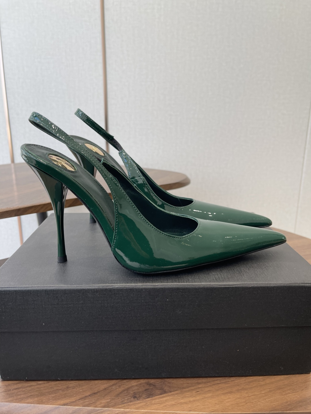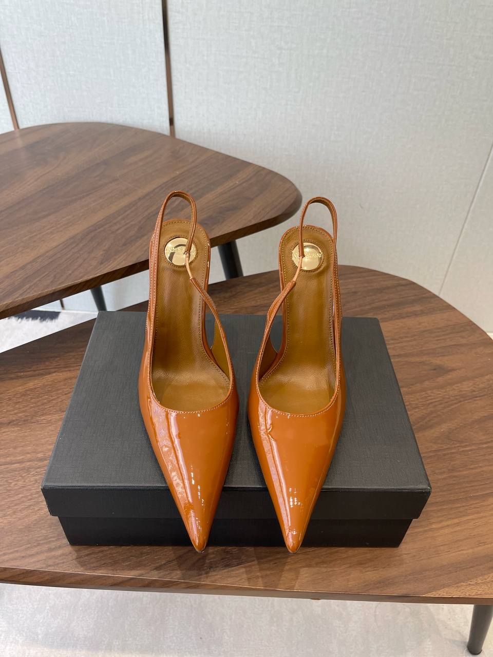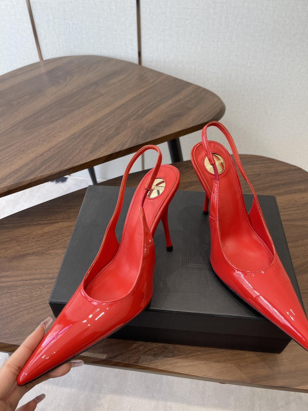 Изысканные туфли‑лодочки от Saint Laurent в лаковой коже насыщенного терракотового оттенка. Элегантный зауженный носок и тонкий шпильковый каблук 10 см создают классический силуэт, а открытая пятка со стрейч‑ремешком обеспечивает женственный и лёгкий образ. Идеальный вариант для вечернего выхода и для утончённого офисного стиля.