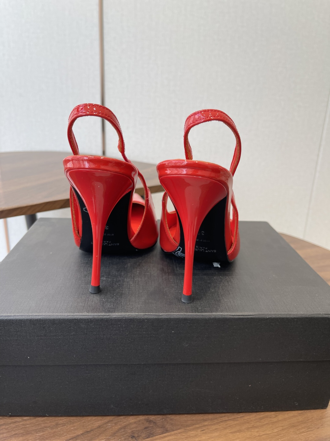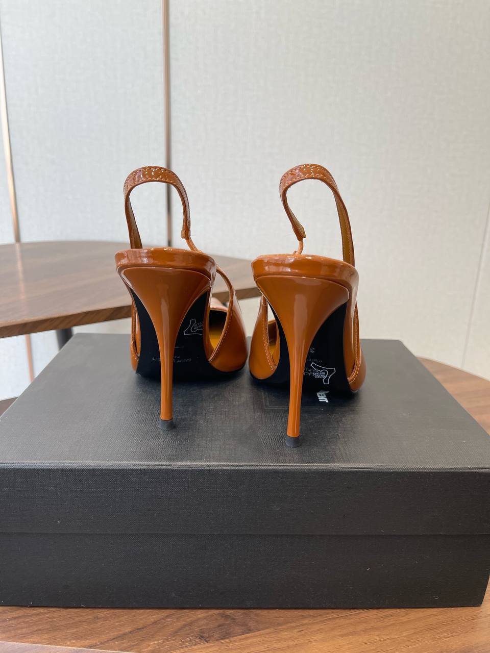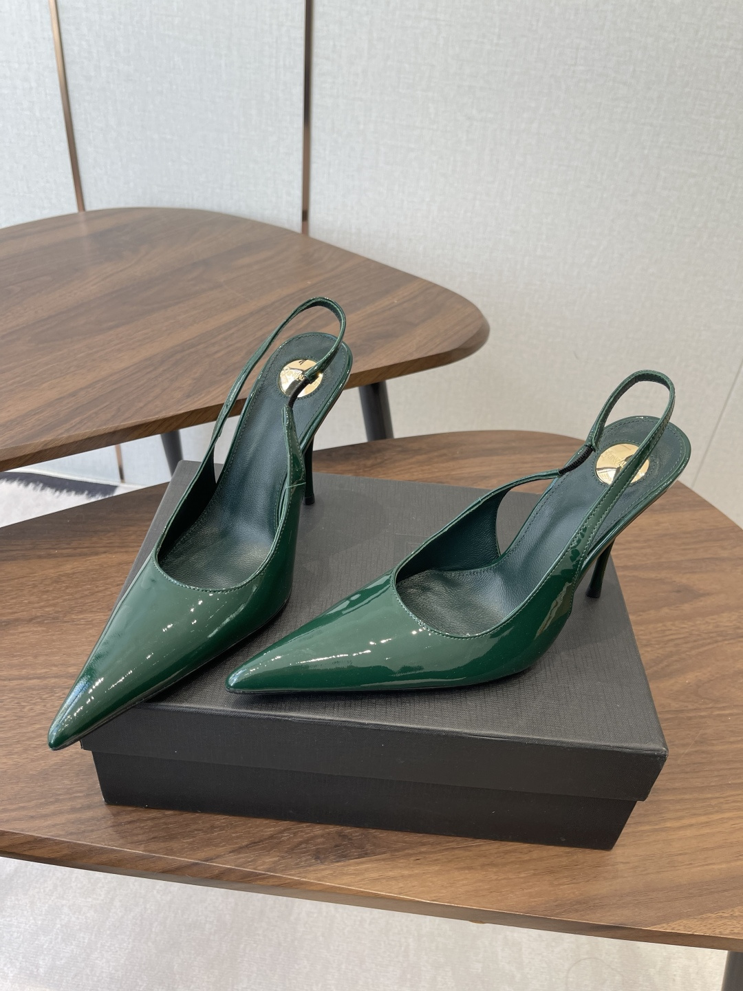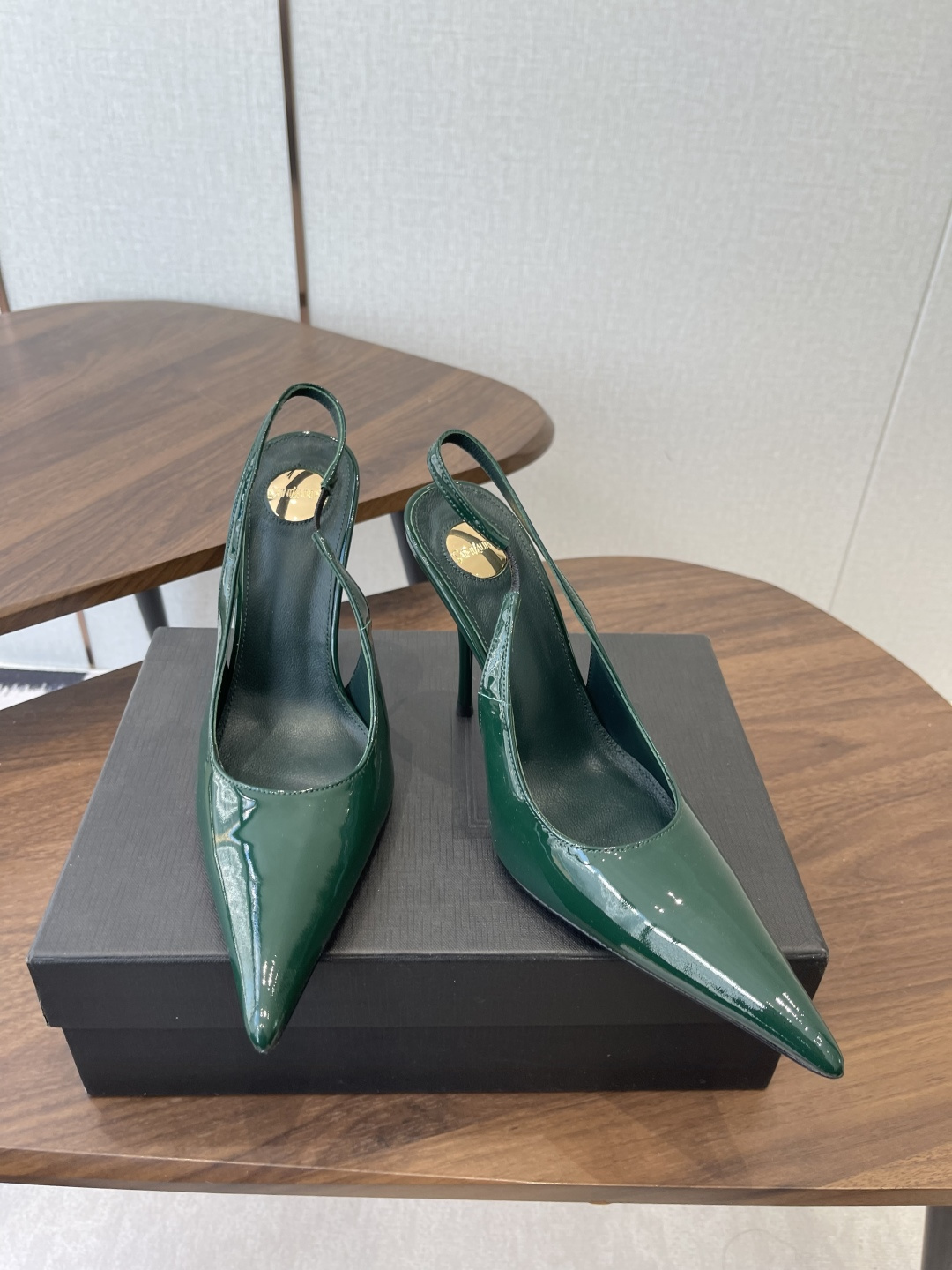 Изысканные туфли‑лодочки от Saint Laurent в лаковой коже насыщенного терракотового оттенка. Элегантный зауженный носок и тонкий шпильковый каблук 10 см создают классический силуэт, а открытая пятка со стрейч‑ремешком обеспечивает женственный и лёгкий образ. Идеальный вариант для вечернего выхода и для утончённого офисного стиля.