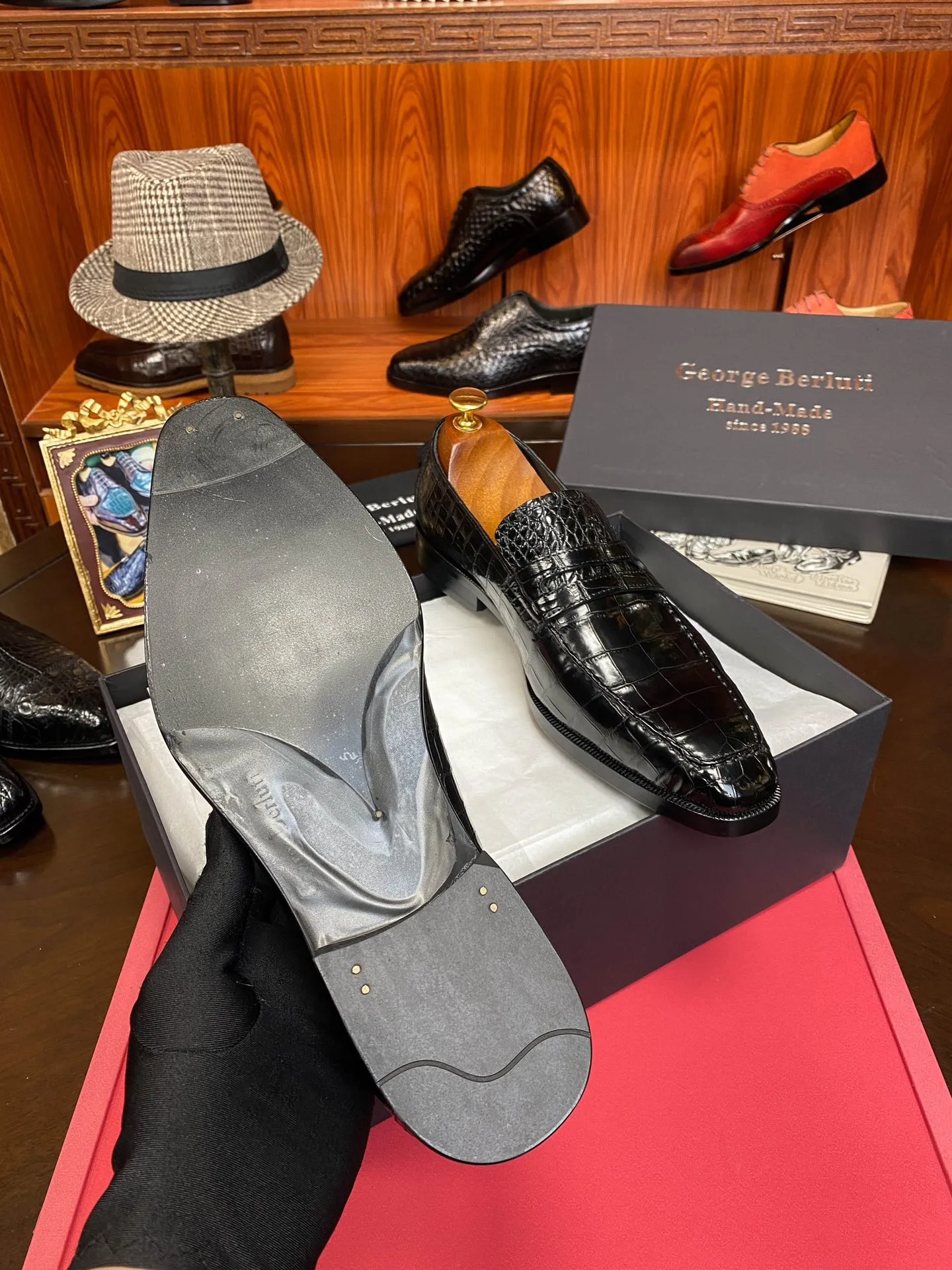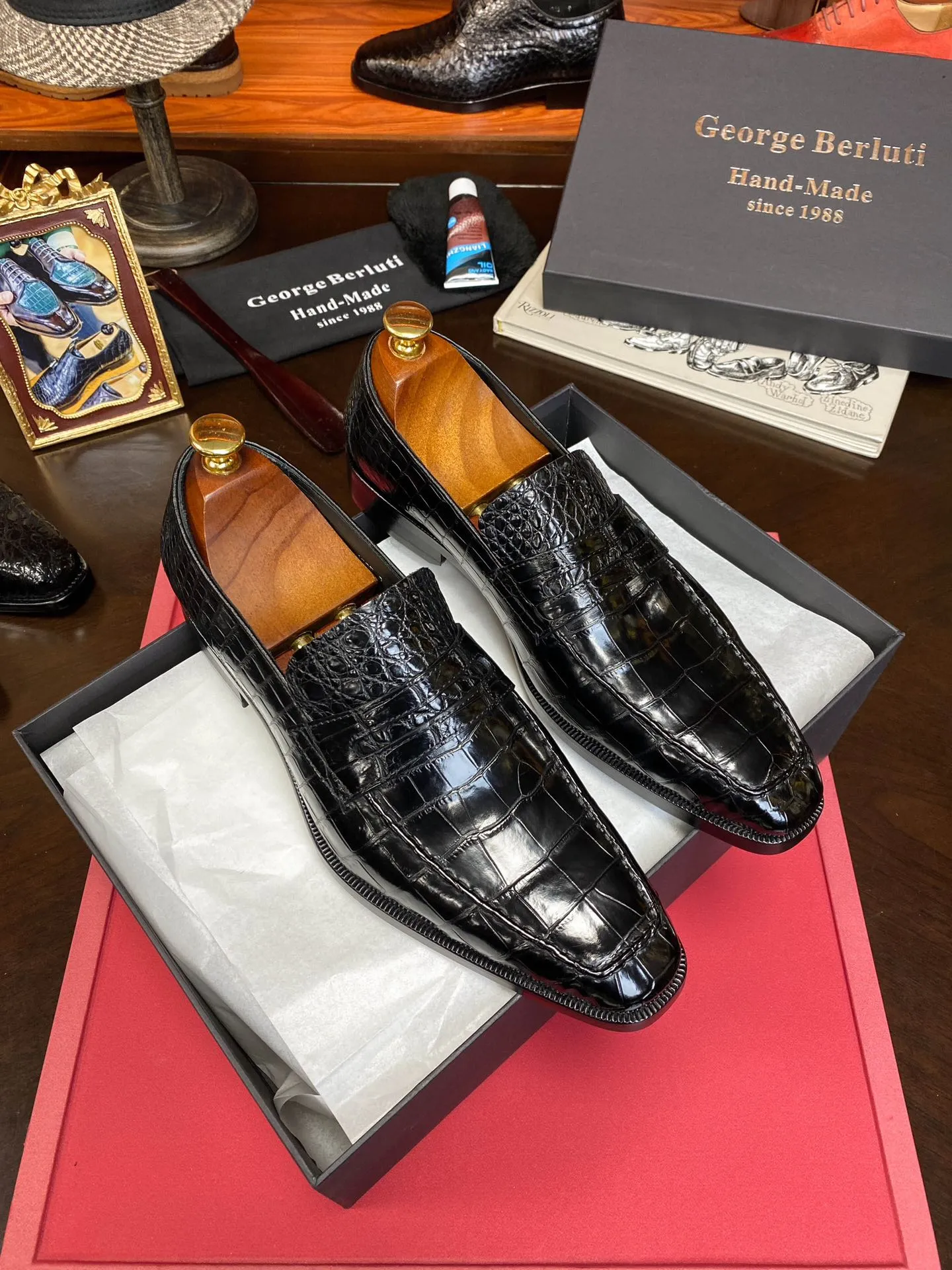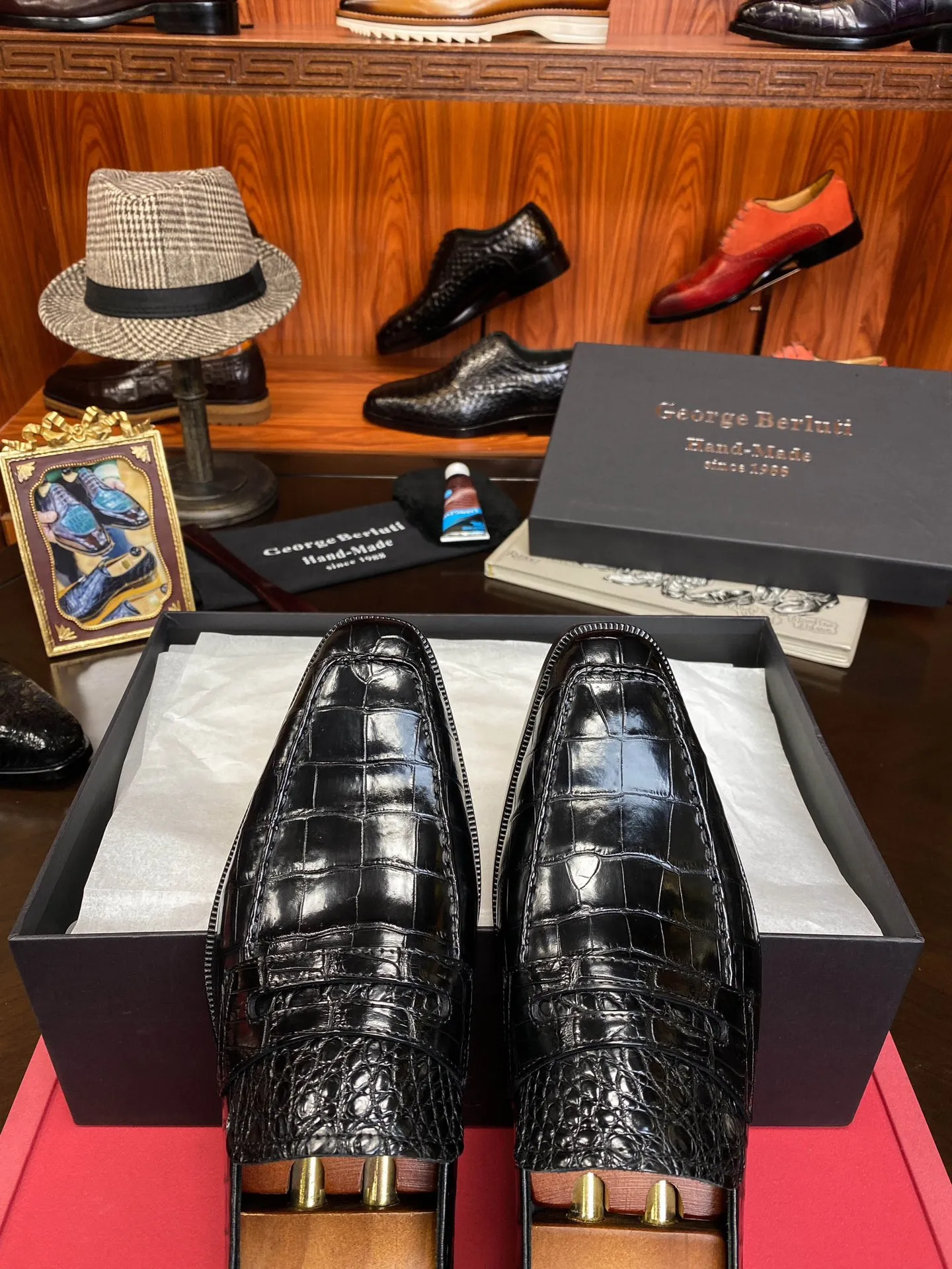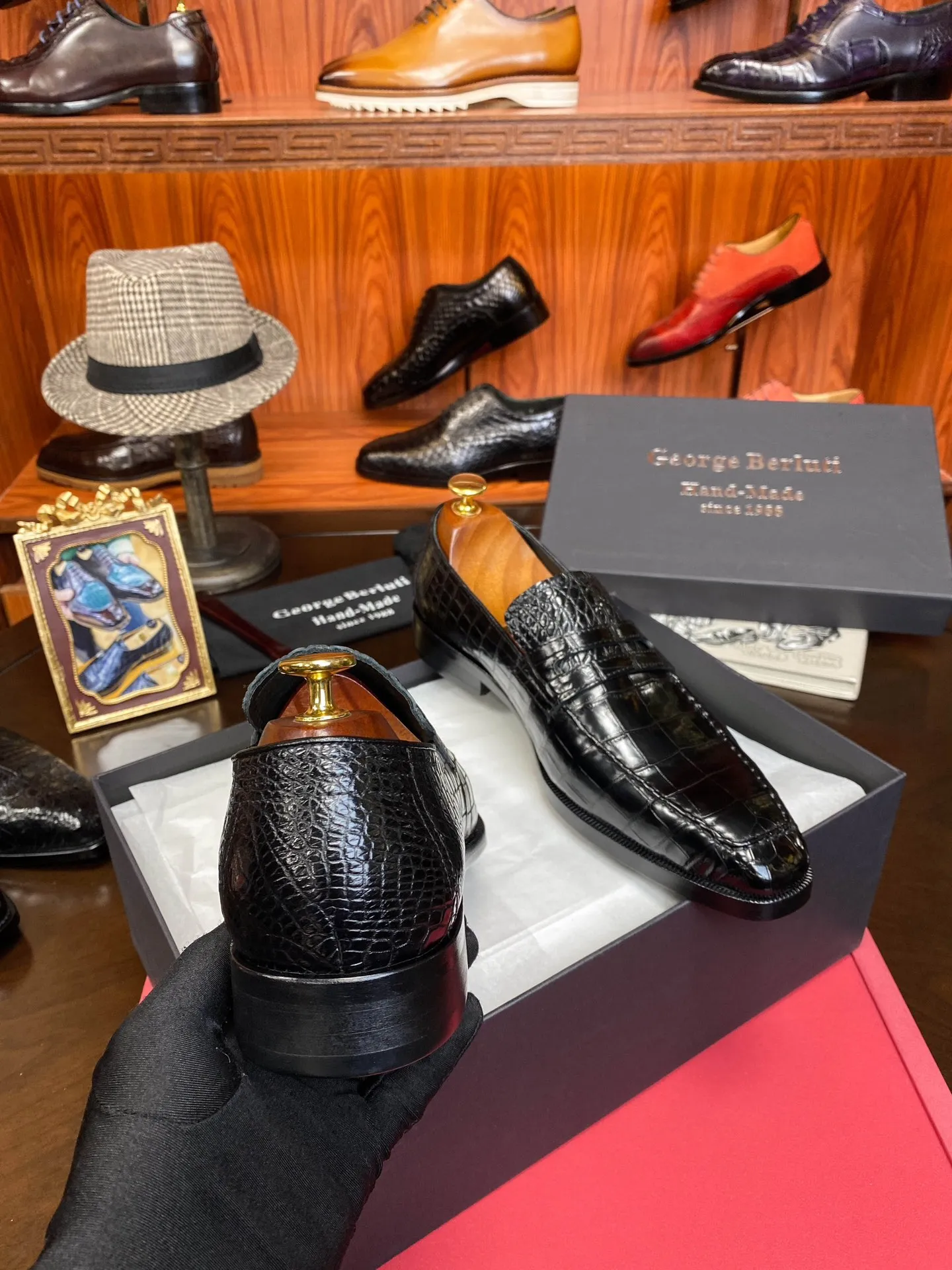 Современные мужские туфли Berluti из брюшка тайского крокодила. Профессионально выполненная изысканная обувь из брюшка крокодила-пеликана для создания джентльменской модели. Сочетается с классическим стилем в одежде, представляющее роскошный образ жизни.
