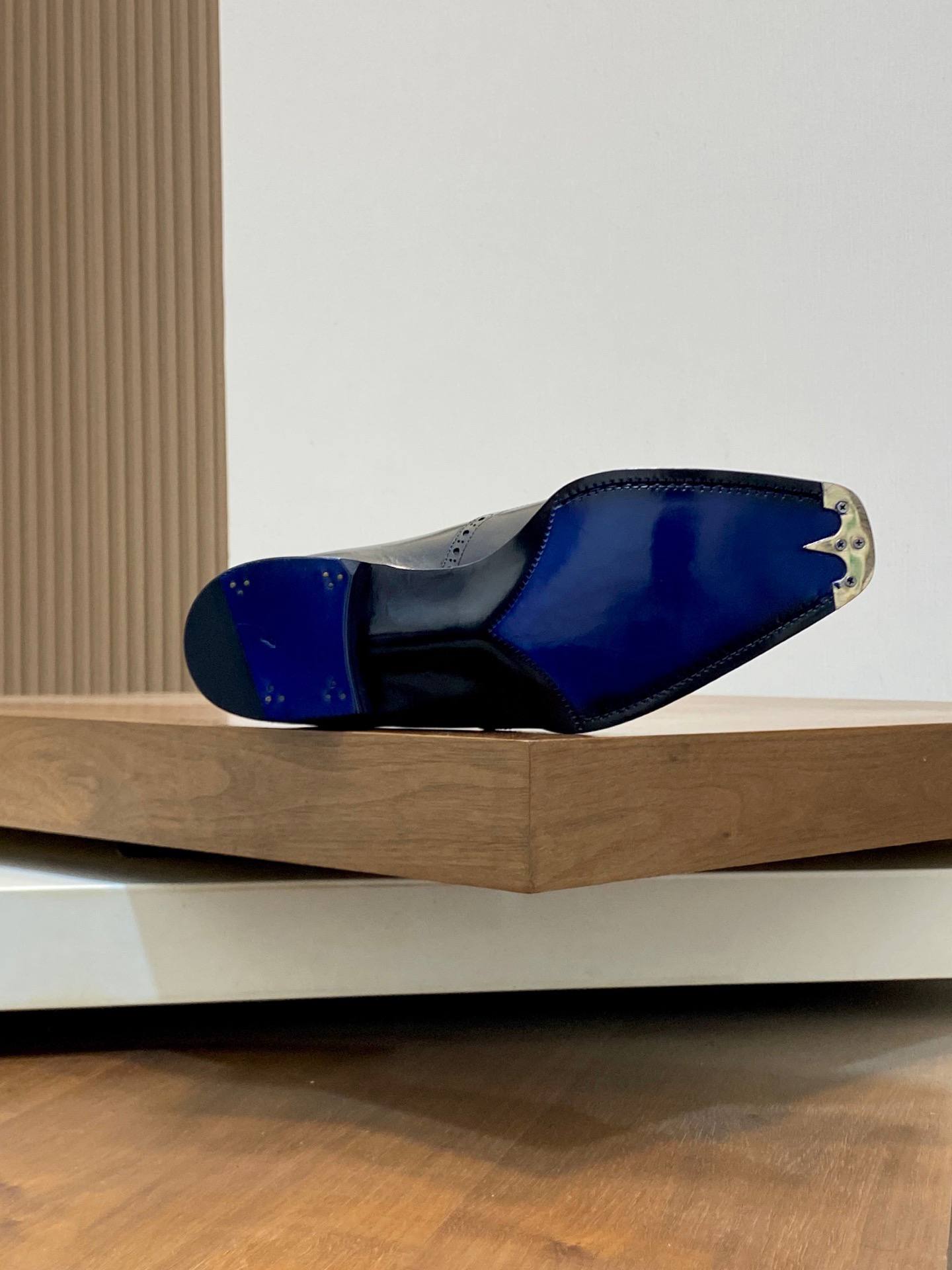 • Верх: премиальная гладкая кожа телятины с насыщенной ручной отделкой и зеркальным блеском, создающим глубокий черный оттенок и легкий эффект «глубины» цвета.