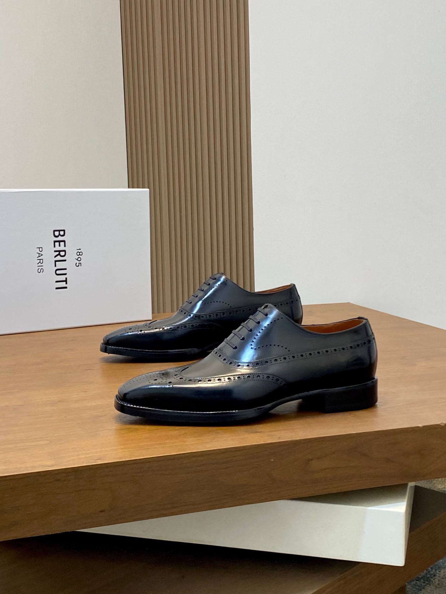 Классические мужские туфли‑ботинки Berluti с закрытой шнуровкой и декоративной перфорацией (brogue). Выполнены из гладкой натуральной кожи с глубокой зеркальной полировкой — элегантная модель для официальных и торжественных образов.