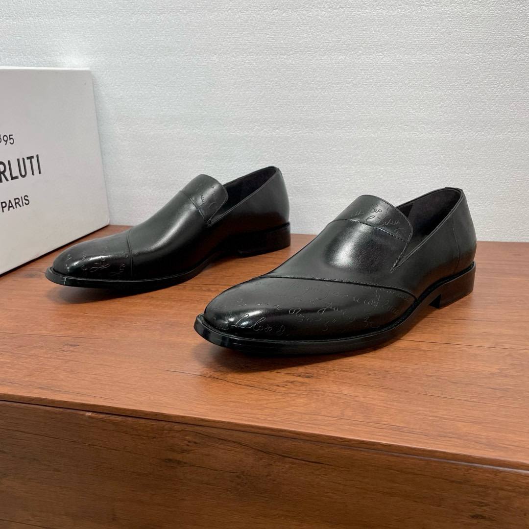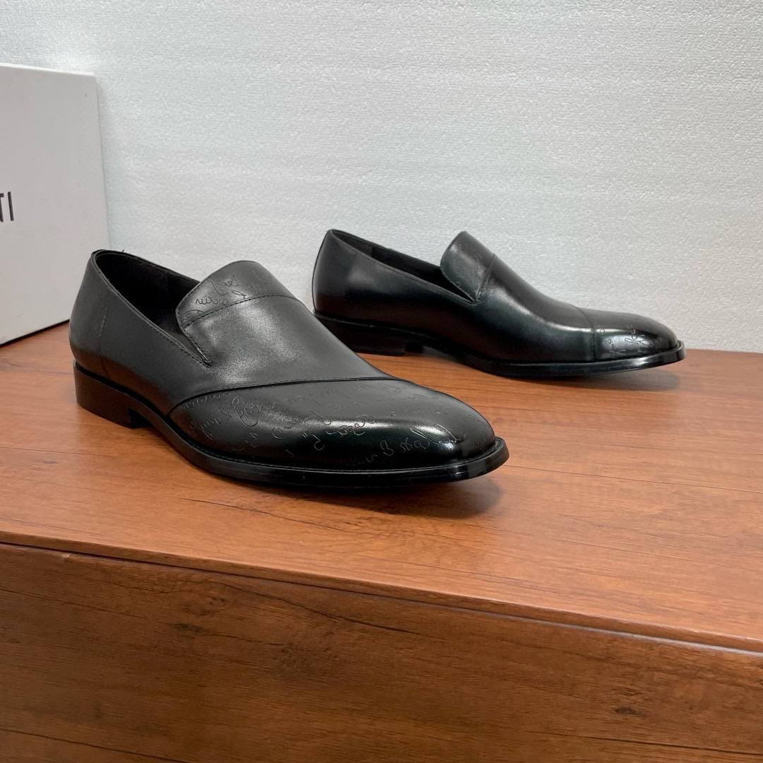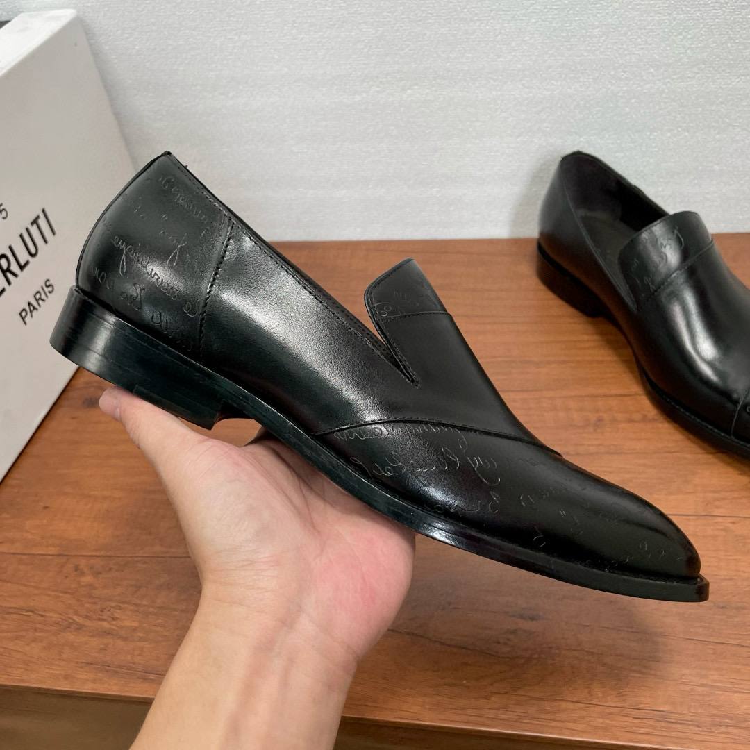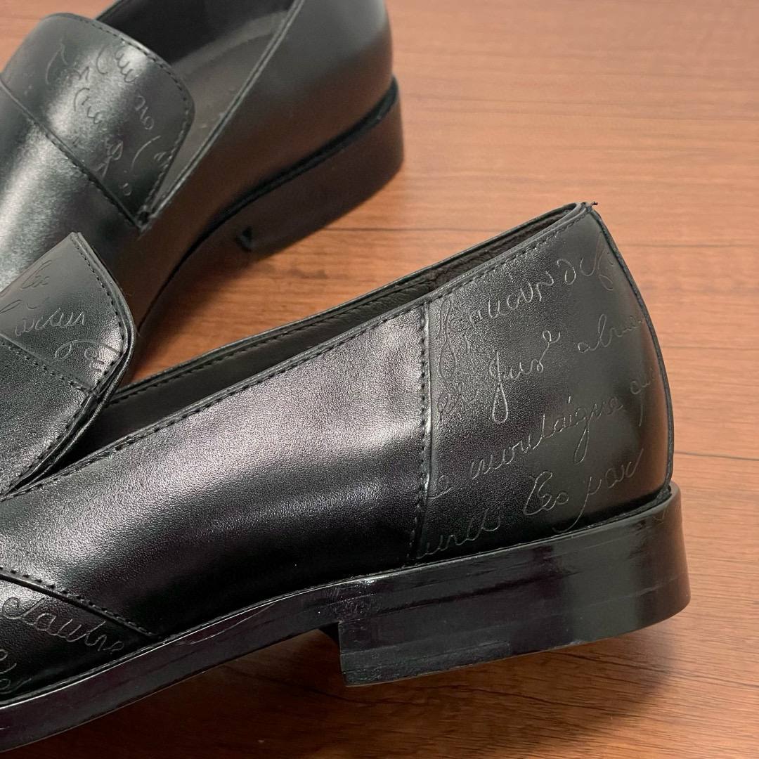 Лоферы сшиты из натуральной телячьей кожи — гладкой, эластичной и долговечной, с рельефным тиснением монограммы BERLUTI на верхней части диагональный узор, имитирующий фирменный паттерн бренда, добавляющим тактильность и уникальность. Дизайн классический: без шнуровки для лёгкого надевания, квадратный носок с глянцевым финишем, низкий каблук и облегающий силуэт.