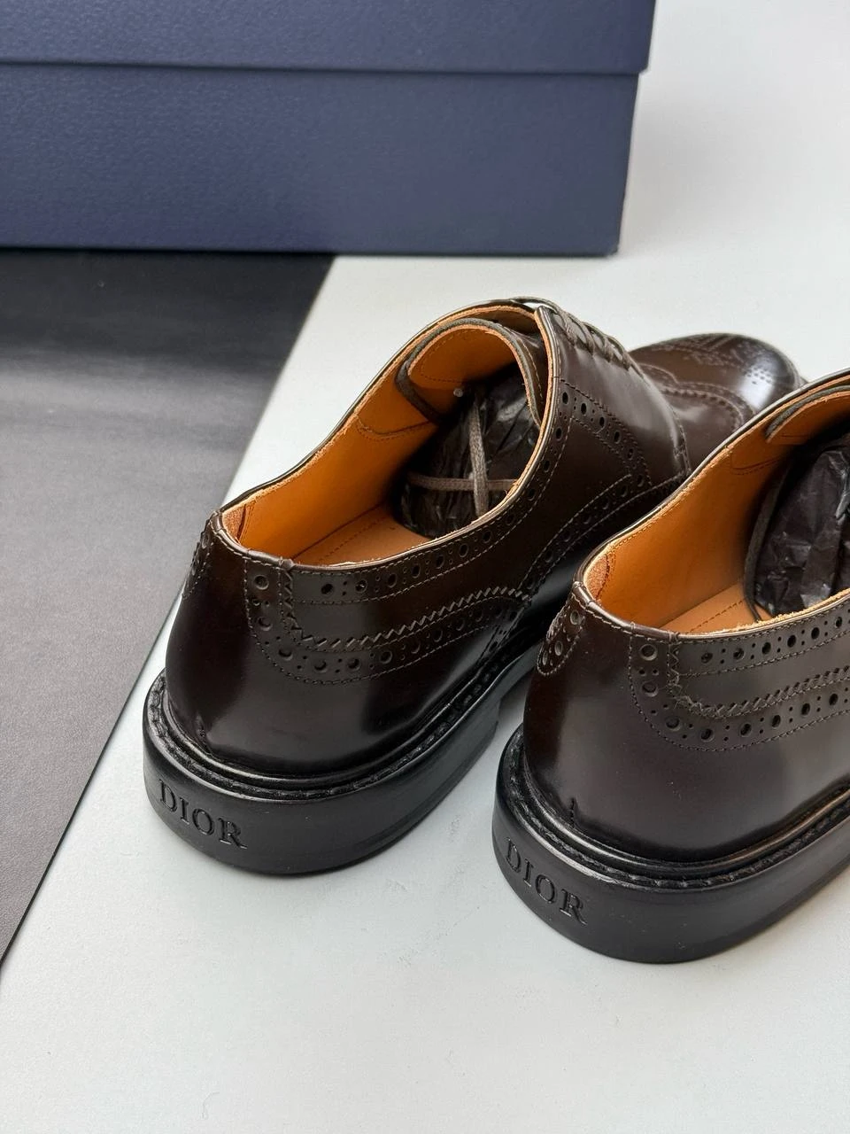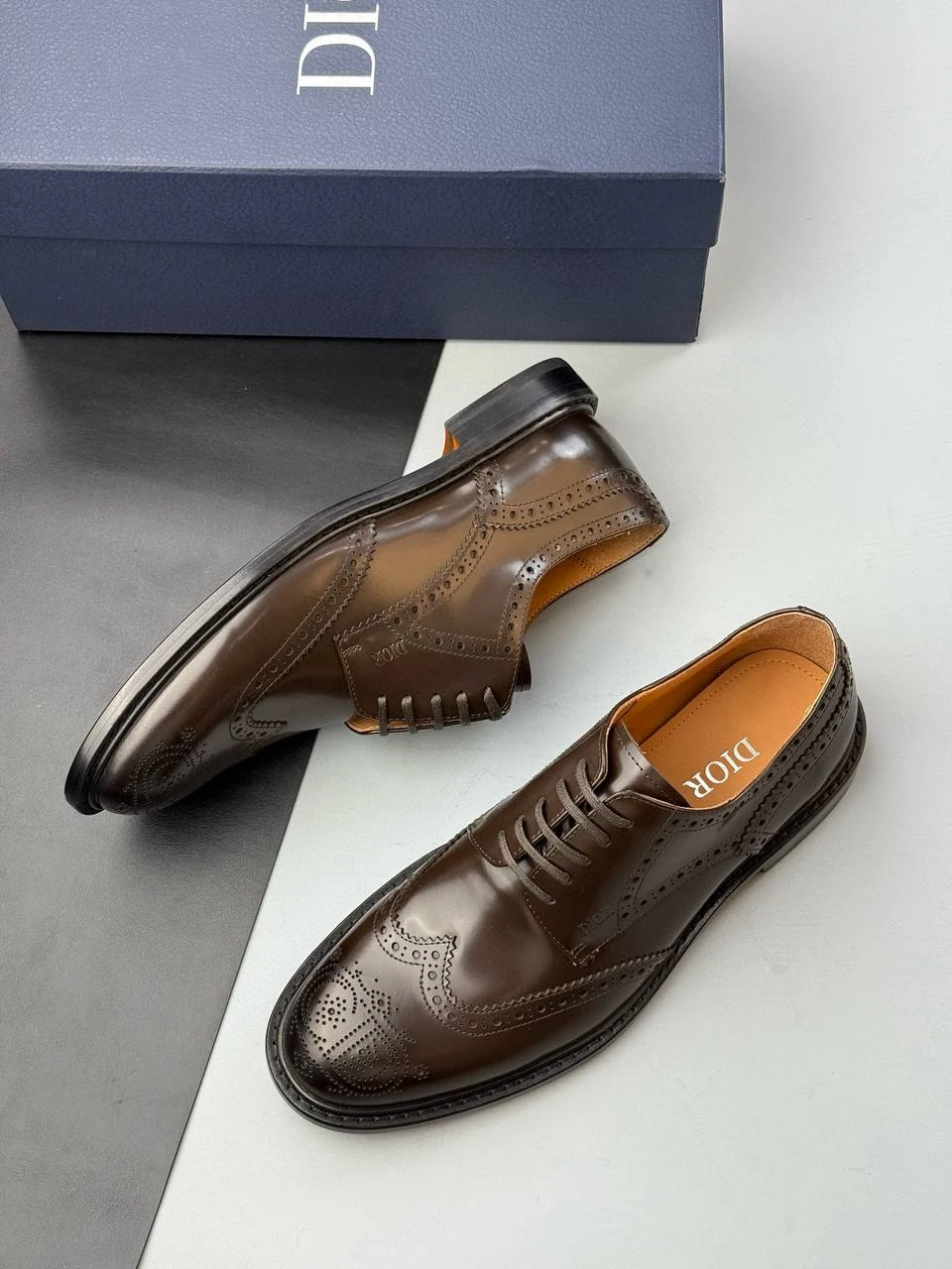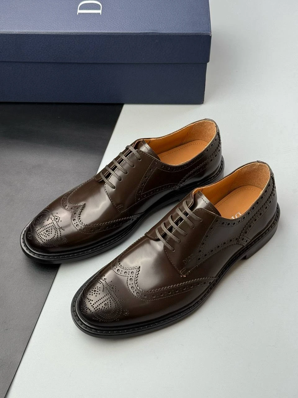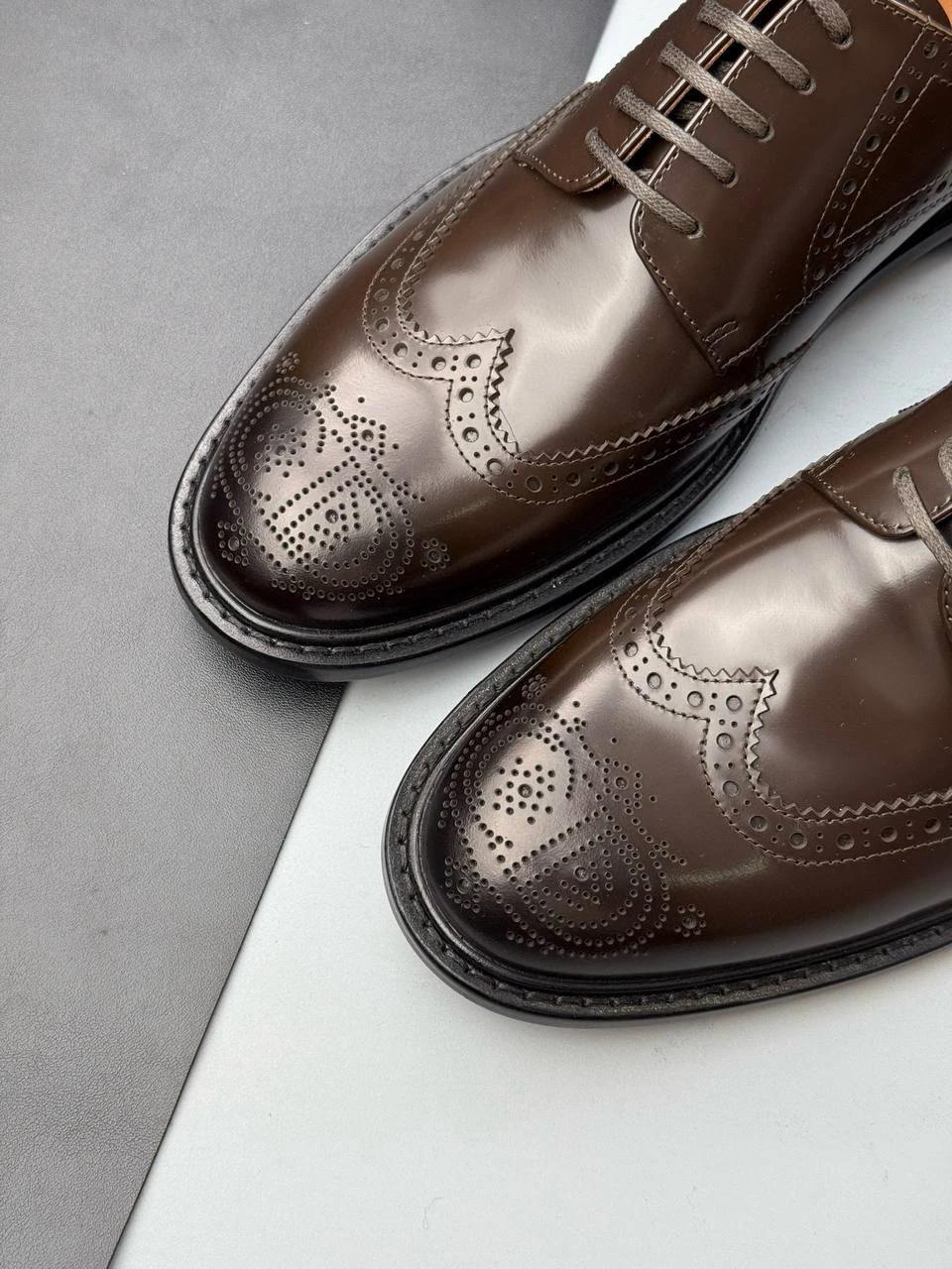 Элегантные мужские туфли от Christian Dior — образец безупречного стиля и высокого качества исполнения. Модель представлена в классическом коричневом оттенке, который легко сочетается с деловыми и повседневными образами. Туфли выполнены из первоклассной натуральной кожи с эффектом глянца, что придает им роскошный внешний вид. Декоративная перфорация с фирменным узором на мысе, боковых частях и пятке подчеркивает изысканность дизайна и отсылает к традиционному стилю брогов.