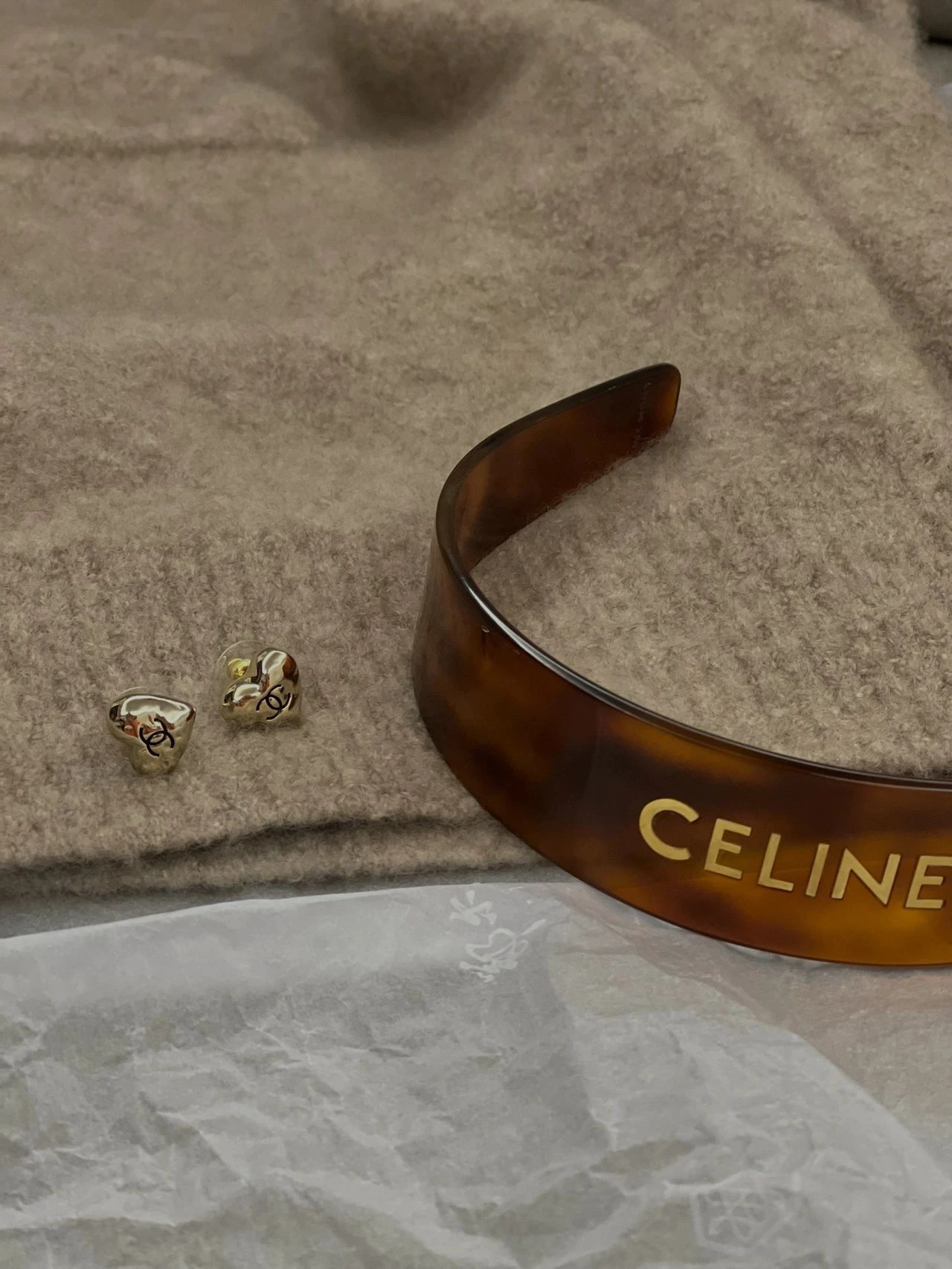 Элегантный и сдержанный ободок CELINE — идеальный аксессуар для тех, кто ценит минимализм с ярким акцентом. Глянцевая коричнево-черепаховая фактура и объёмные золотистые буквы CELINE создают роскошный, но универсальный образ, подходящий как для повседневных, так и для вечерних нарядов.