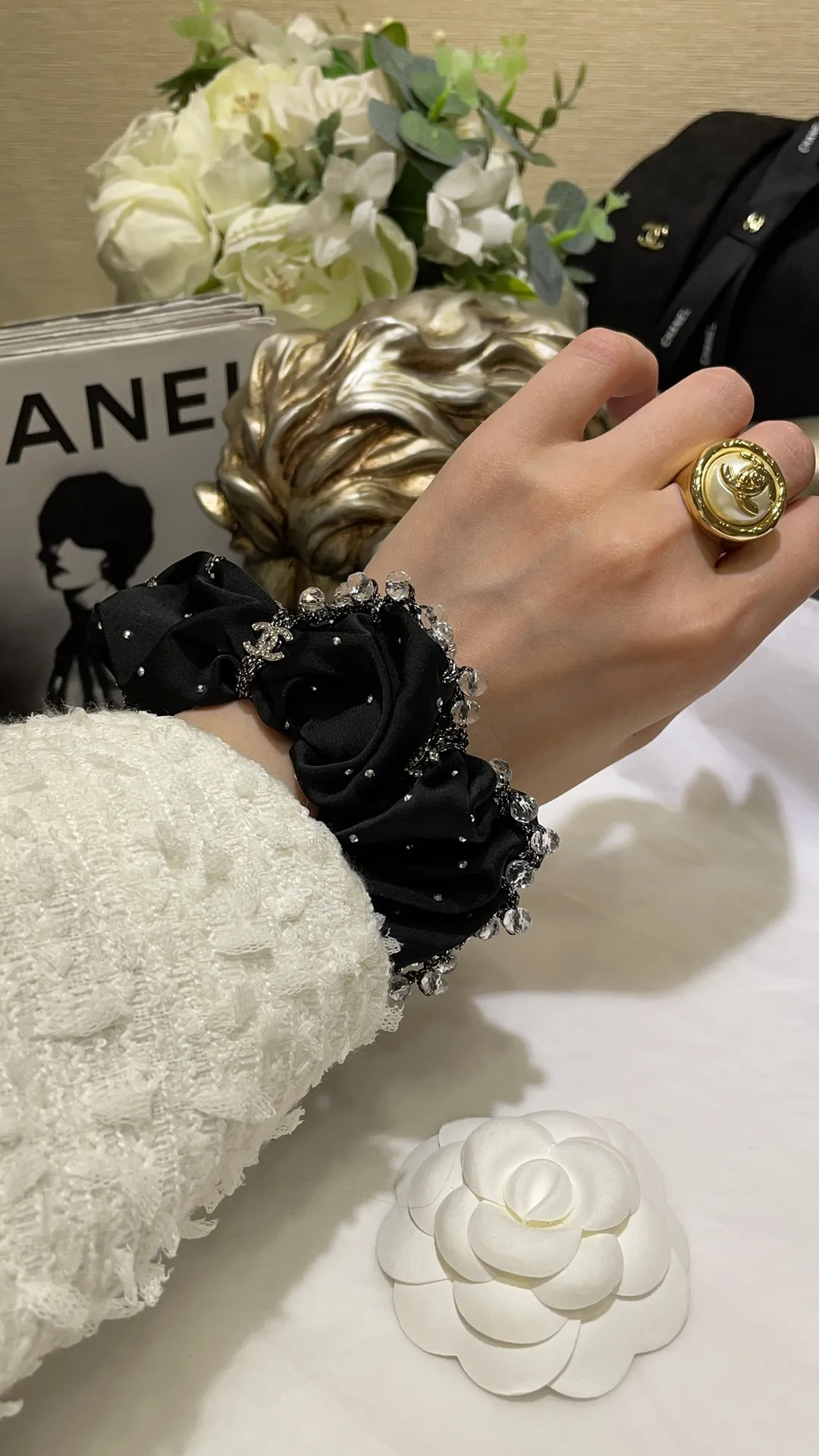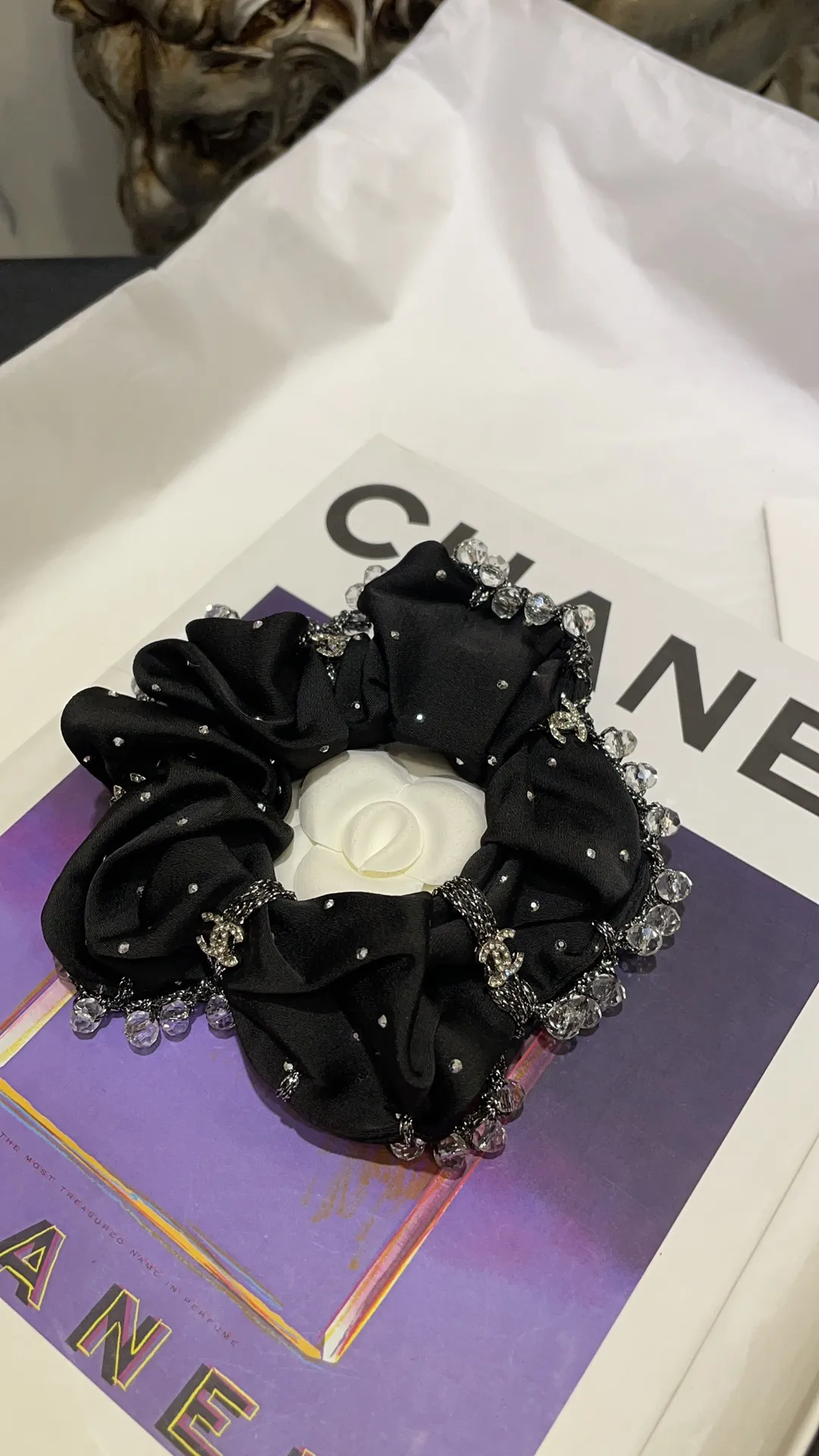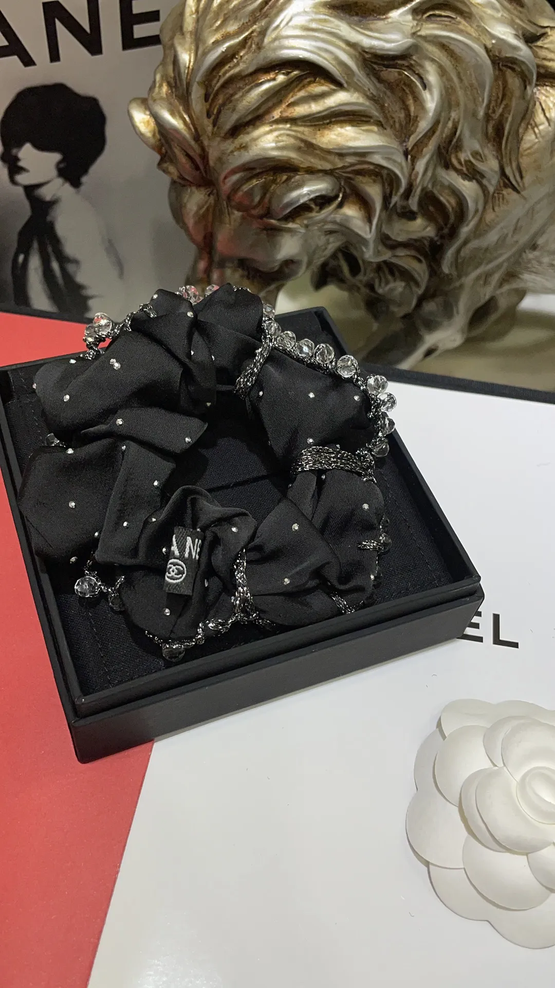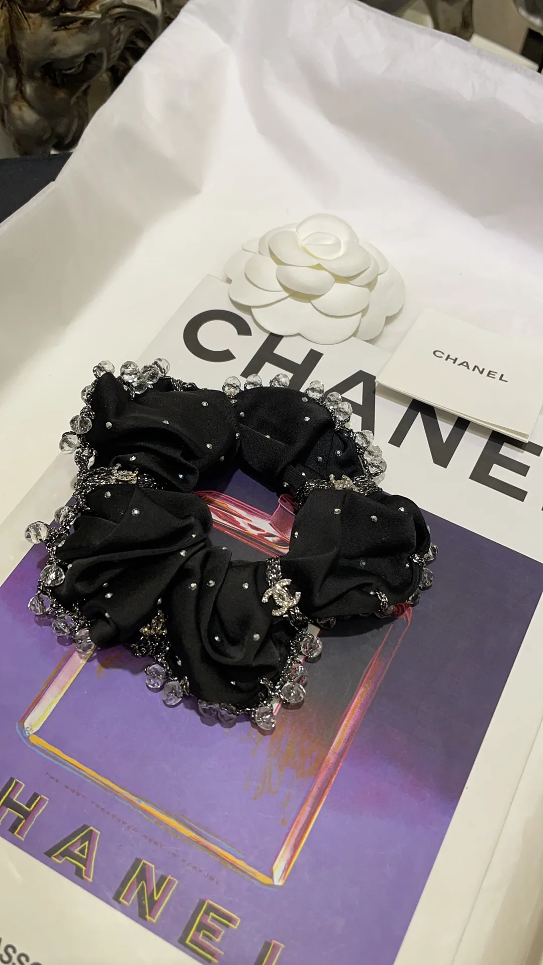 Женская резинка для волос от Chanel, украшенная кристаллами Сваровски, представляет собой стильный аксессуар, который сочетает в себе функциональность и эстетику. Такой аксессуар можно использовать как для создания причесок, так и в качестве браслета на запястье, что делает его универсальным дополнением к любому образу.