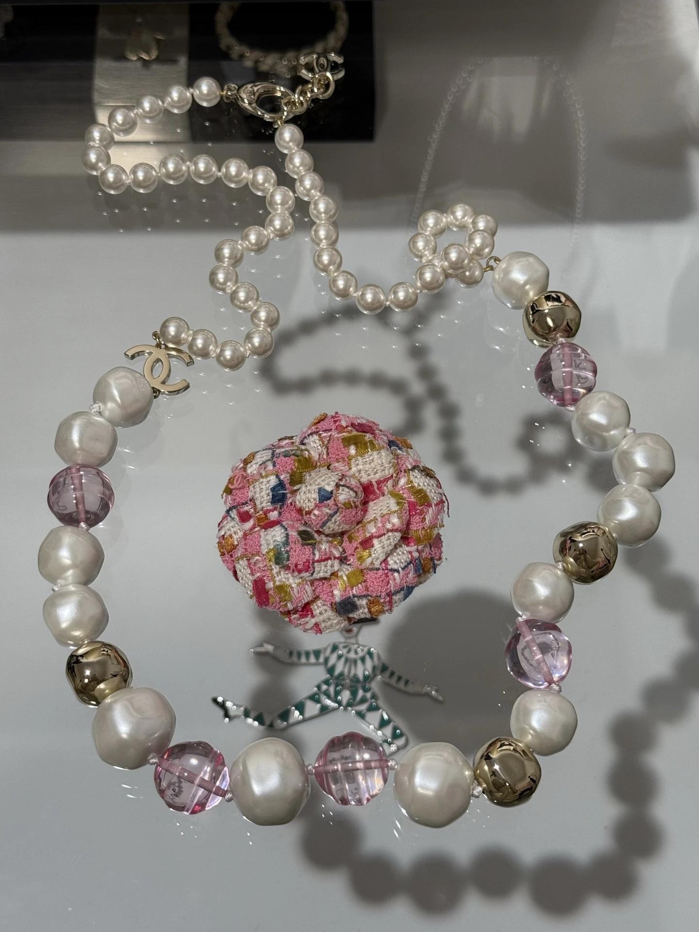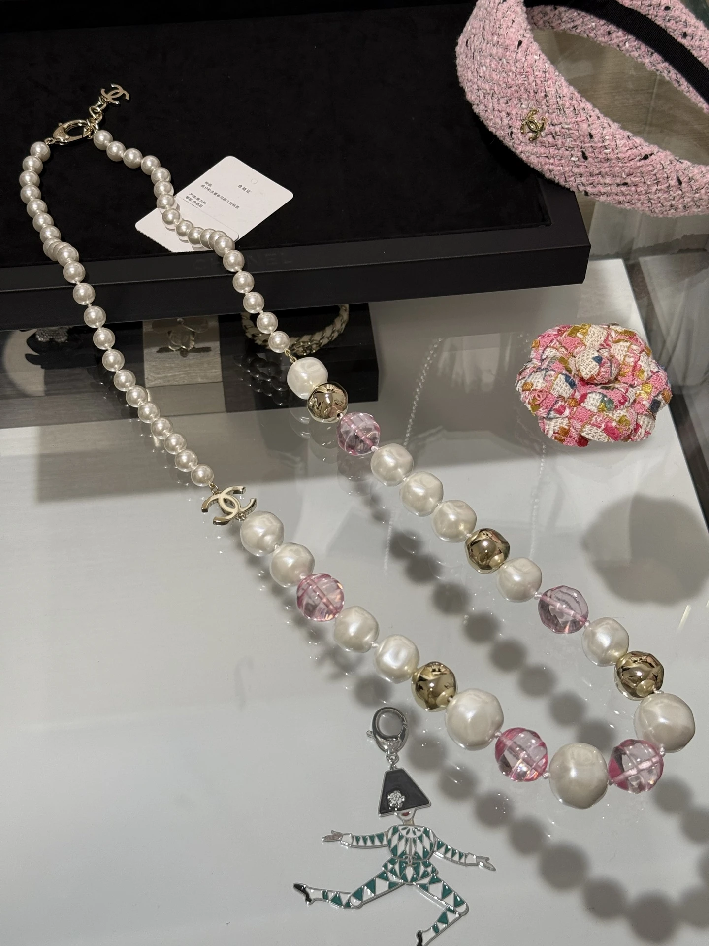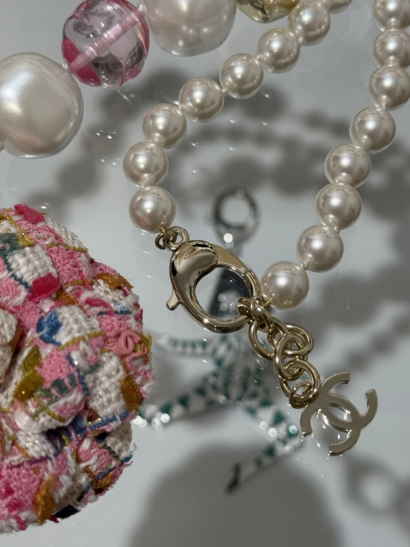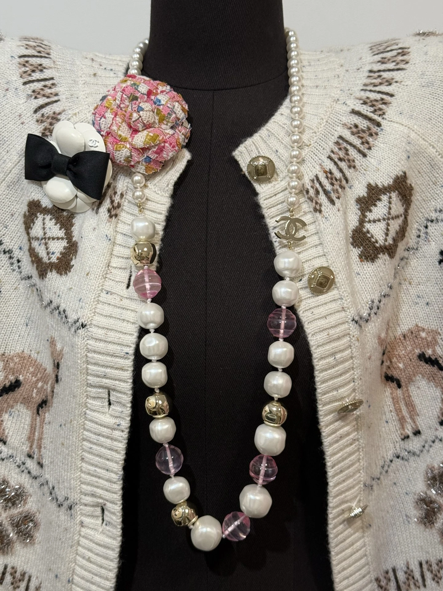 Элегантное длинное колье от Chanel — выразительный аксессуар, который привлекает внимание сочетанием классических и фирменных элементов. Изделие выполнено из металла, декорированного имитацией жемчуга, что создаёт эффектный контраст между металлическим блеском и мягким перламутровым сиянием жемчужных бусин.