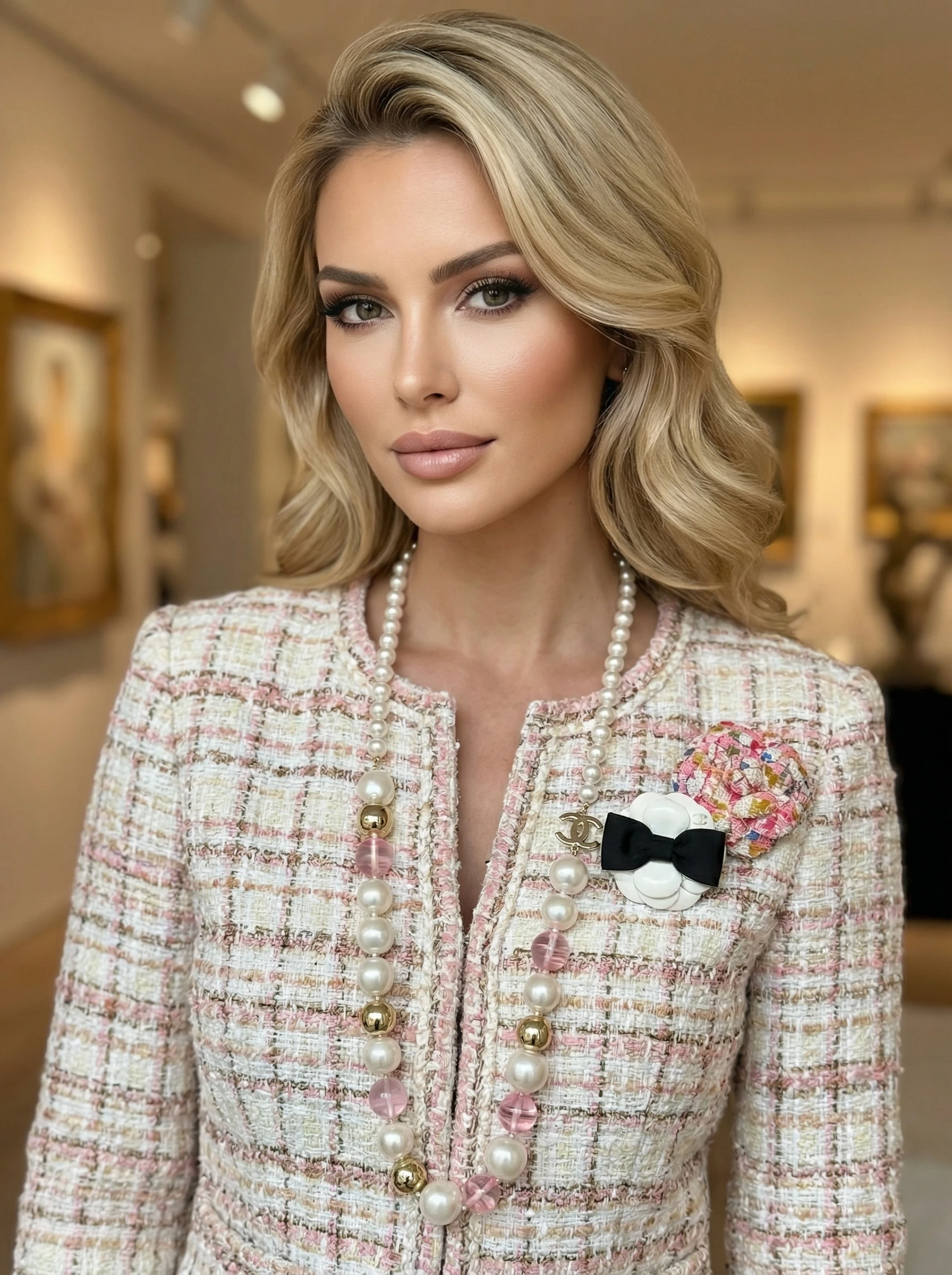 Дизайн украшения выдержан в золотистых, жемчужно‑белых тонах, что делает его универсальным для множества образов — от вечерних ансамблей до более стильных повседневных луков.