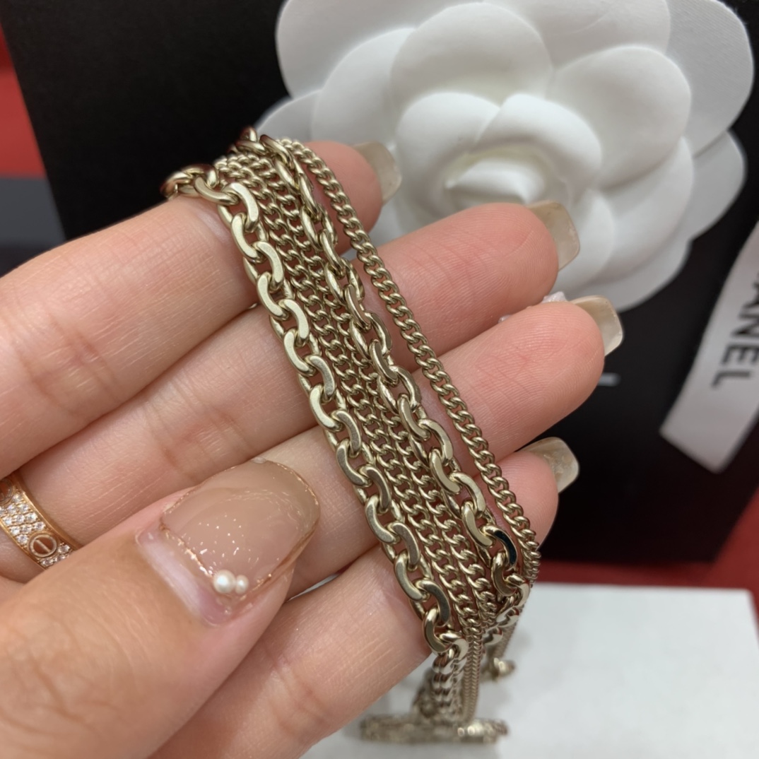 Женское многослойное колье CHANEL — элегантная бижутерия для создания выразительного образа. Три звеньевых цепочки разной фактуры и толщины гармонично сочетаются между собой, центральный элемент — культовый логотип CC с декоративной текстурой и сияющими вставками — привлекает внимание и завершает композицию. Золотистое напыление придаёт украшению благородный глянцевый оттенок, а мини‑подвеска в виде логотипа на удлиняющем звене позволяет подстроить длину по вашему желанию.