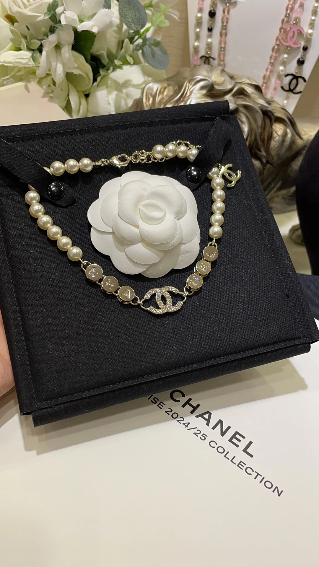 Дизайн: Колье выделяется своим уникальным и запоминающимся дизайном. Центральным элементом является культовый логотип CHANEL, выполненный с вниманием к деталям. Логотип окружён изящными элементами, на которых размещены буквы "CHANEL", что подчеркивает принадлежность украшения к известному бренду.