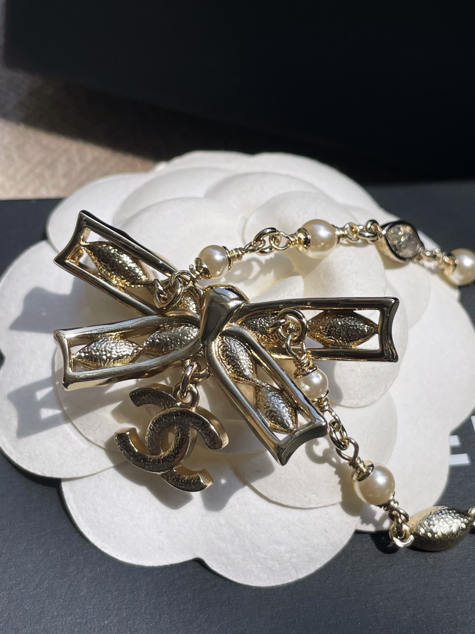 Ожерелье с полым бантом от Chanel — это стильное и элегантное украшение, которое часто ассоциируется с брендом благодаря его культовому дизайну и высокому качеству. Chanel известна своими уникальными аксессуарами, которые могут добавить шарм любому наряду.