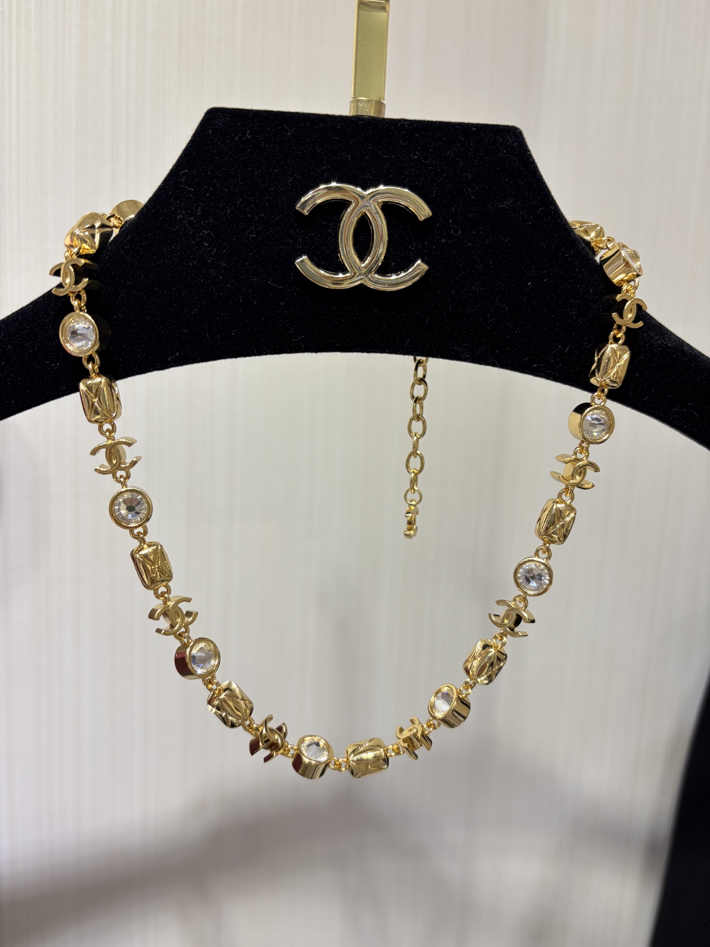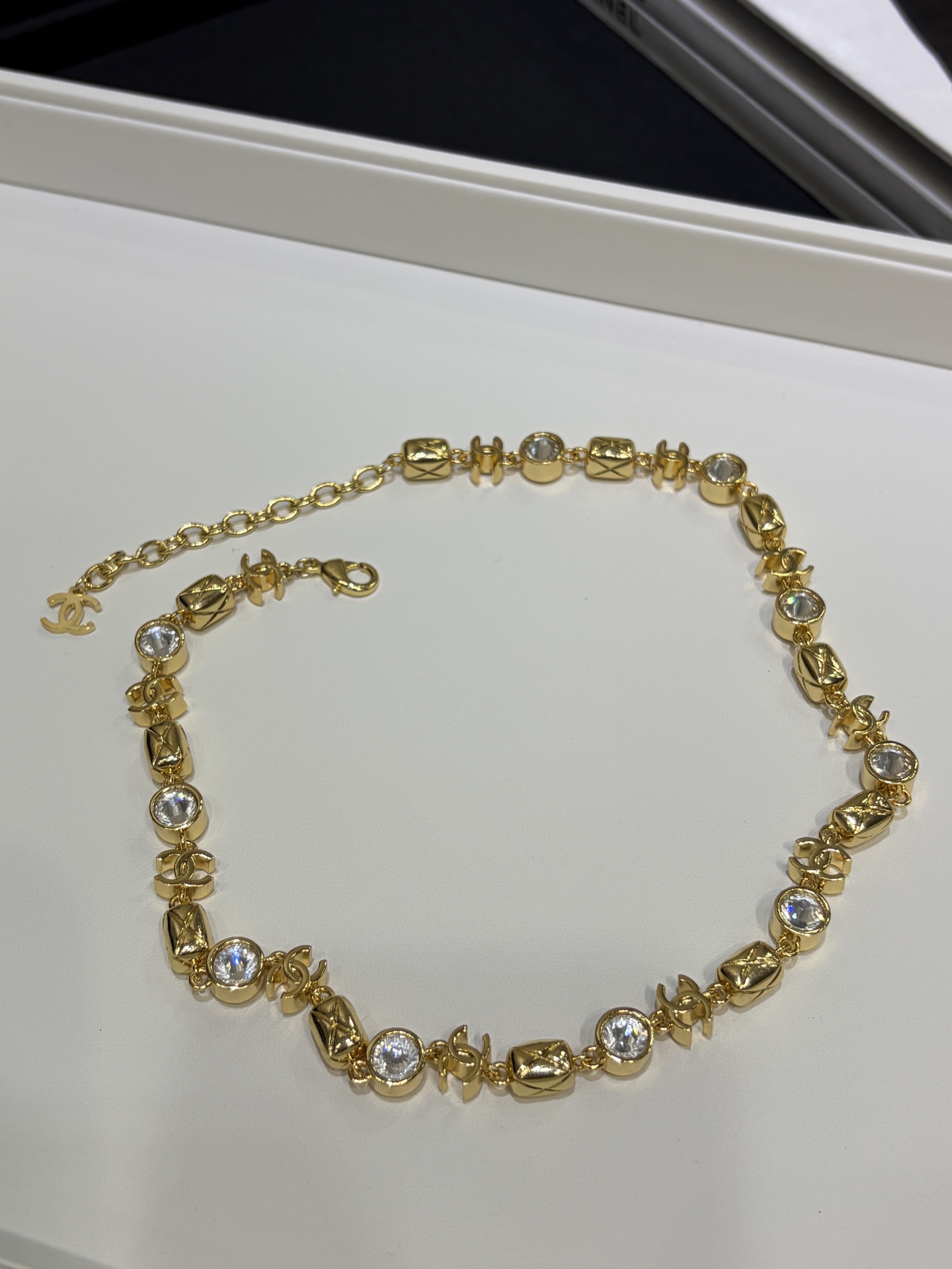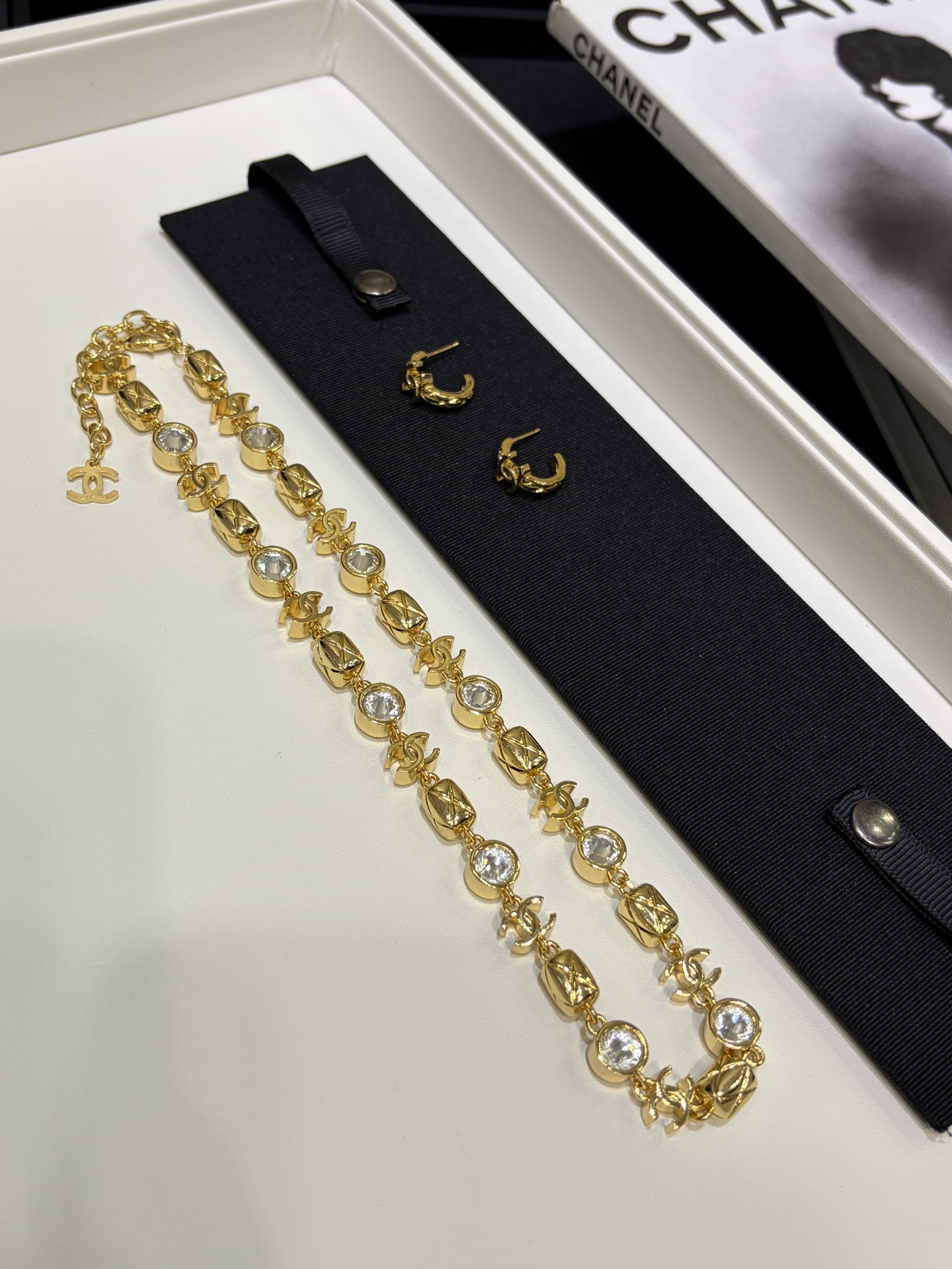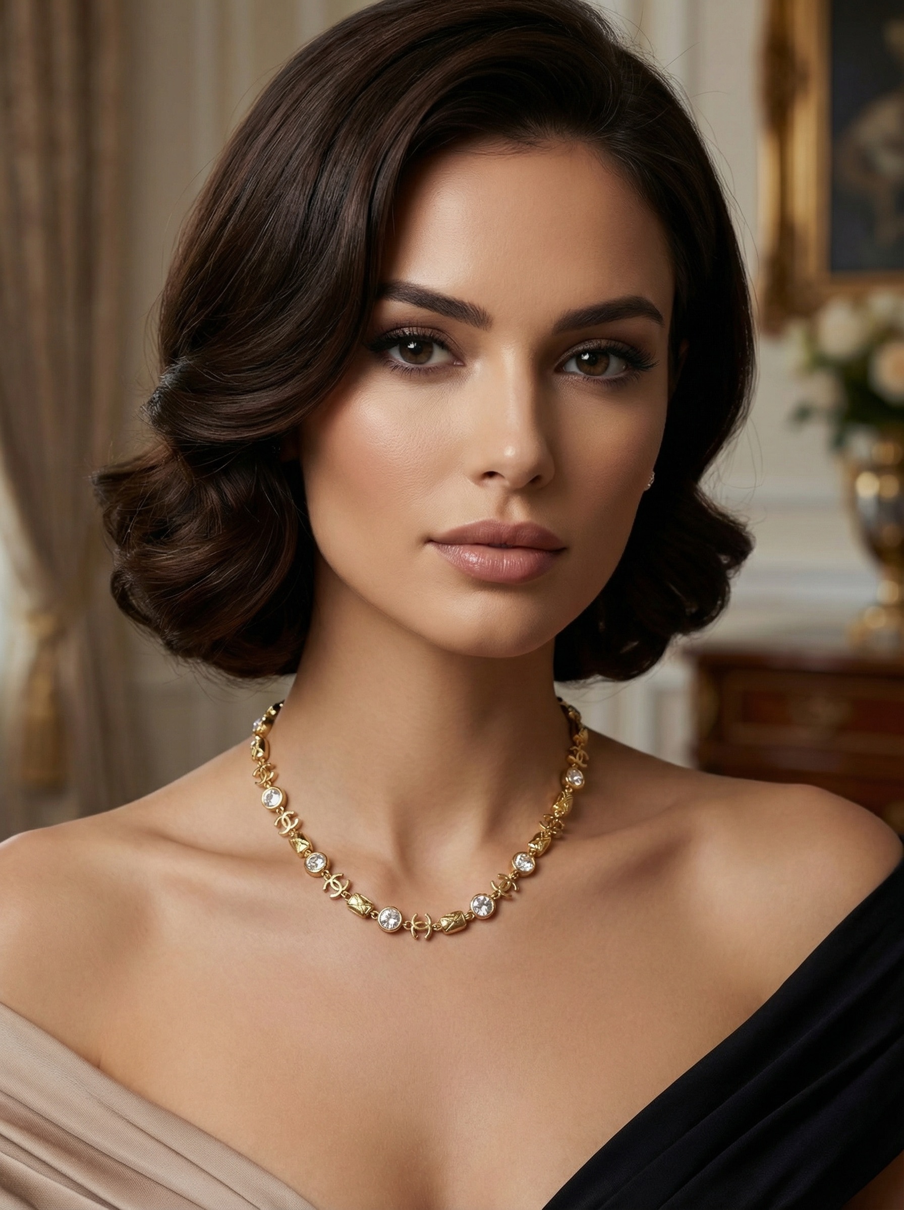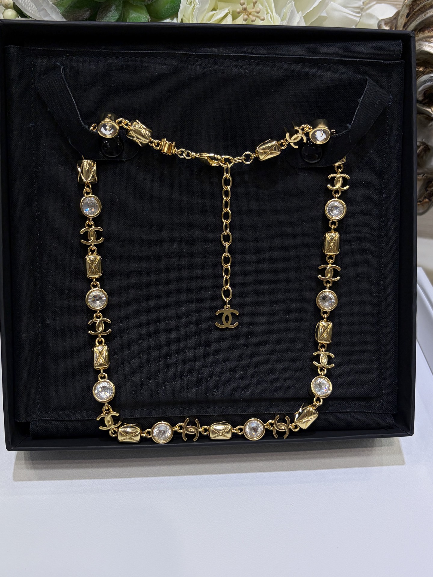 Изысканное колье Chanel сочетает благородный блеск с мерцающими кристаллами, создавая эффект лёгкого сияния, который привлекает взгляд при каждом движении. Эта модель гармонично балансирует между классической элегантностью и современным лоском, делая аксессуар универсальным украшением как для вечерних, так и для более повседневных образов.