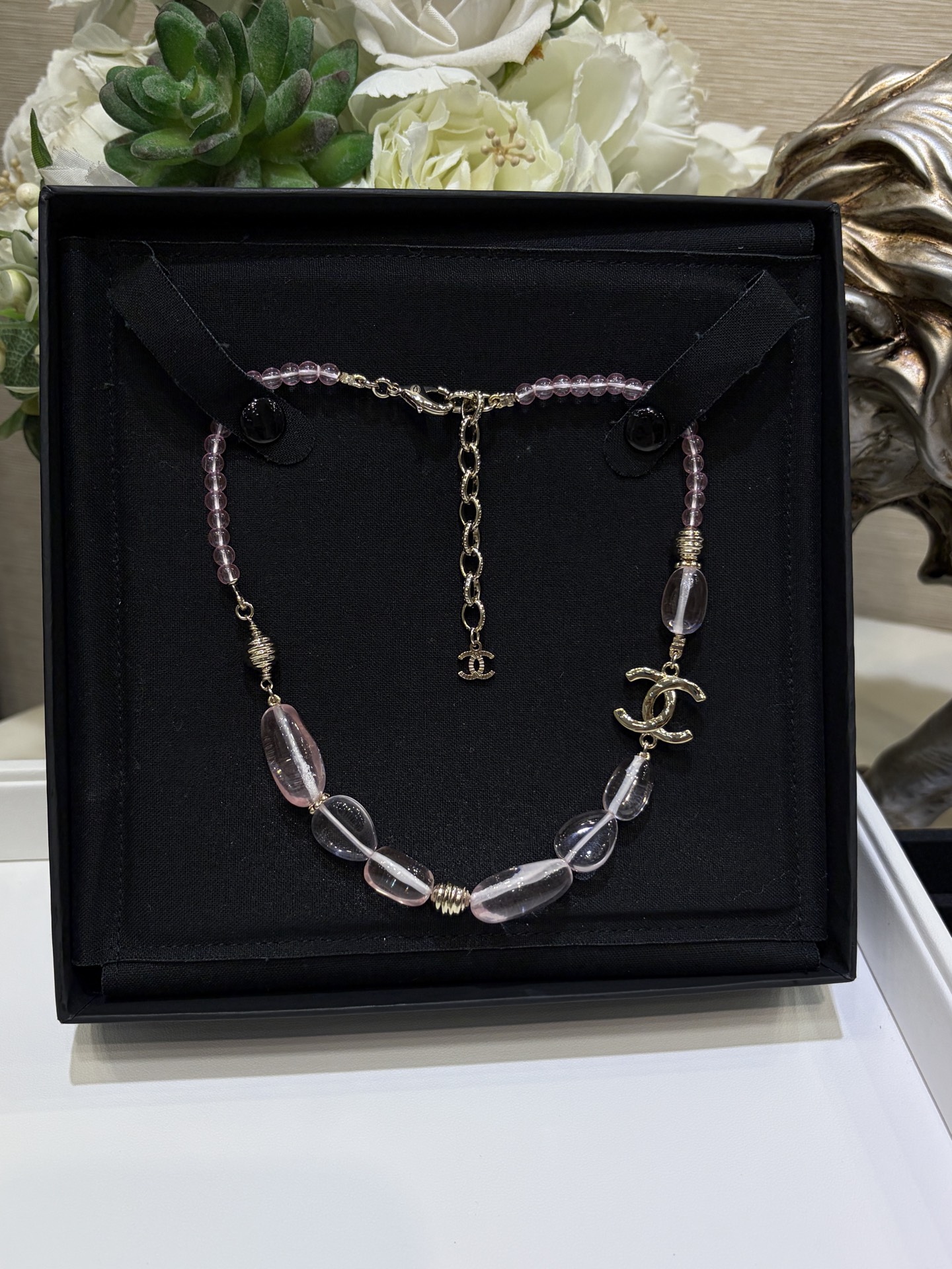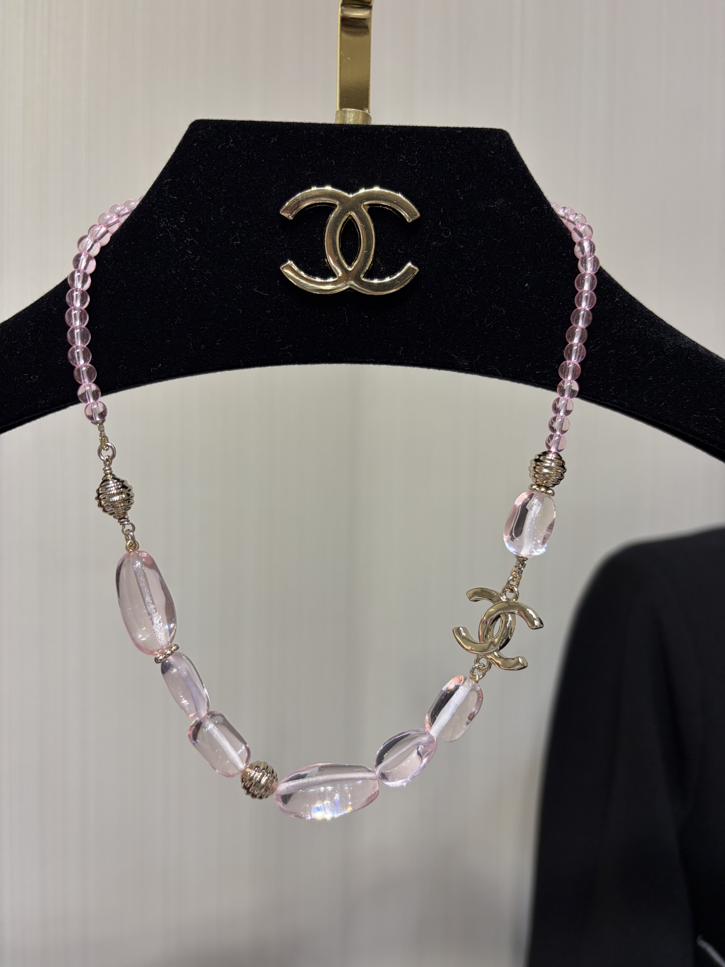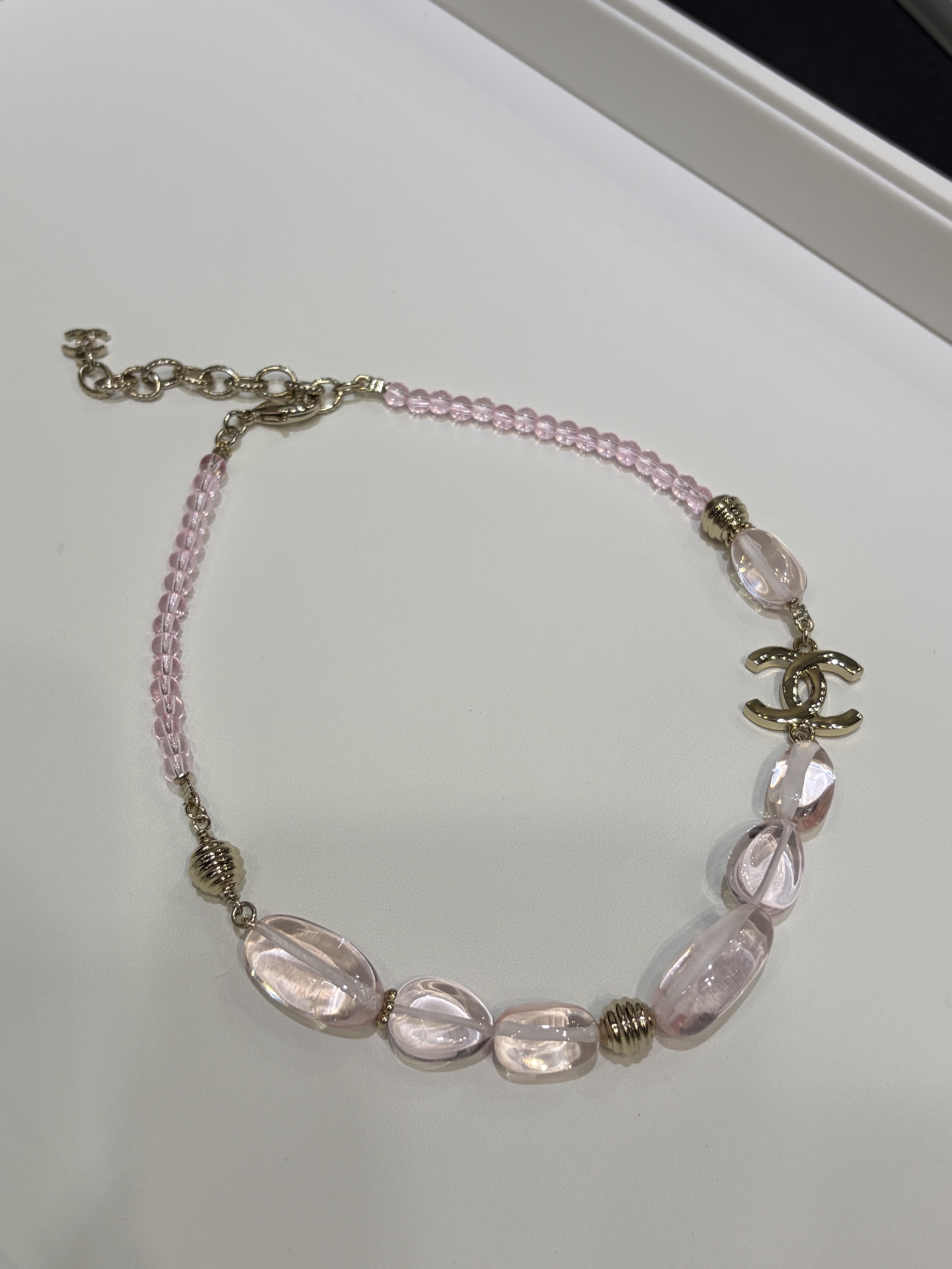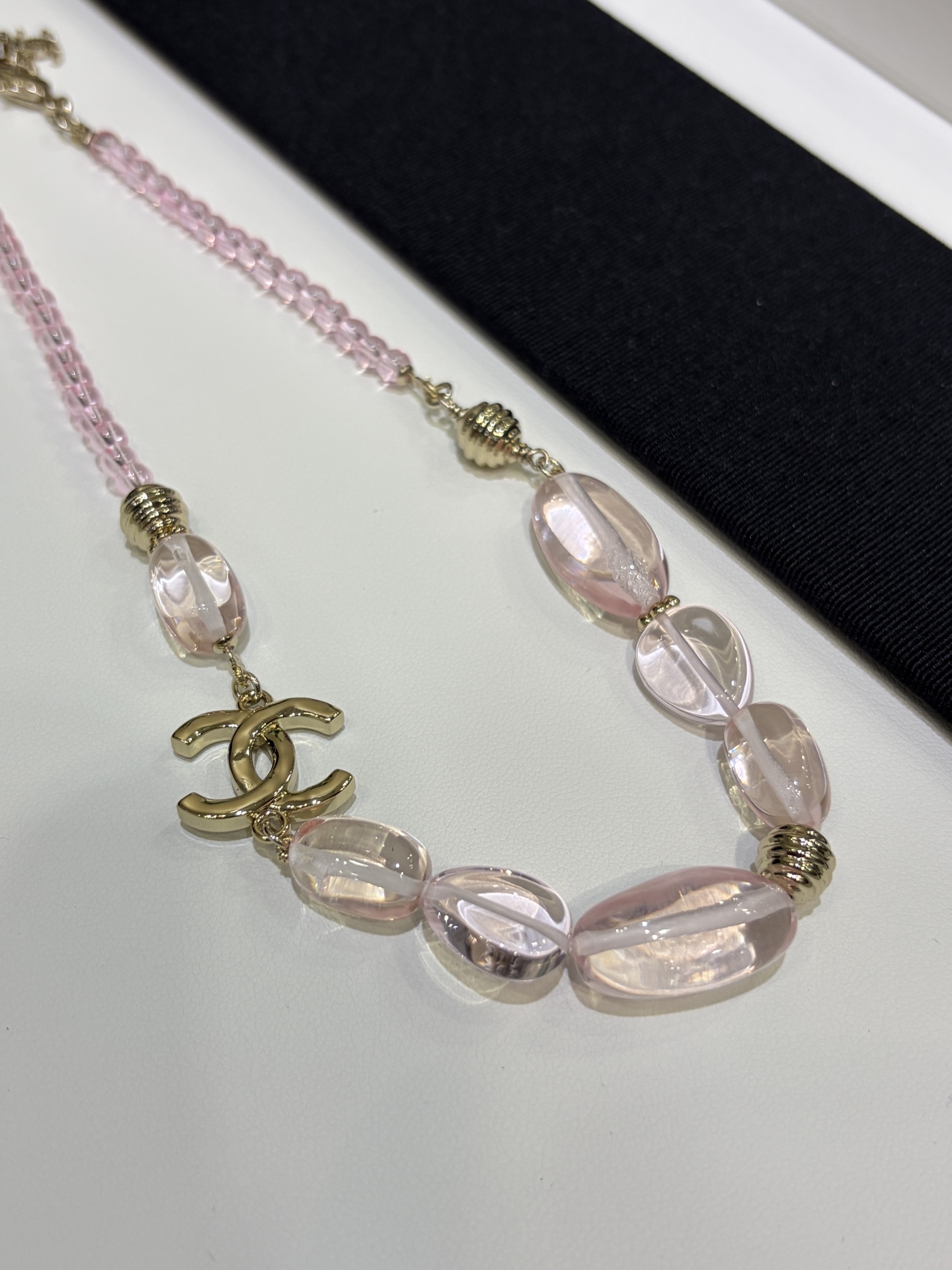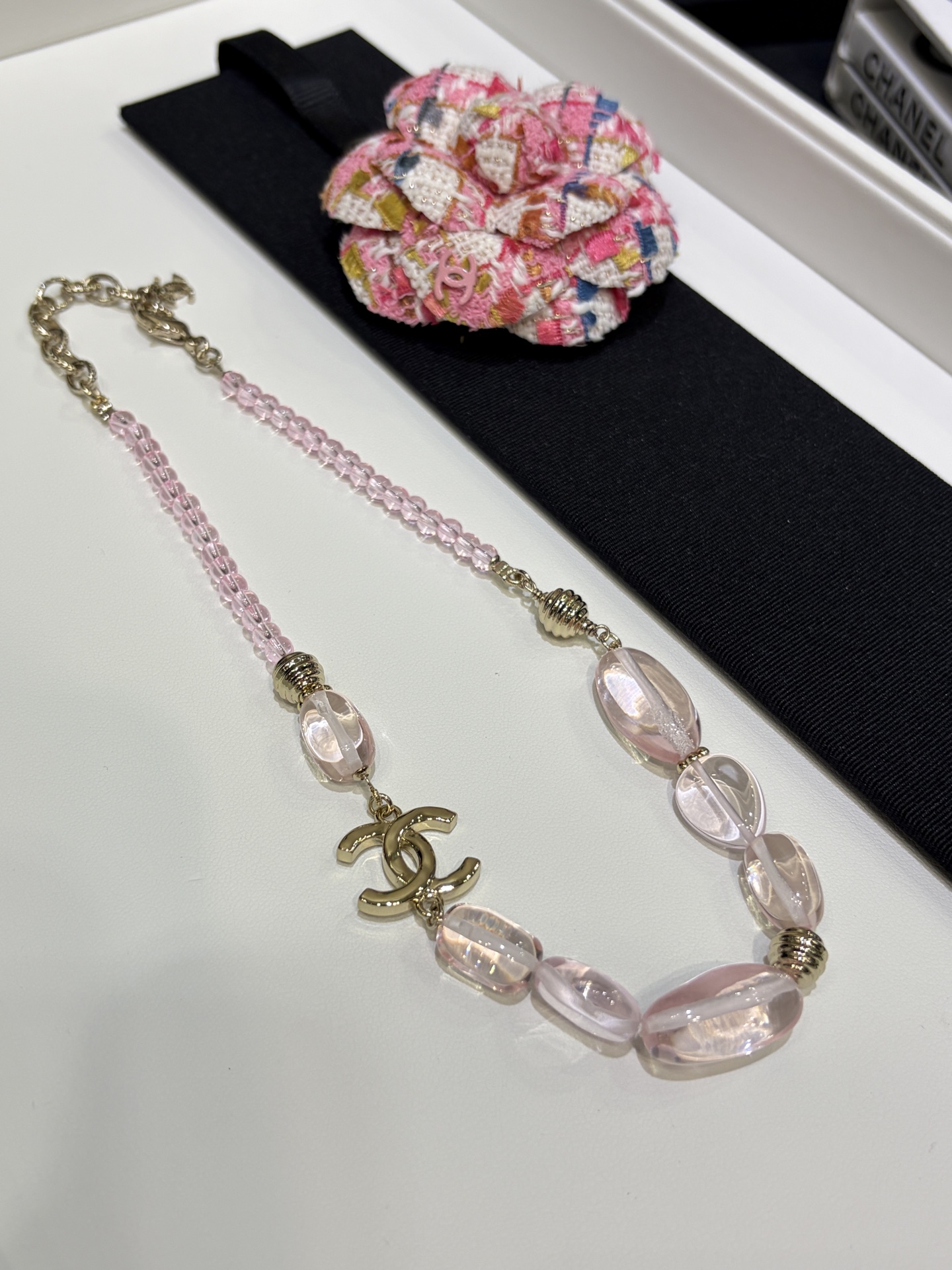 Изысканное колье сочетает в себе утончённую лёгкость и выразительную текстуру, характерные для аксессуаров Chanel. Оно привлекает взгляд благородным золотистым оттенком, в который мягко вписываются нежные розовые акценты, создавая ощущение лёгкого сияния и элегантного блеска.