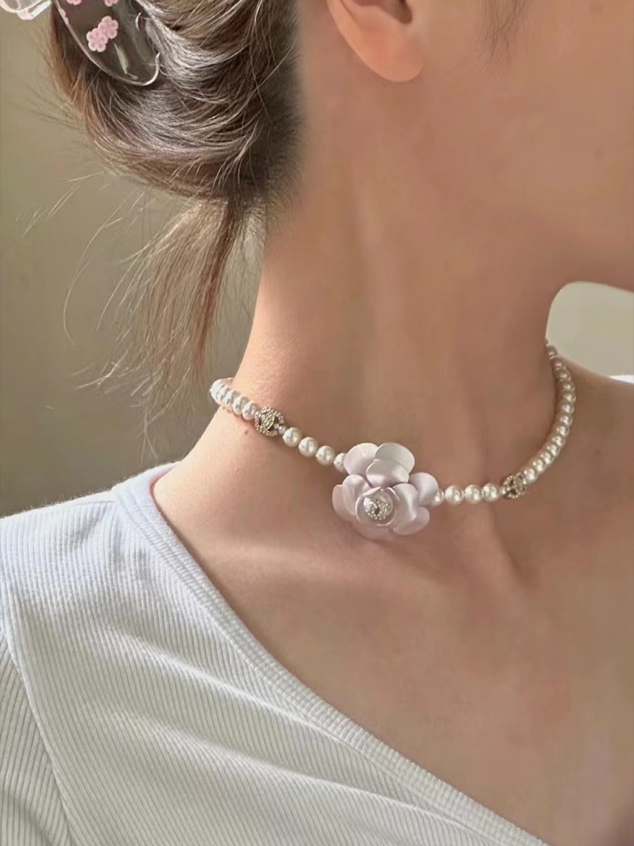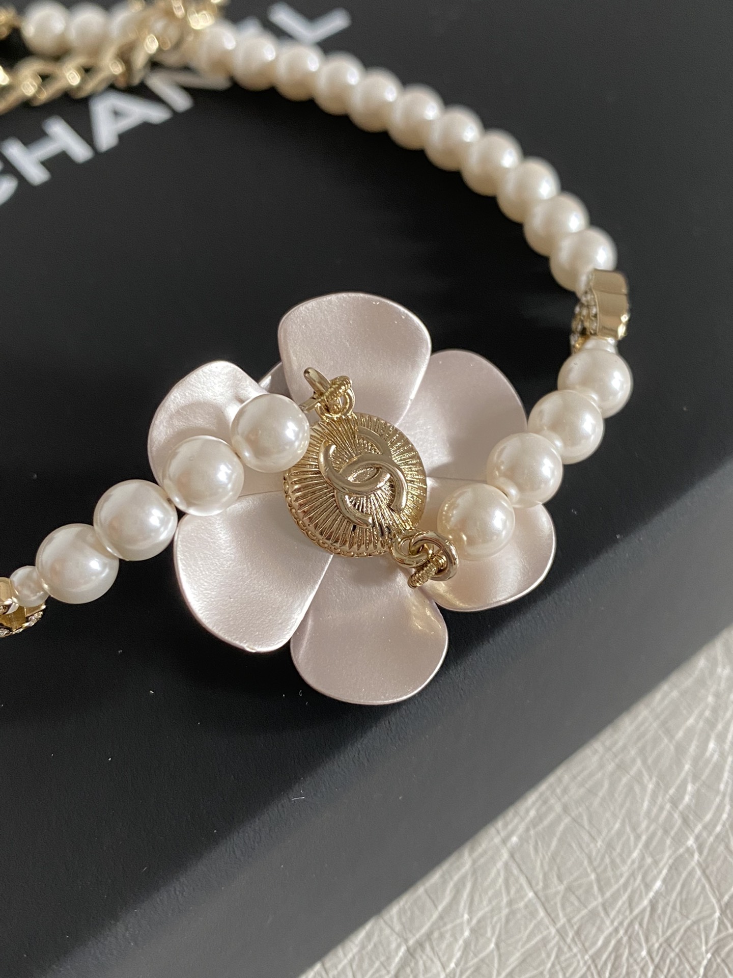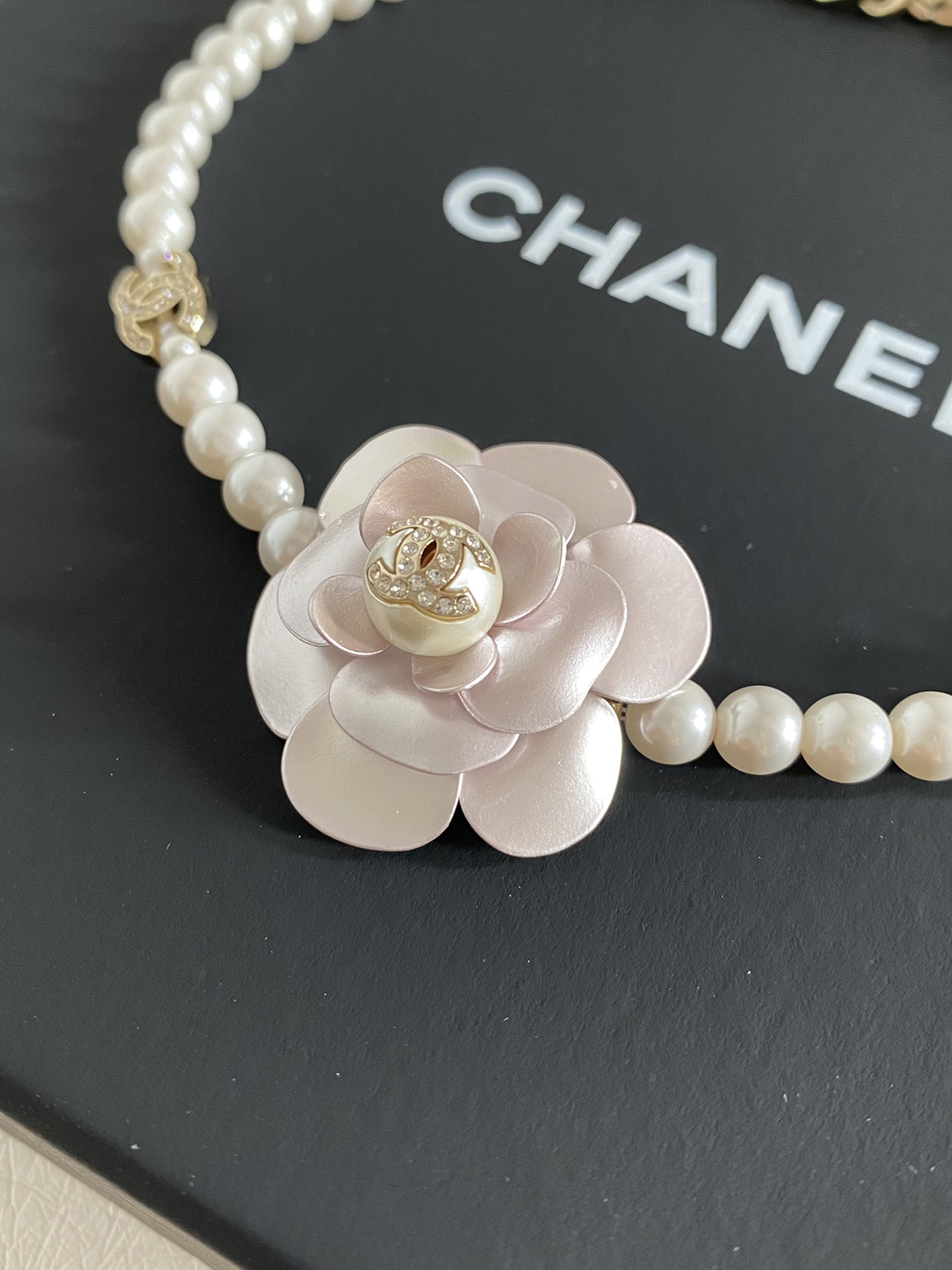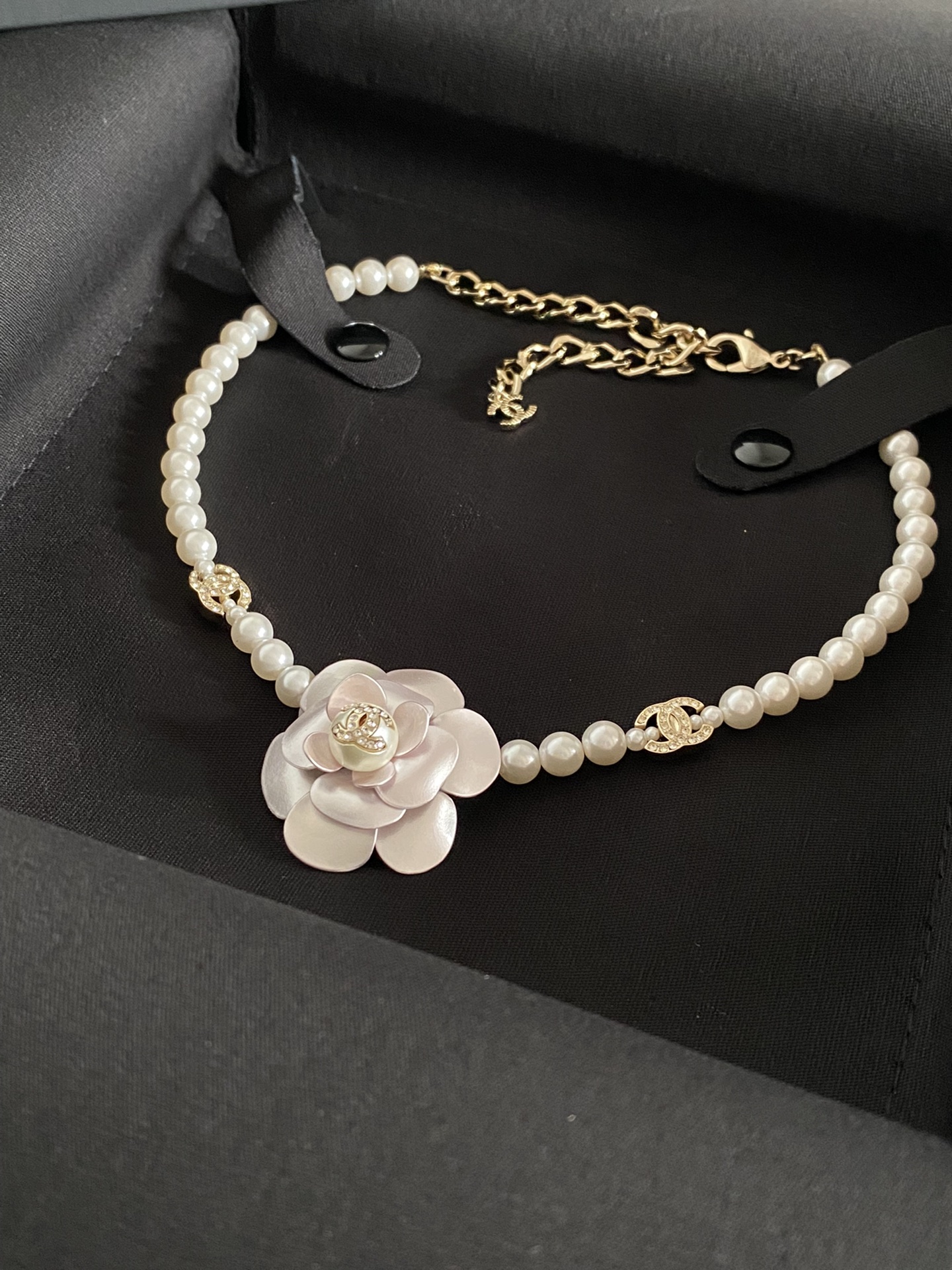 • Камелия: Культовый символ CHANEL, камелия, изготавливается из высококачественного материала, который имитирует текстуру настоящих цветов. Она расположена в центре колье и служит ярким акцентом.