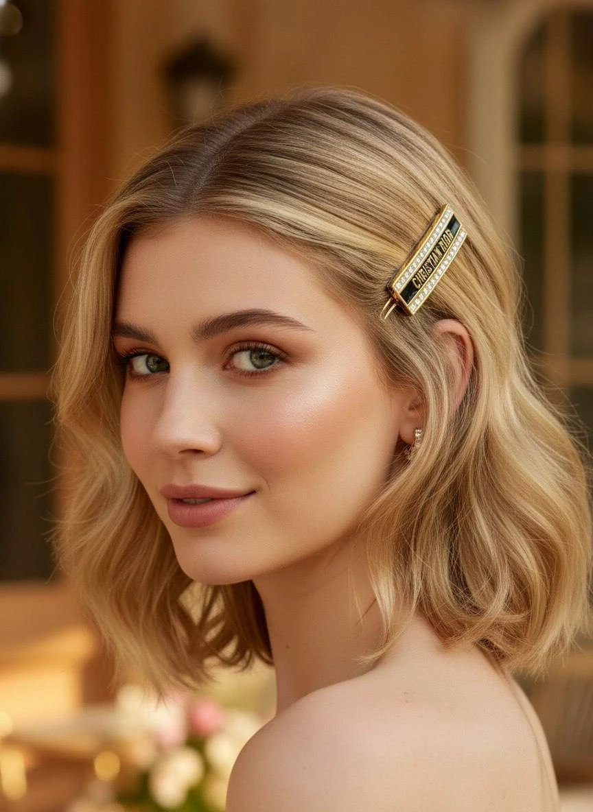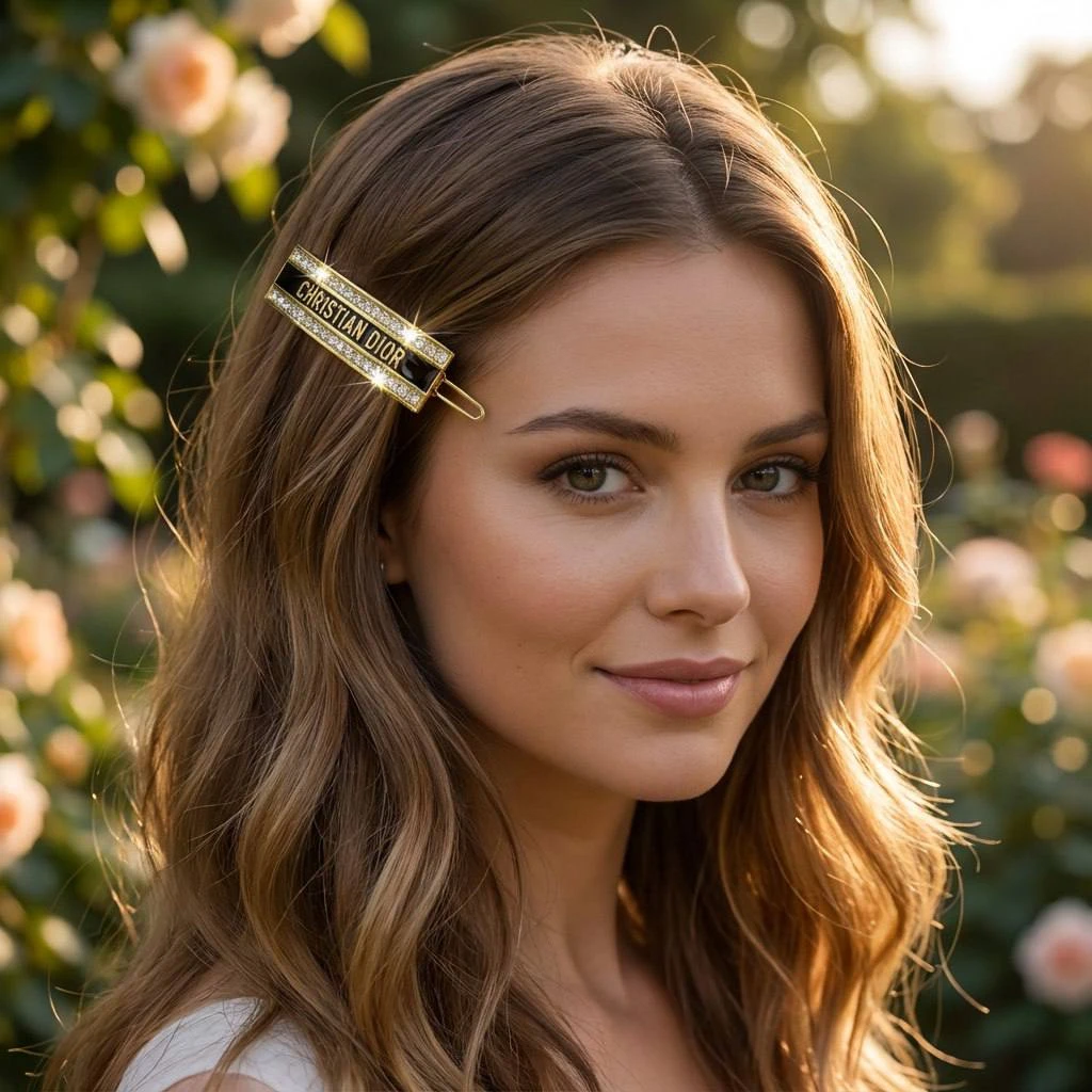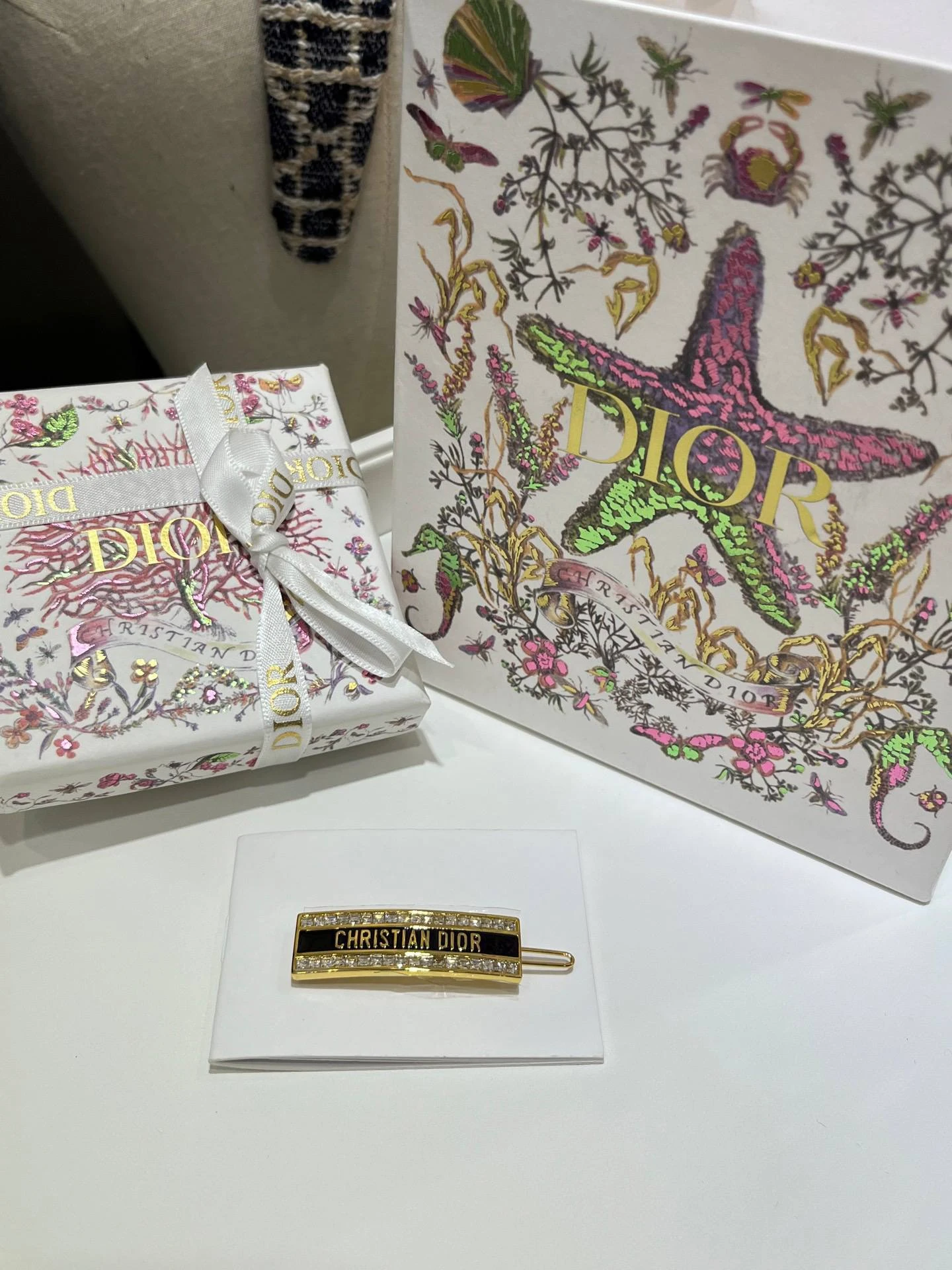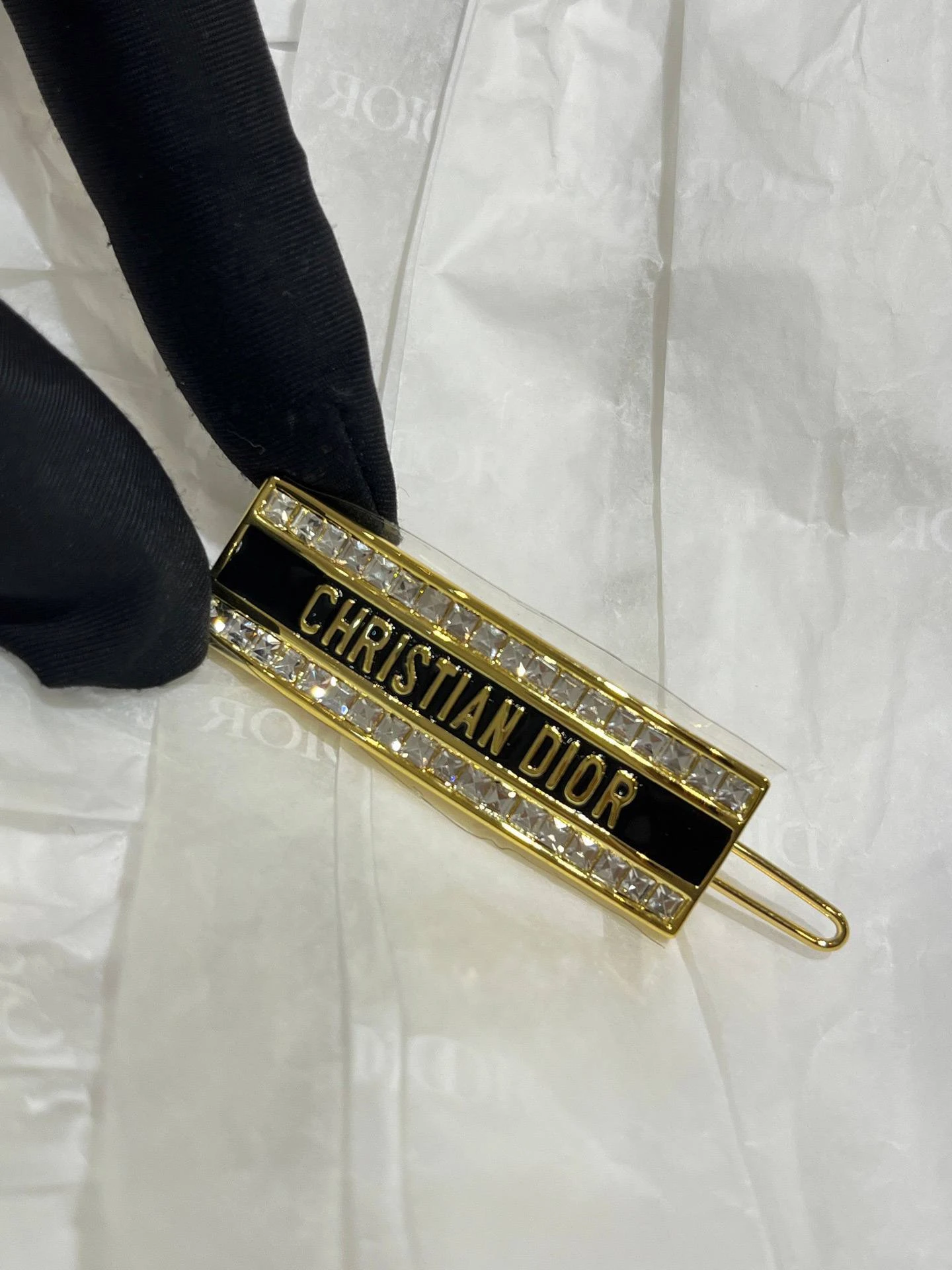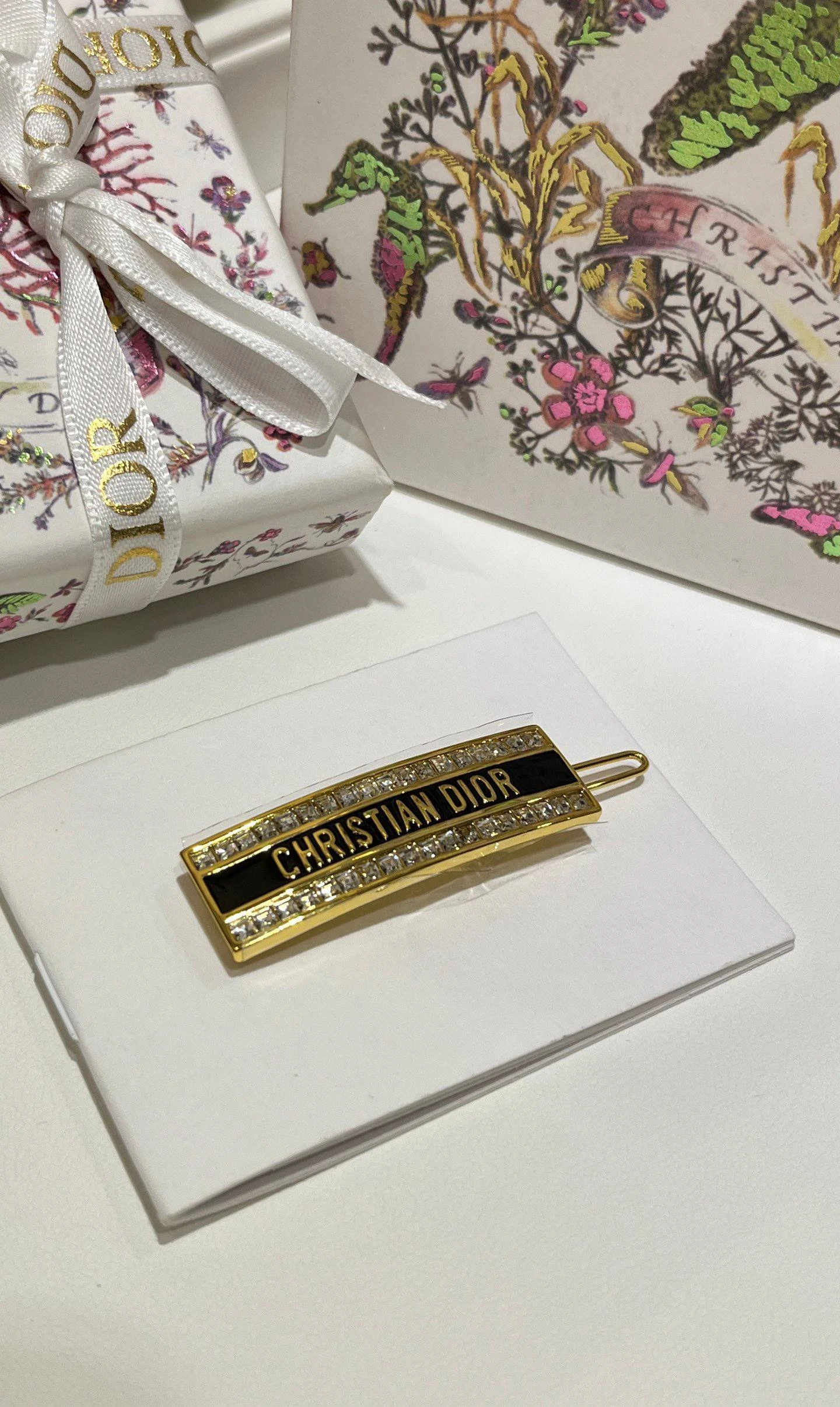 Изысканная заколка‑зажим с выразительным логотипом CHRISTIAN DIOR: золотистый корпус, черная эмалевая вставка и блестящая окантовка из камней Swarovski. Элегантный акцент для вечернего образа и повседневной прически.