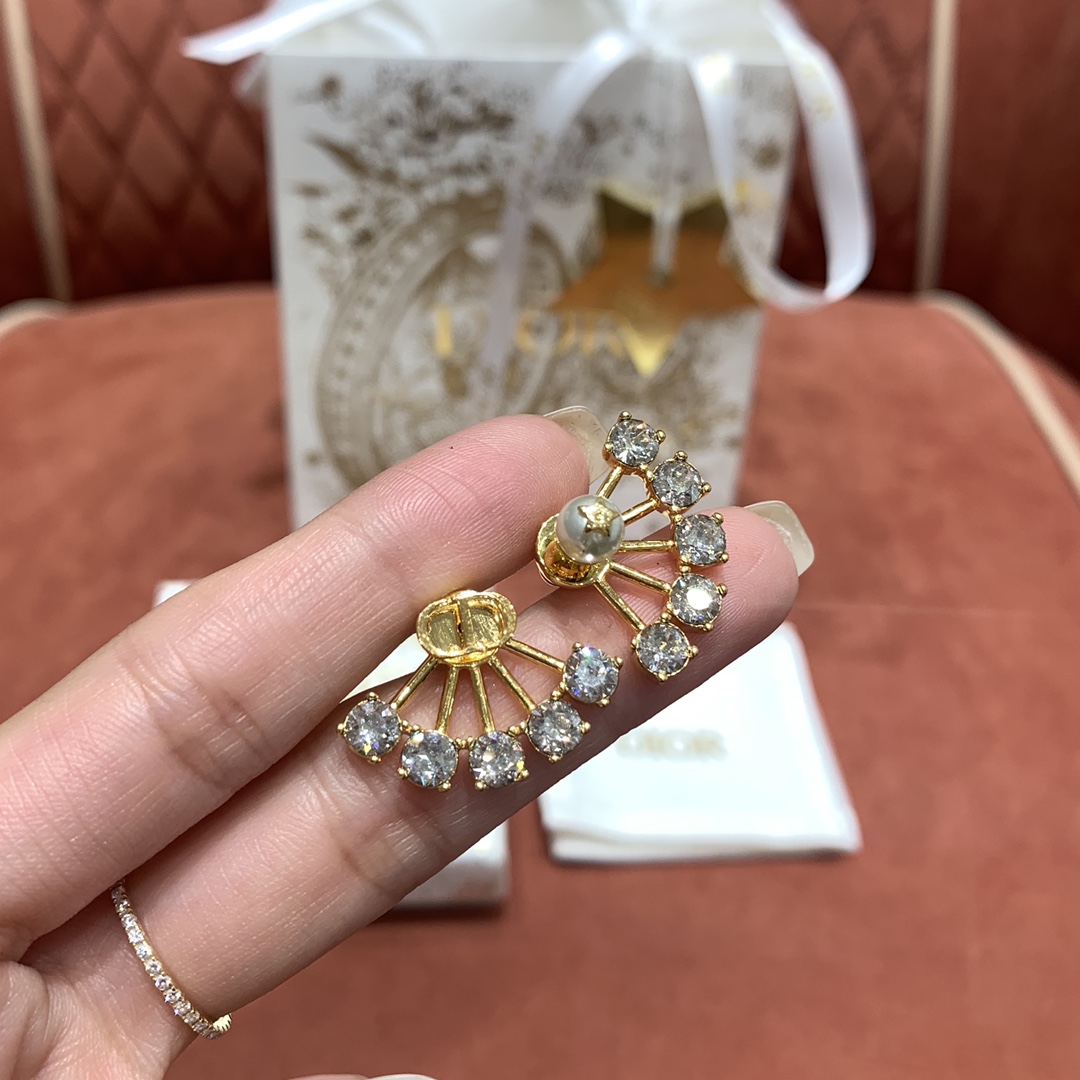 Эффектные женские серьги от CHRISTIAN DIOR в виде мини-веера из сияющих кристаллов на золотистом основании. Современный дизайн: небольшой гвоздик спереди и декоративный веер-накладка с несколькими мерцающими стразами, дополненный жемчужным элементом — идеальный аксессуар для торжеств и вечерних образов.
