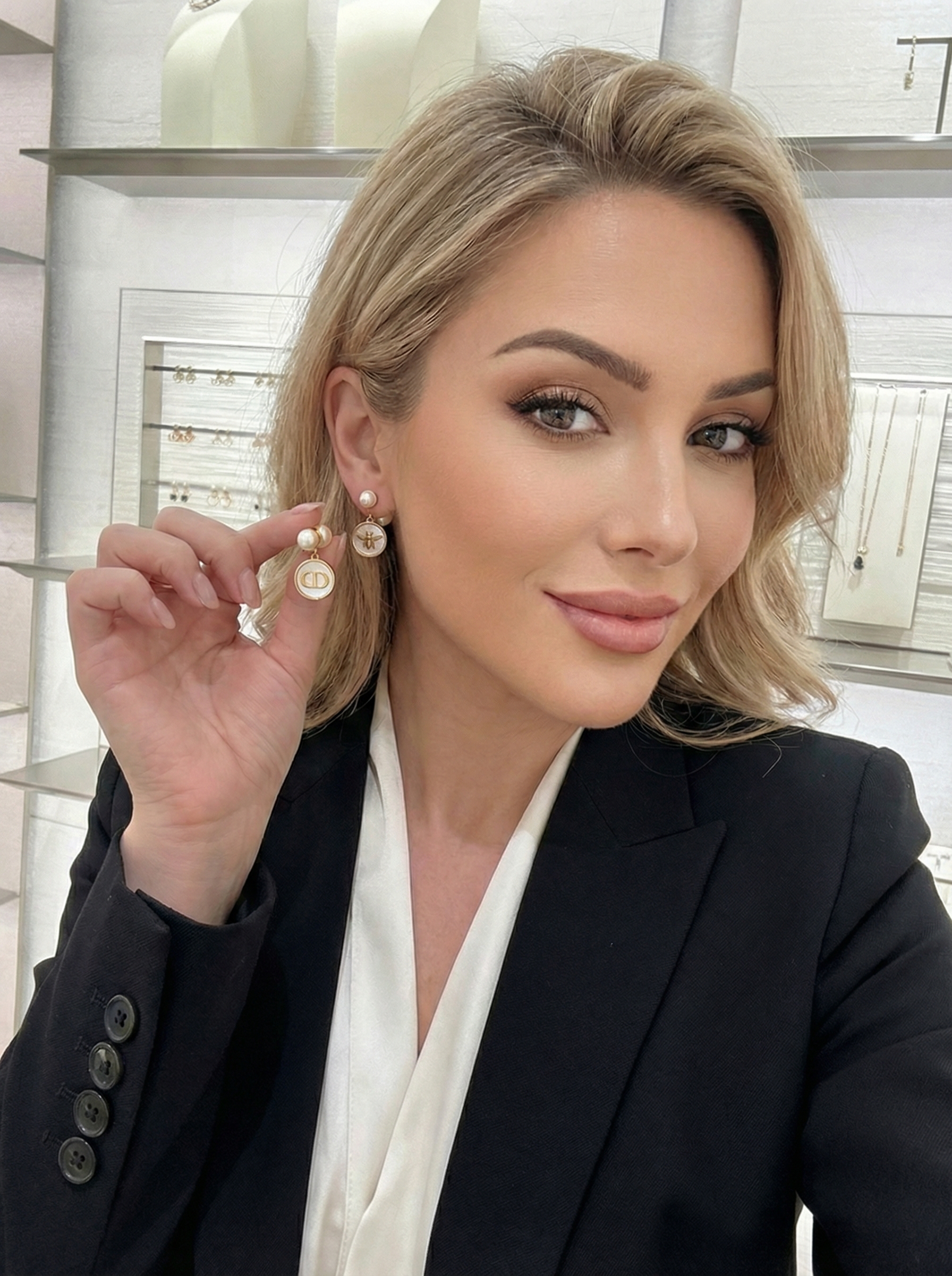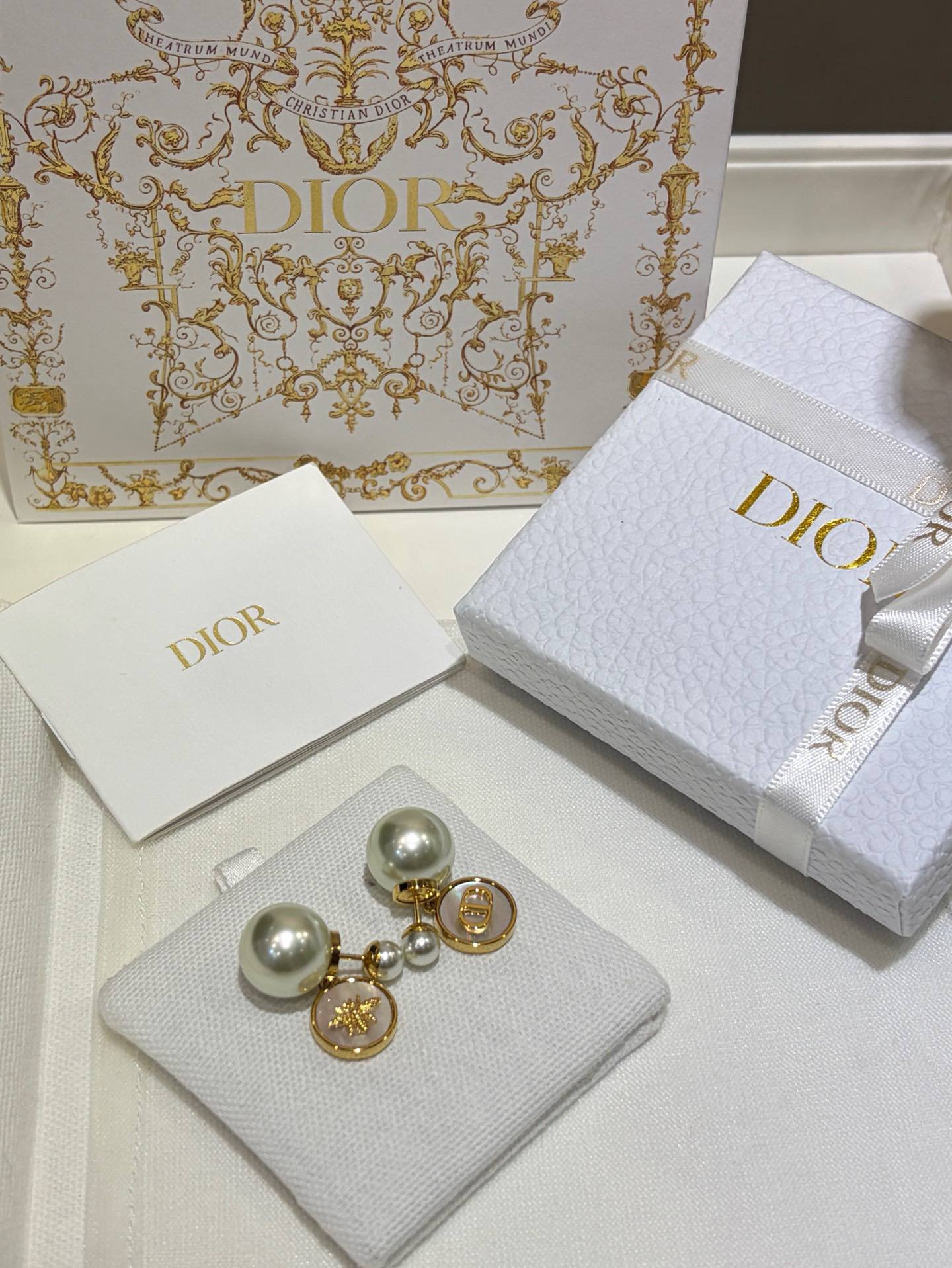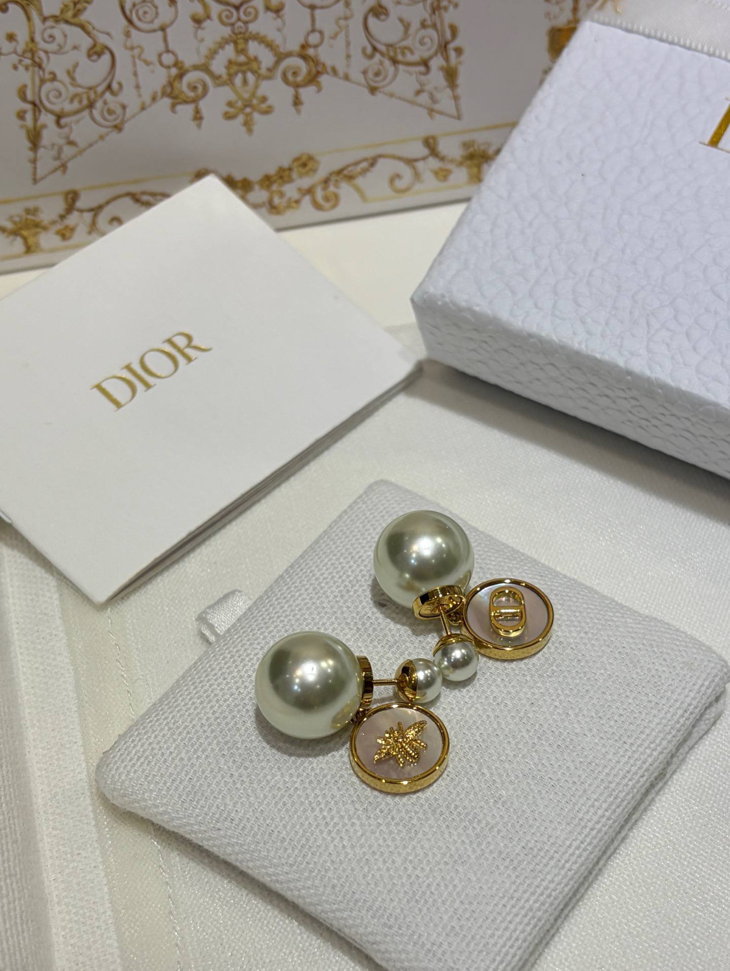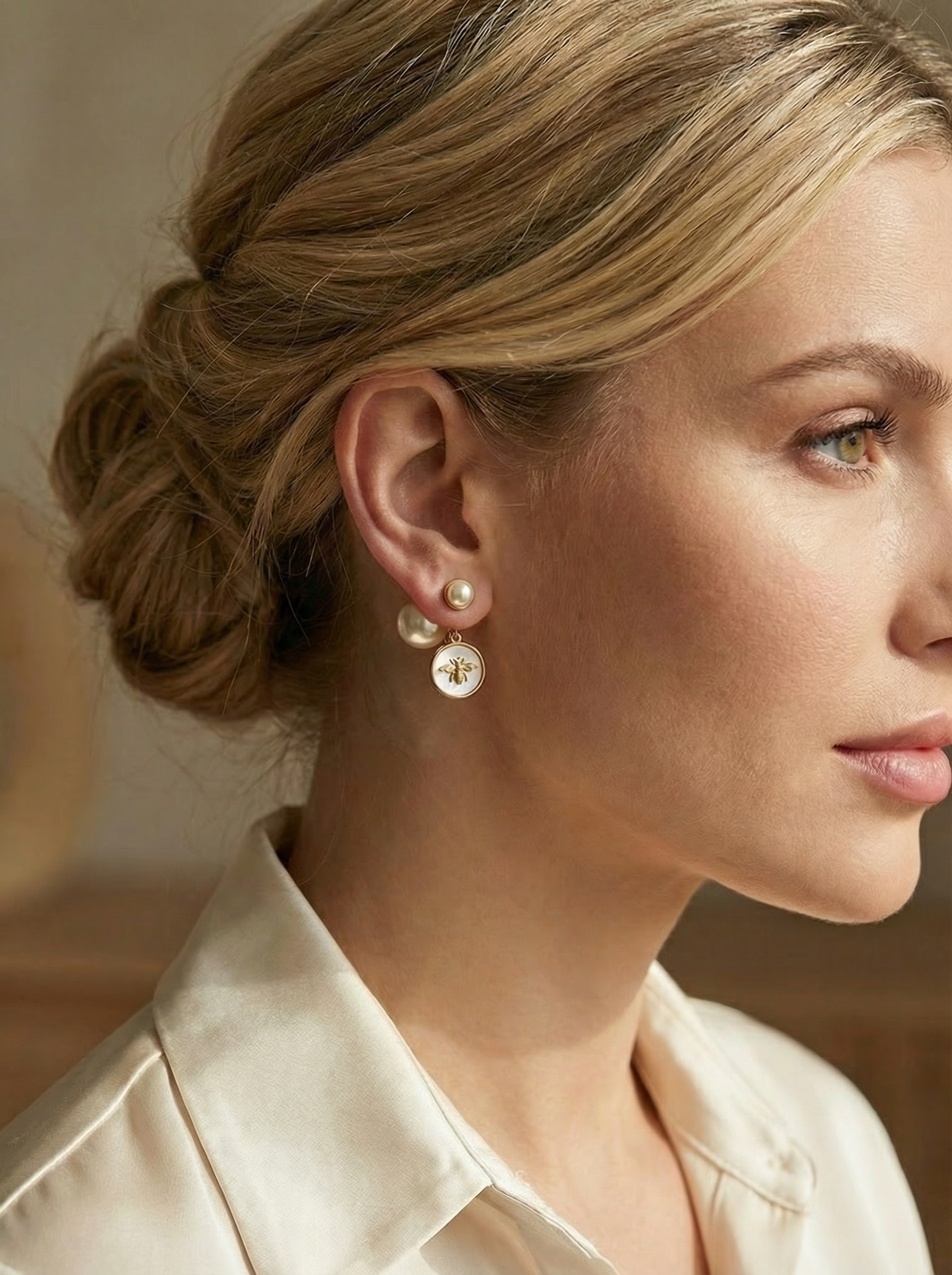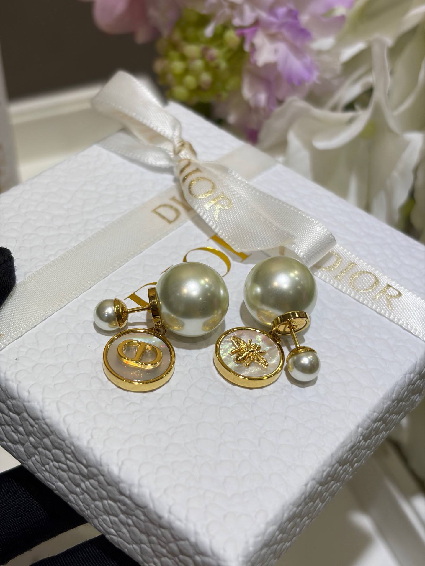 Эти серьги Dior— выразительный аксессуар, в котором сочетаются винтажная элегантность и современный декор. Конструкция «двухсторонних» гвоздиков: с одной стороны — крупная жемчужина, с другой — меньшая жемчужина, дополненная двумя подвесками на тонких колечках. Подвески выполнены в золотистом тоне с нежной эмалью (розовый/персиковый оттенок) — на одной виден декоративный мотив в виде пчелы, на другой — фирменный знак. Благородная цветовая гамма и блеск жемчуга делают серьги универсальными для дневных и вечерних образов.