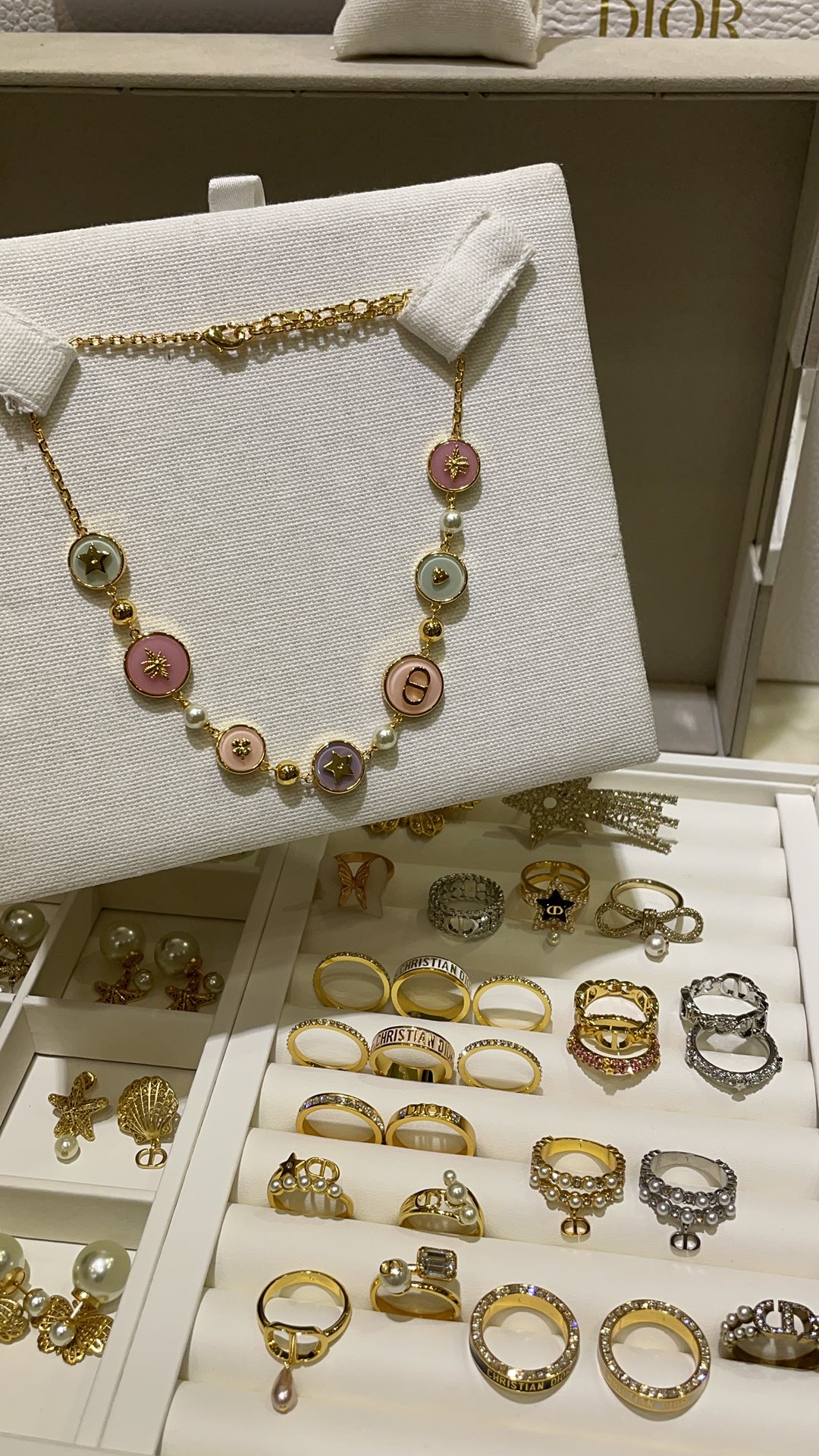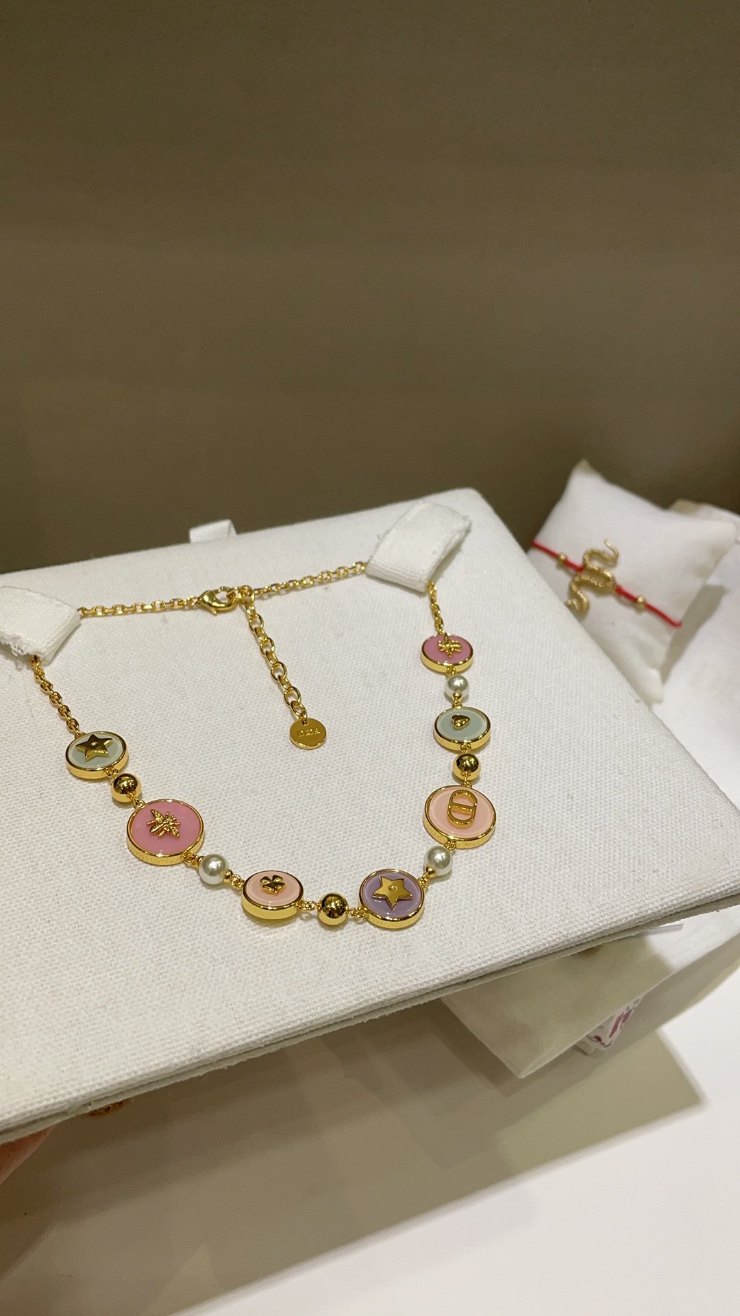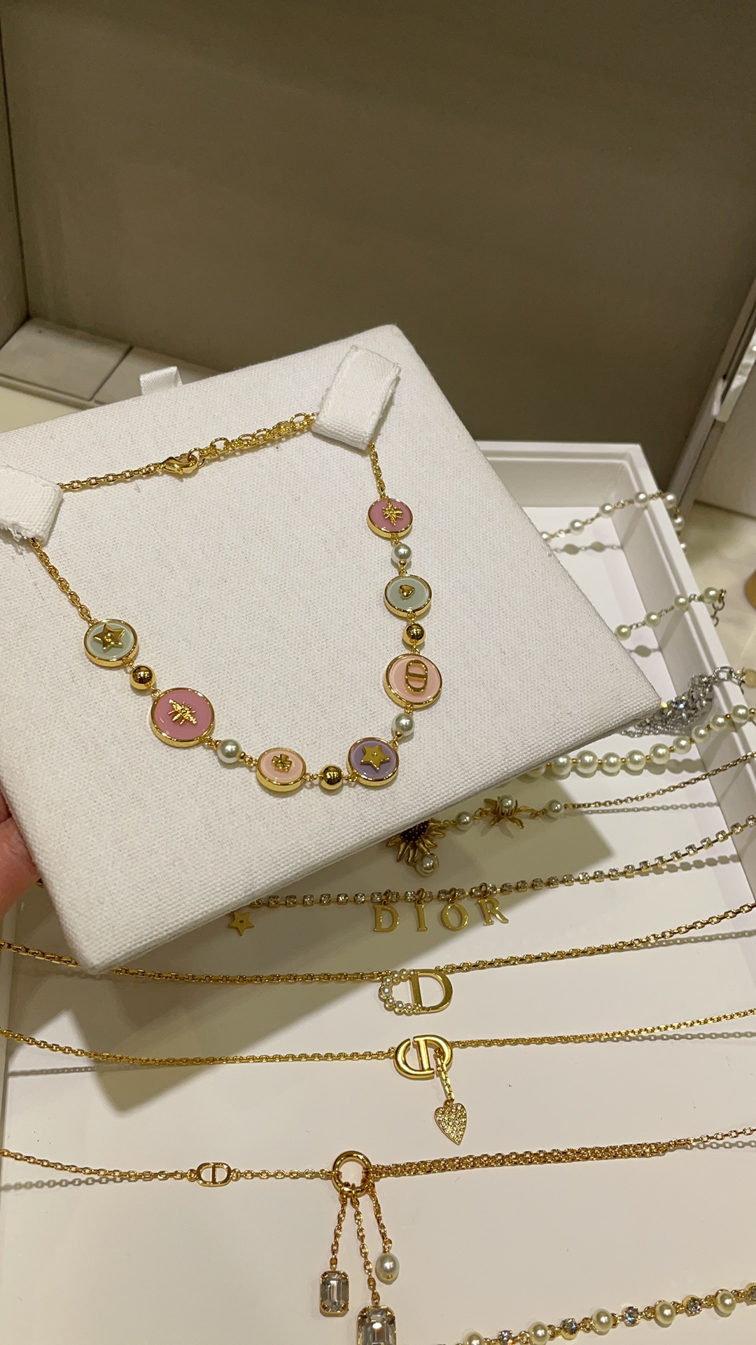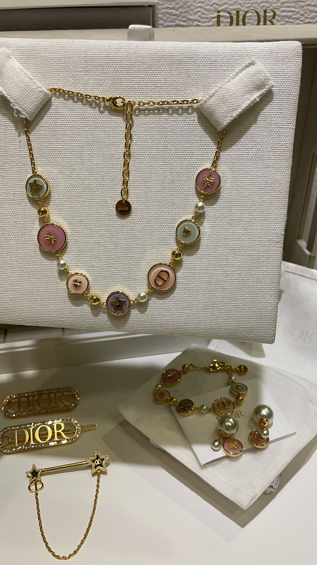 Колье Dior из латуни и эмали с фирменными символами Dior - пчелой и звездой.